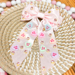 A soft and flirty hair bow designed to add a pop of color and charm to any hairstyle. Light pink satin with conversation heart and rhinestone accents makes it a festive favorite.