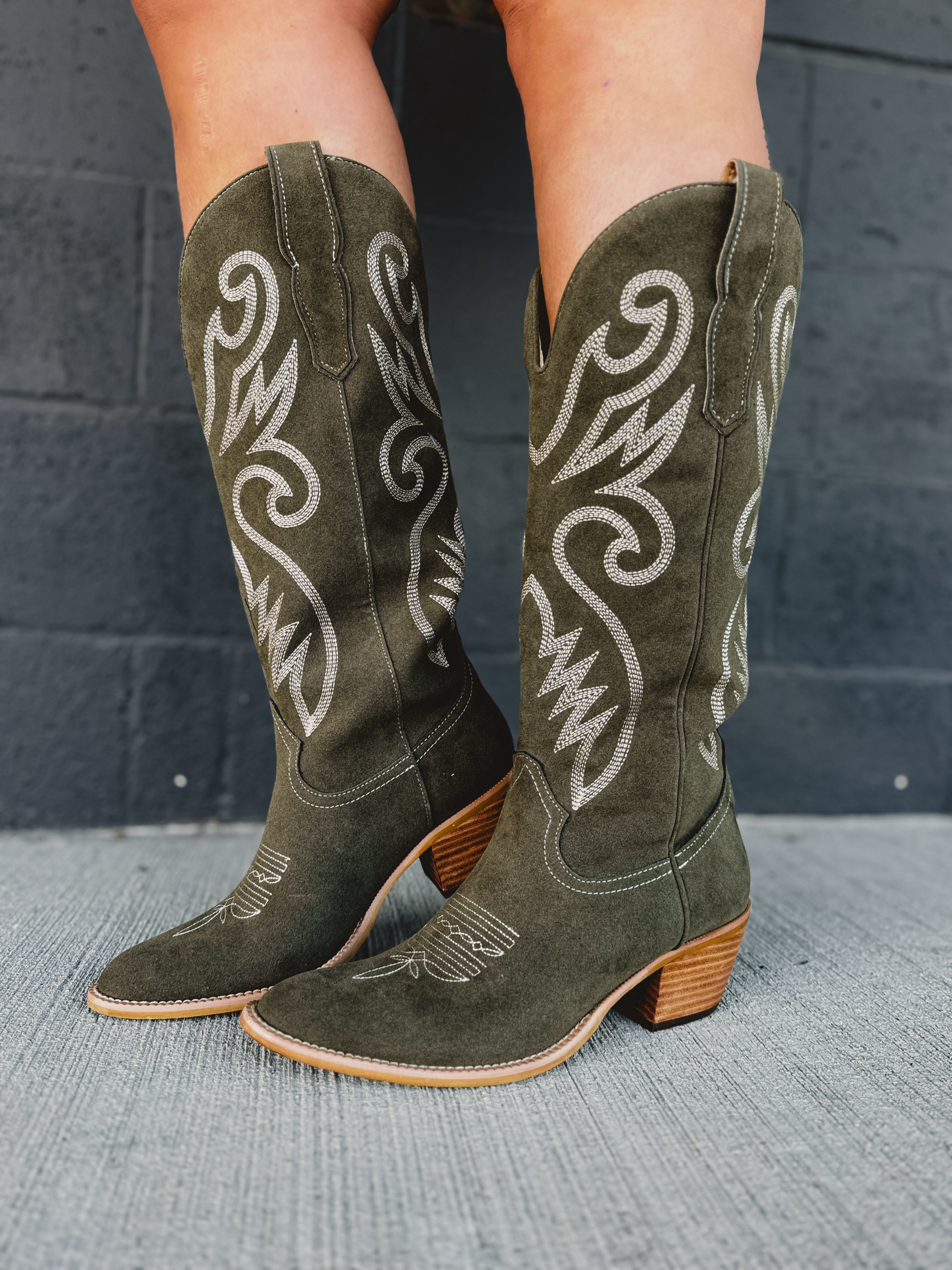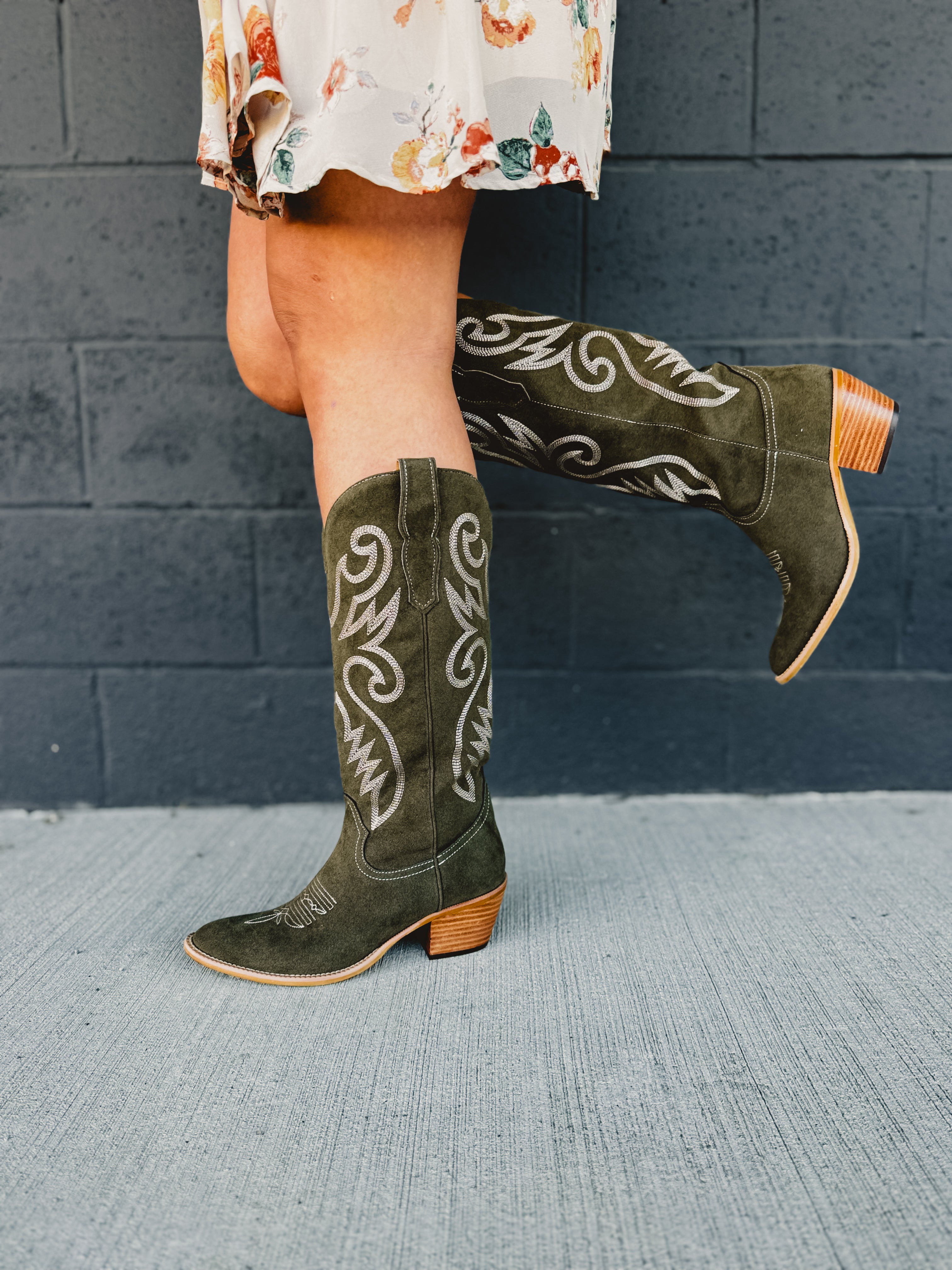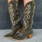 The Artisan Embroidered Western Tall Boots - Olive bring bold western charm with a modern twist. Featuring a tall shaft, pointed toe, and intricate embroidery, these boots make a statement whether you’re headed to a concert, festival, or just want to elevate your everyday look. The rich olive shade adds a unique touch that stands out from classic neutrals, giving your outfits a stylish edge.