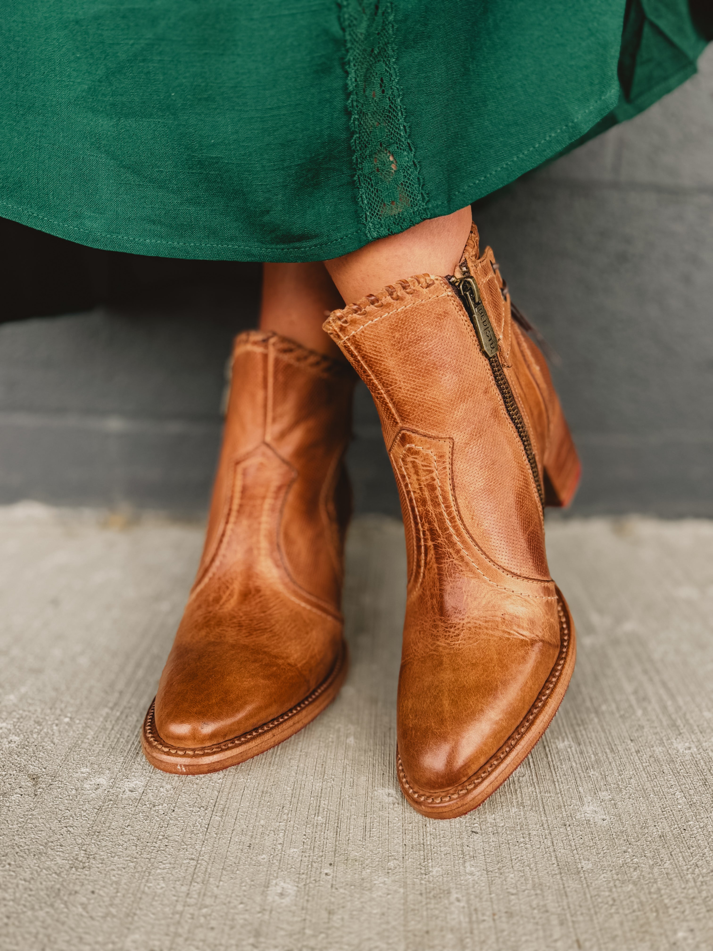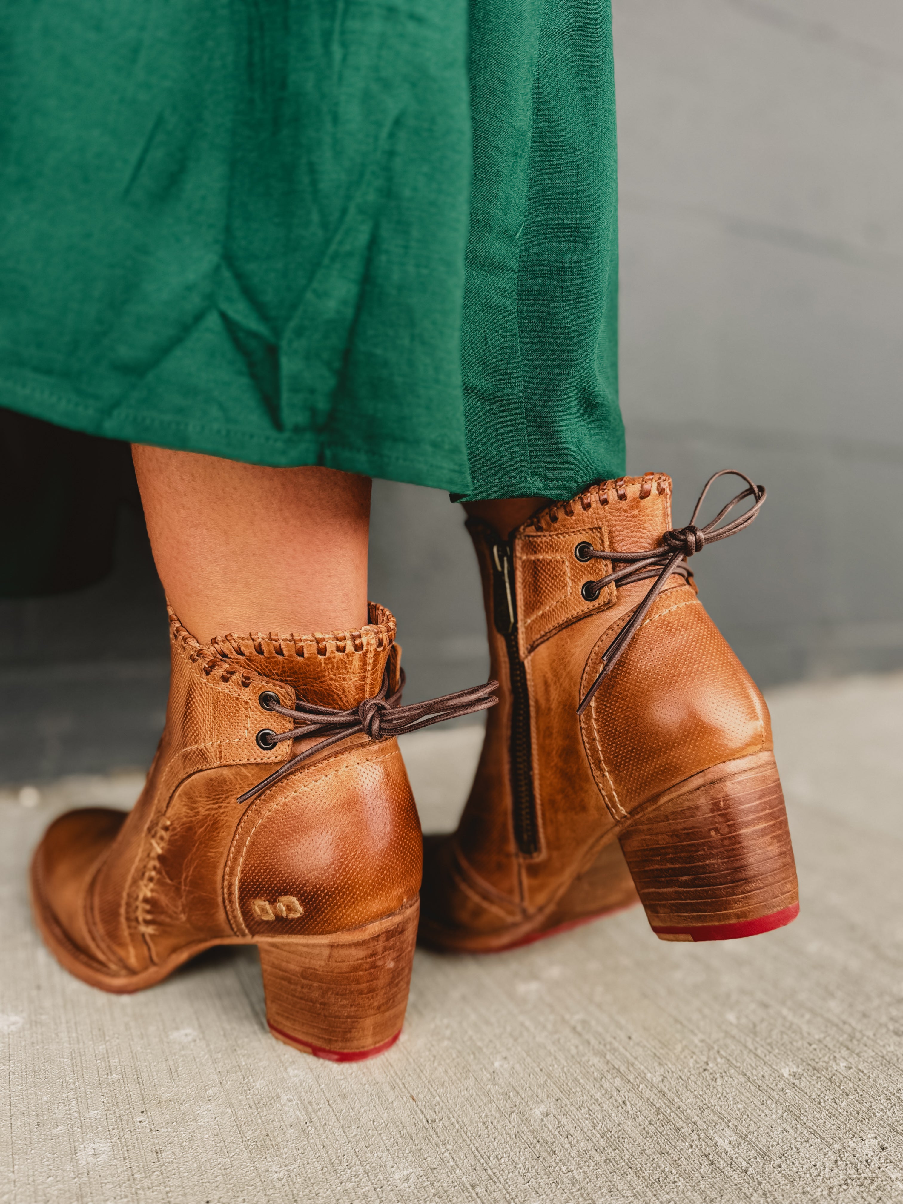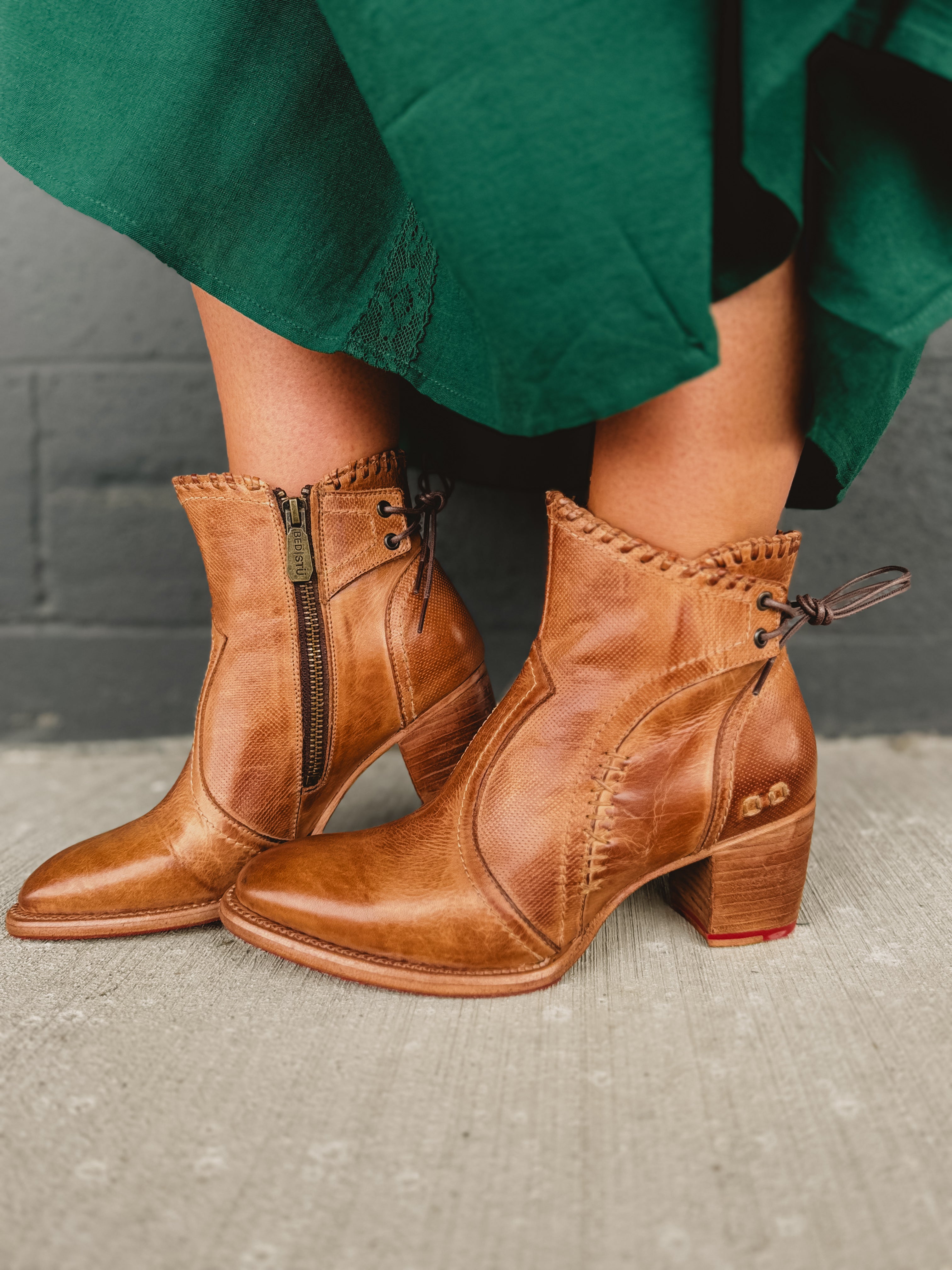 - Feminine ankle boot with topstitched seam accents, decorative back laces and whipstitch finishes