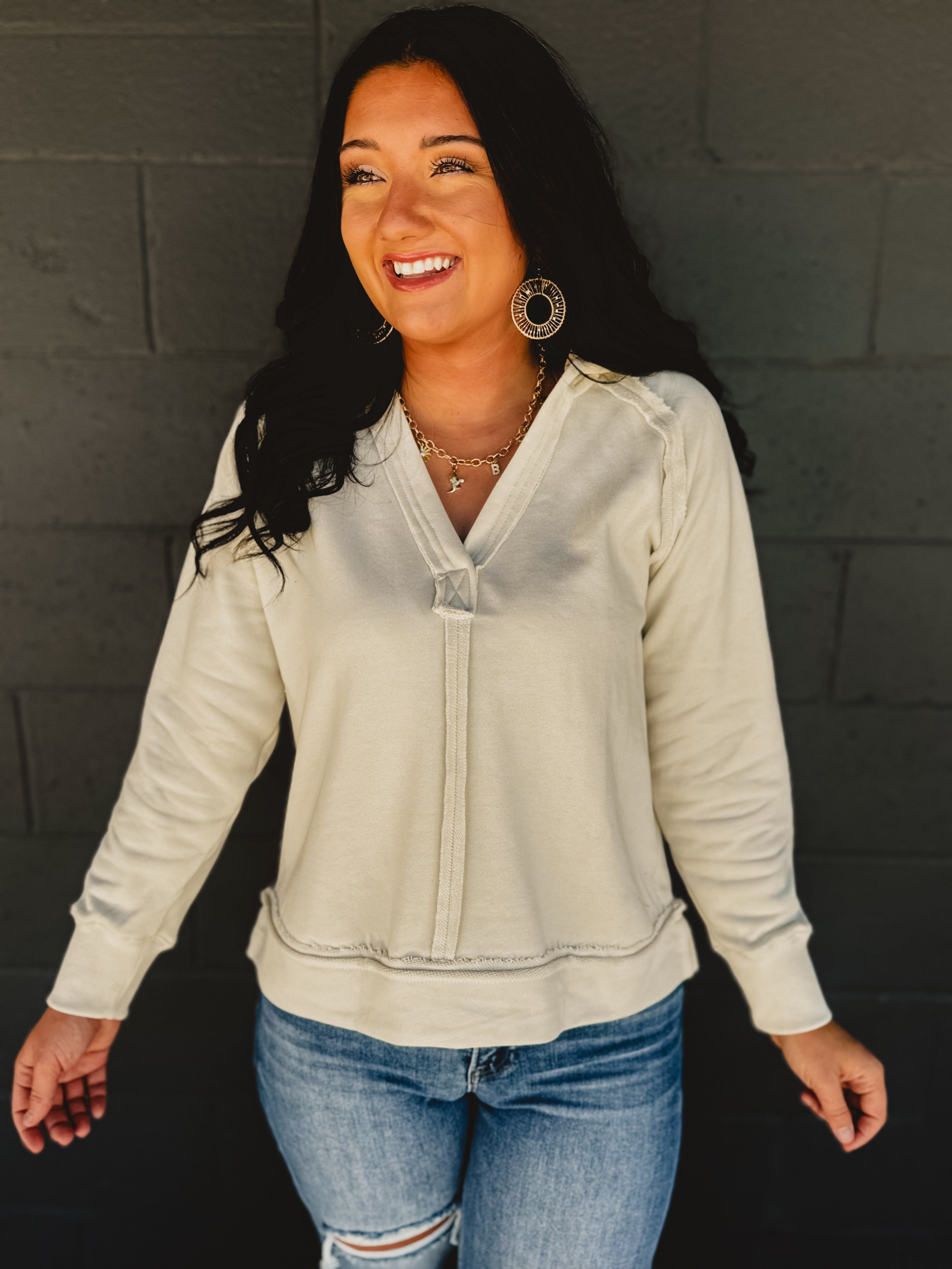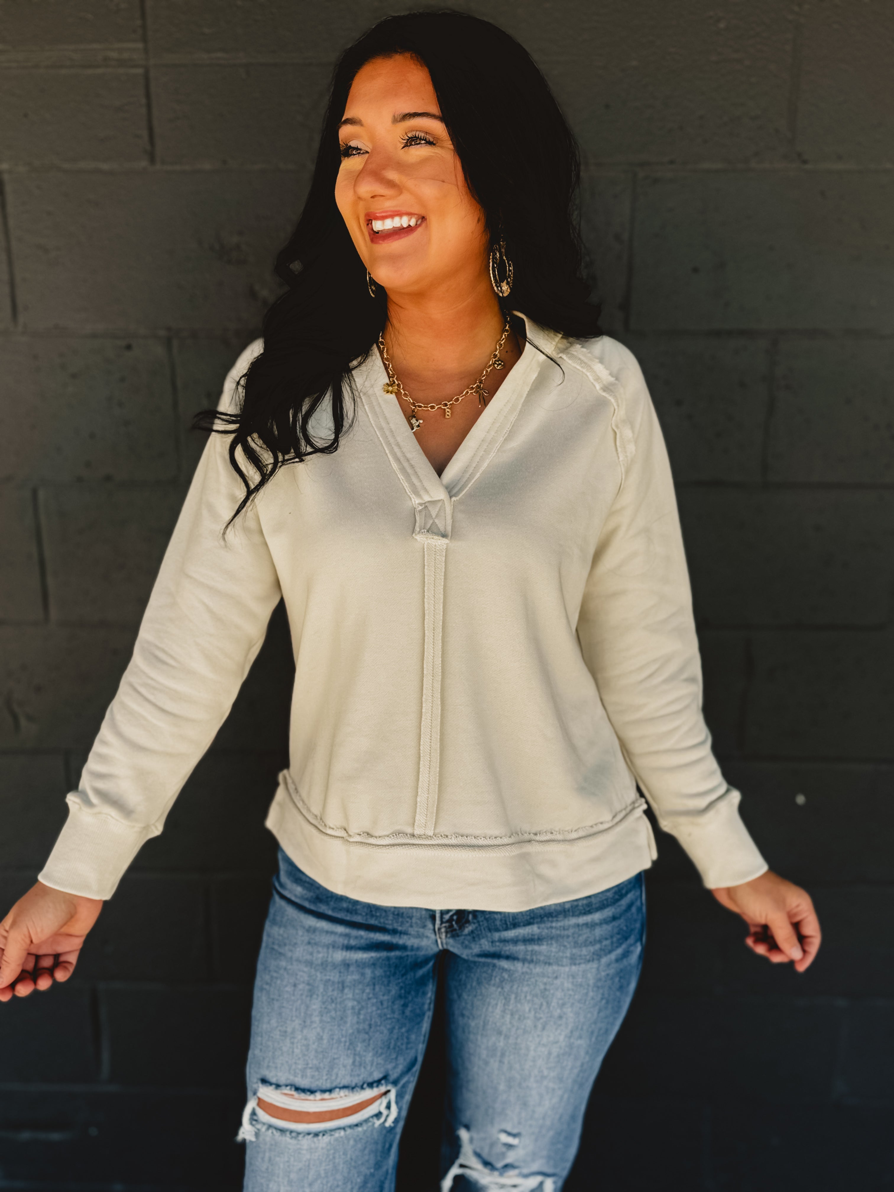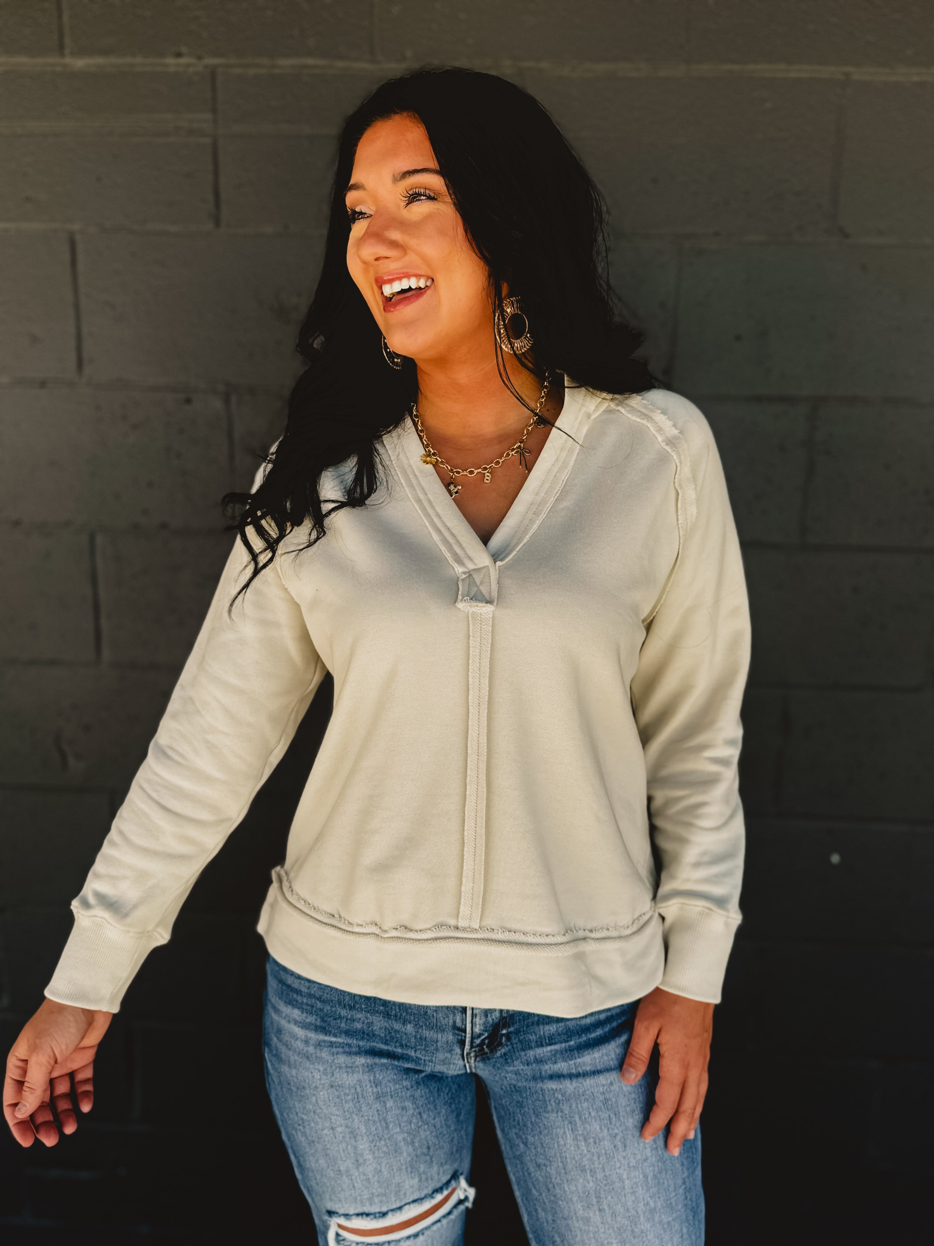 Soft and relaxed, this cream hooded long sleeve top with raw edge detailing is the perfect blend of casual comfort and effortless style.