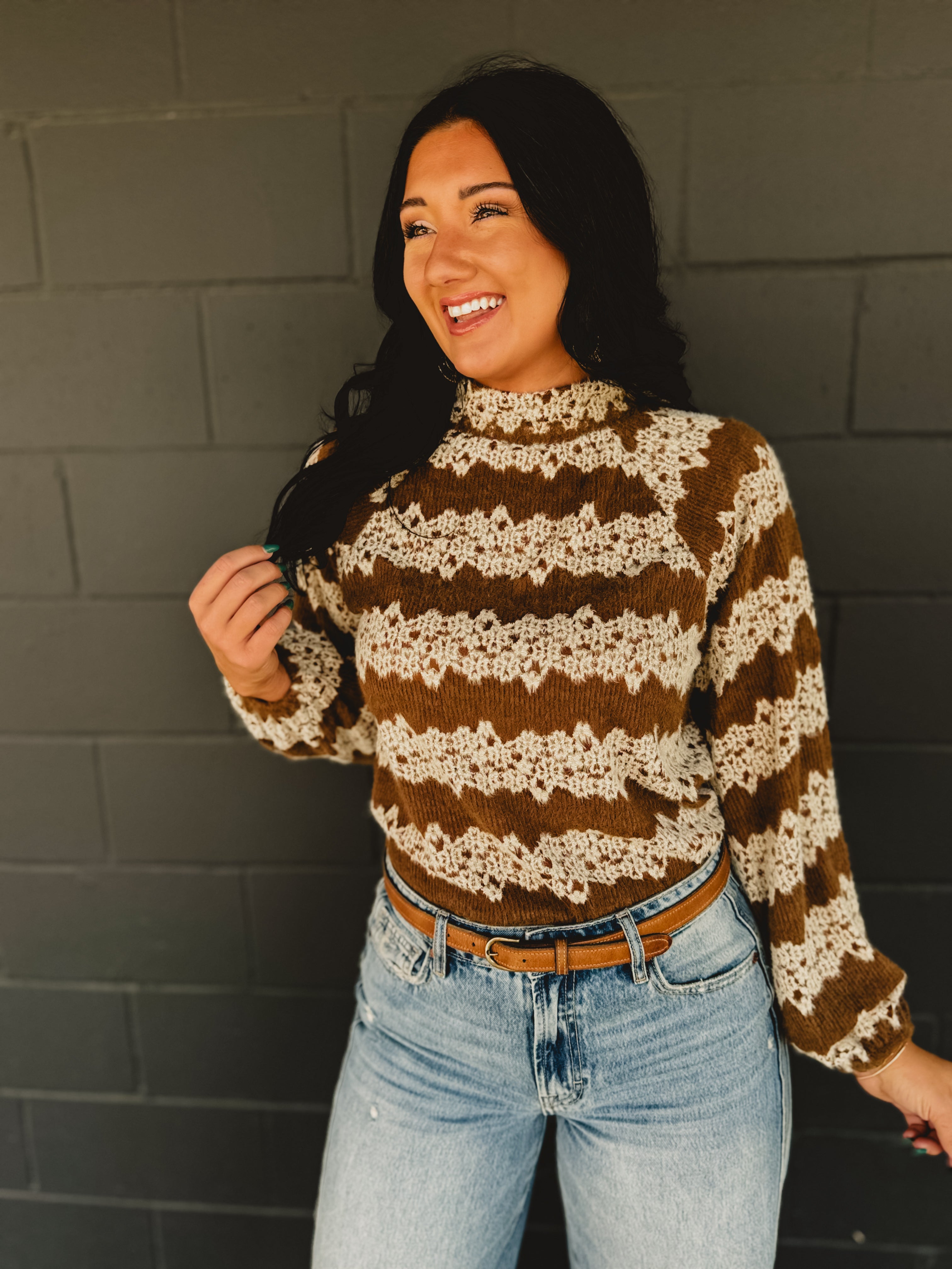 This mocha knit top with striped floral detail and a mock neck design offers a chic, feminine touch for effortless everyday style!