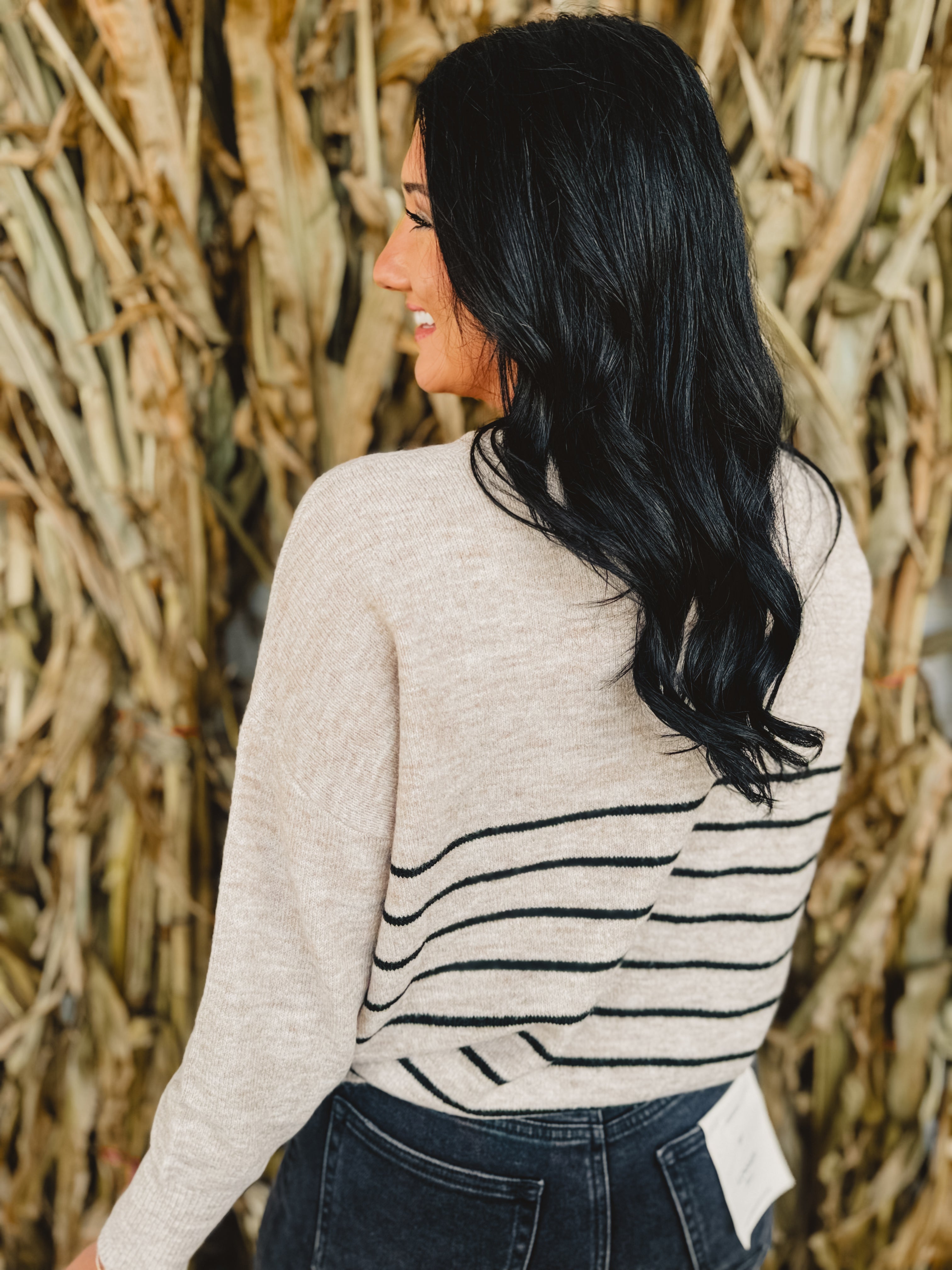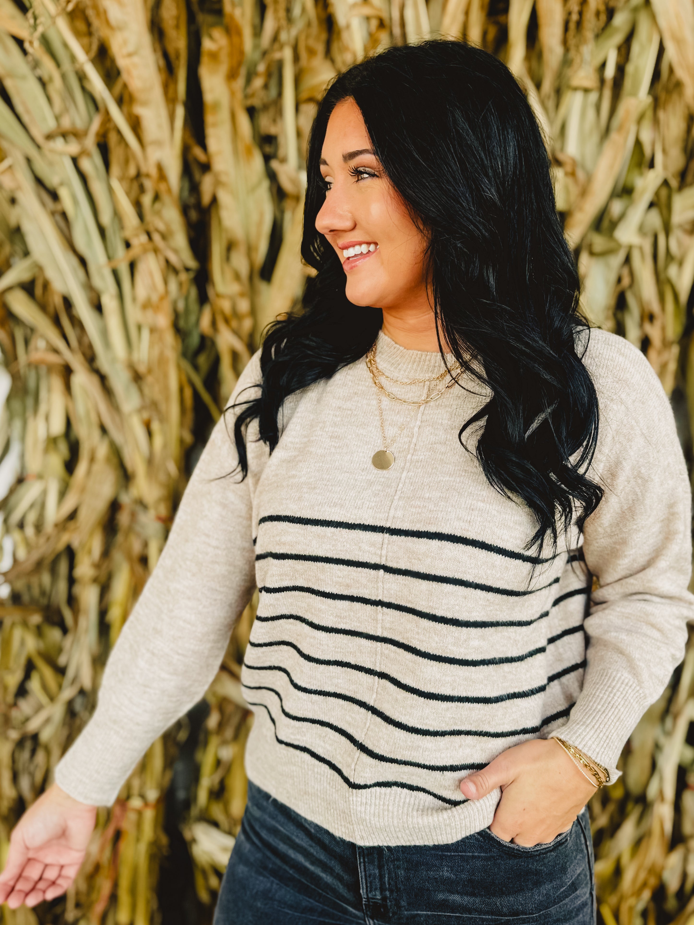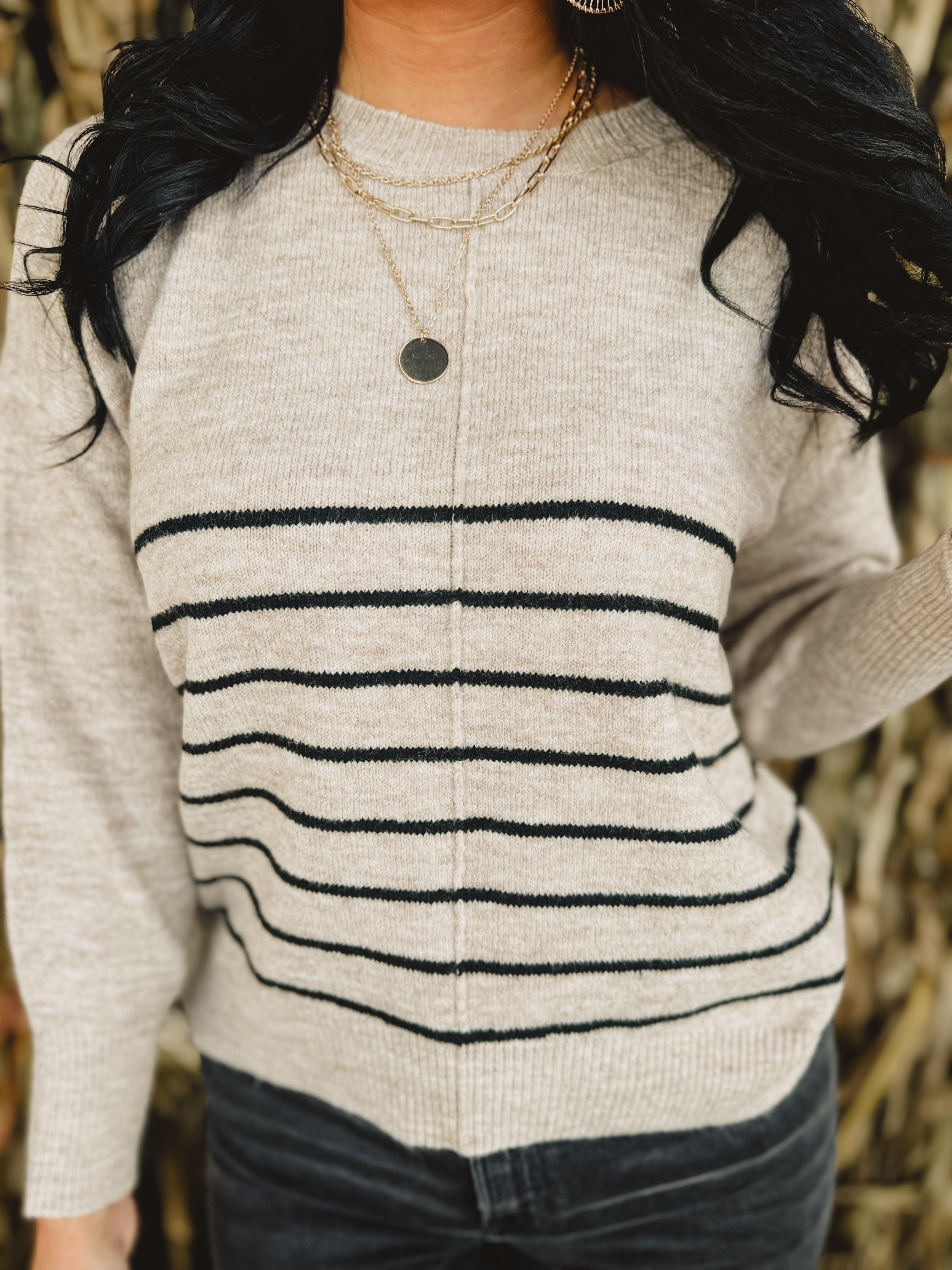 Embrace effortless style with this khaki striped pullover sweater featuring a flattering round neckline, long sleeves, and unique front seam detail, offering a relaxed fit perfect for everyday comfort and chic layering.