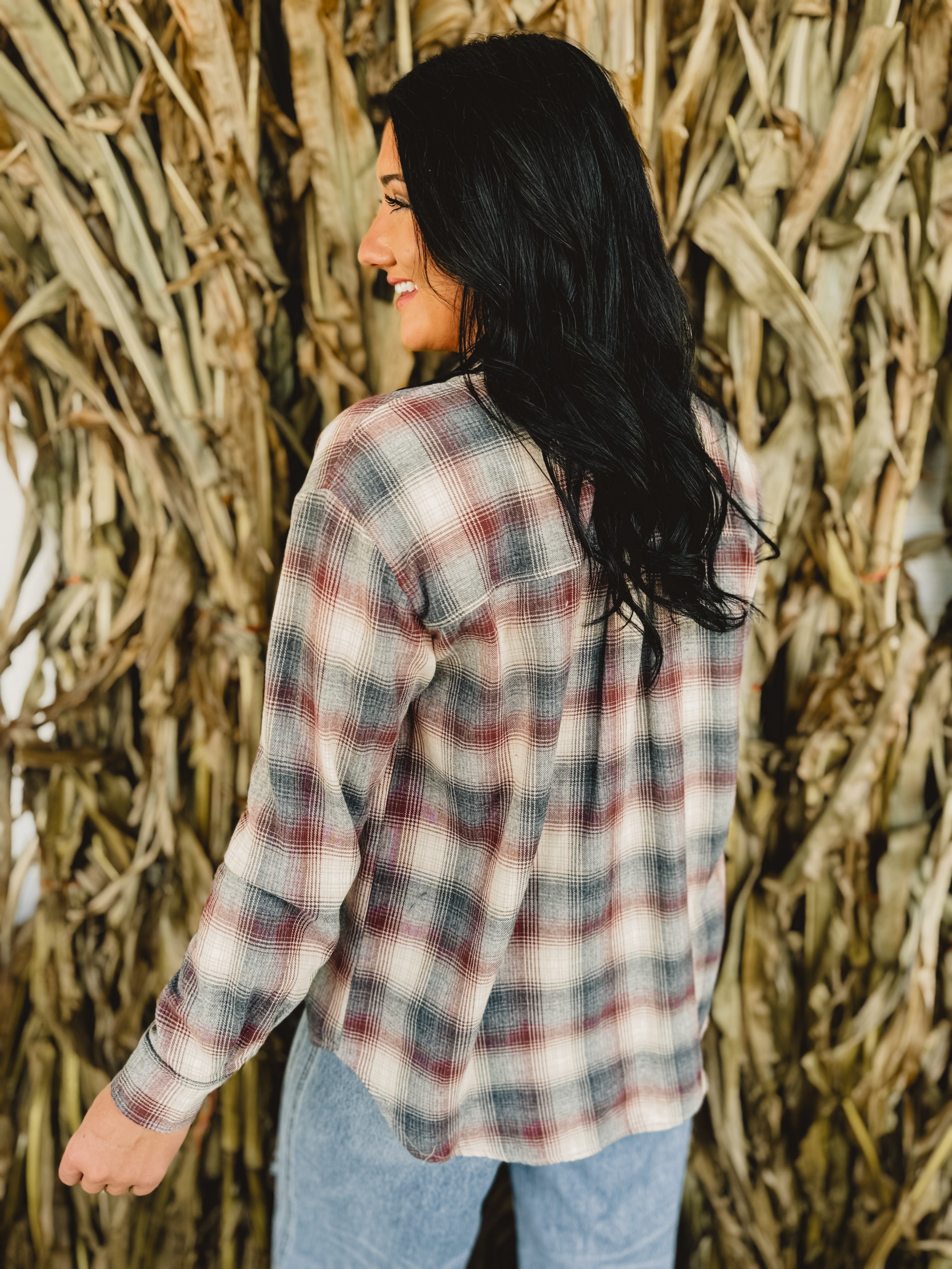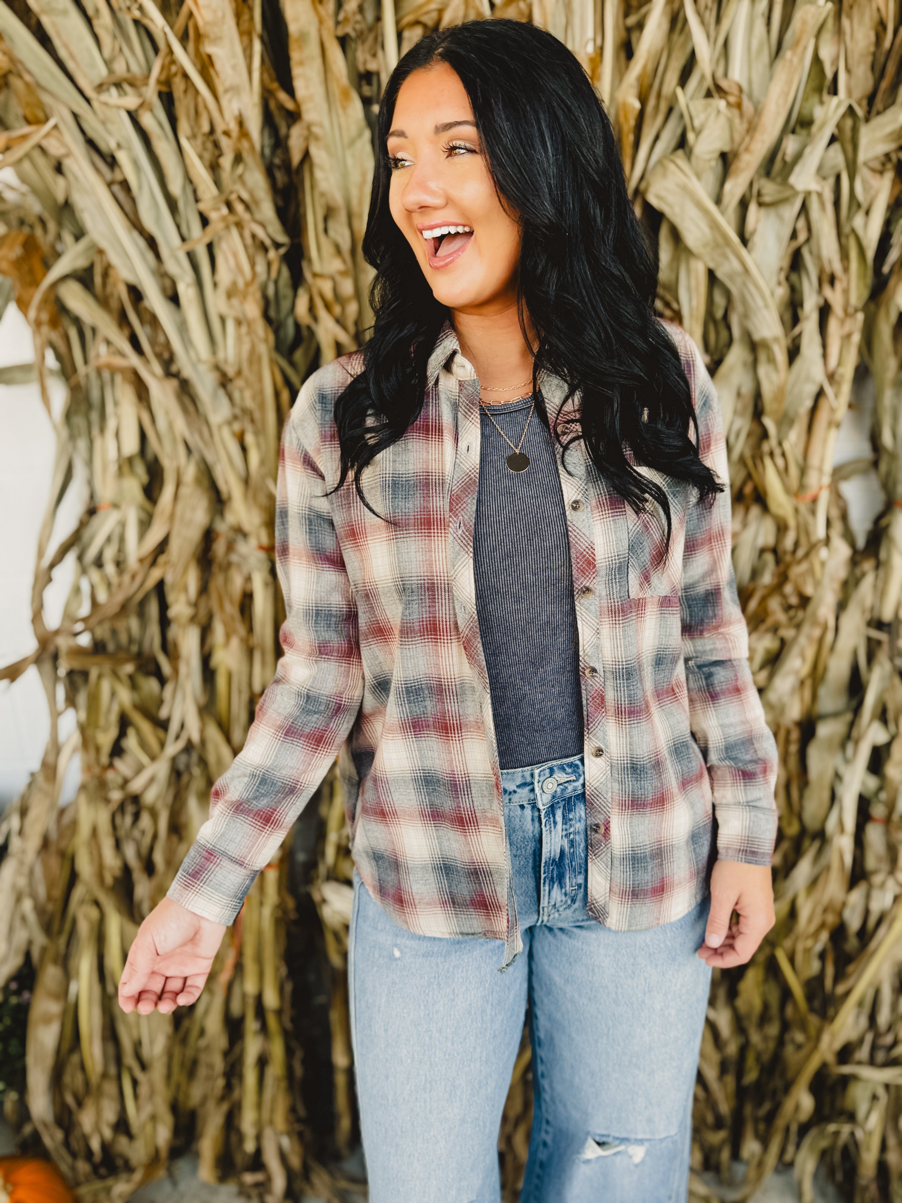 The Plaid Button Up Flannel - Grey Multi is all about comfort and versatility. With its round hem and long sleeves, it pairs perfectly with jeans, leggings, or even layered over a tee for a casual, put-together outfit. This is the flannel you’ll reach for again and again.