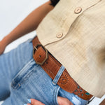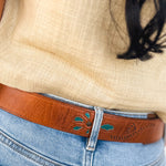 Upswing II features soft, naturally tanned leather with delicate floral detailing and subtle contrast inlays in caramel arctic teal rustic colorway. Finished with an octagonal metal buckle and hand-stitched accents, it adds an effortless touch of handcrafted style to any outfit.