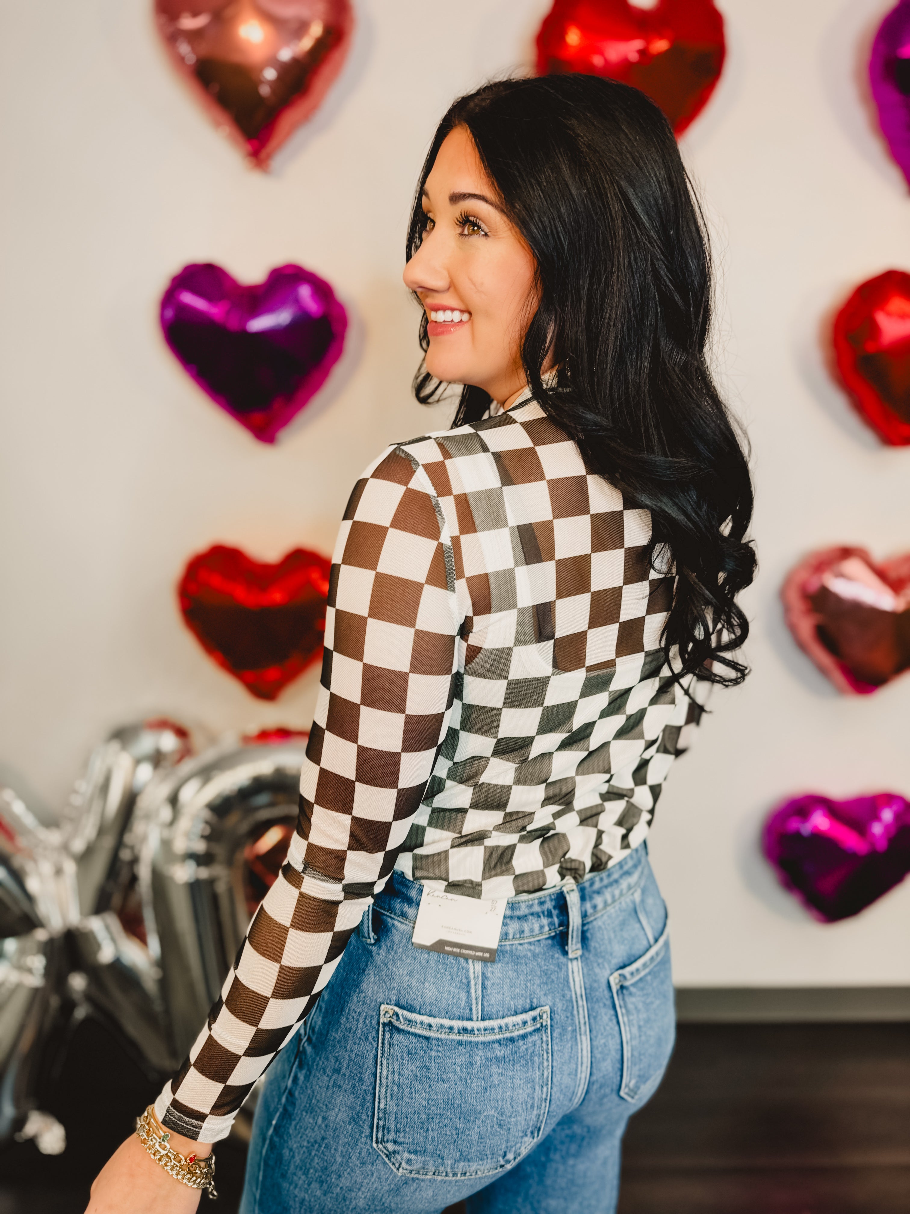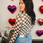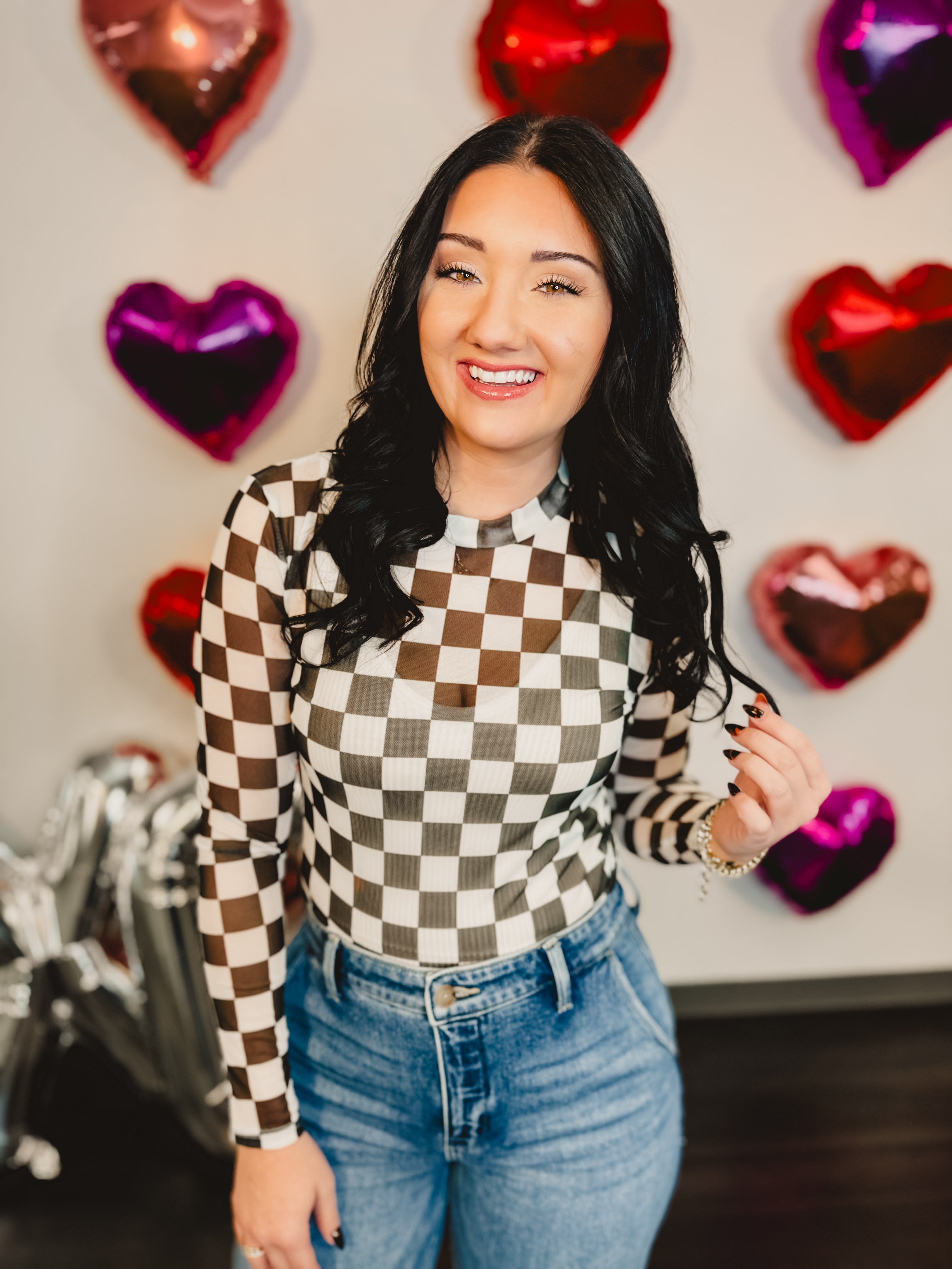 Elevate your style with this sleek checkered mesh mock neck top in classic black. Effortlessly edgy and versatile, it’s perfect for layering or a night out.