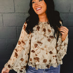 Delicate and feminine, this taupe chiffon blouse features a soft floral print and romantic ruffle details, creating an effortlessly elegant look for any occasion.