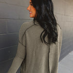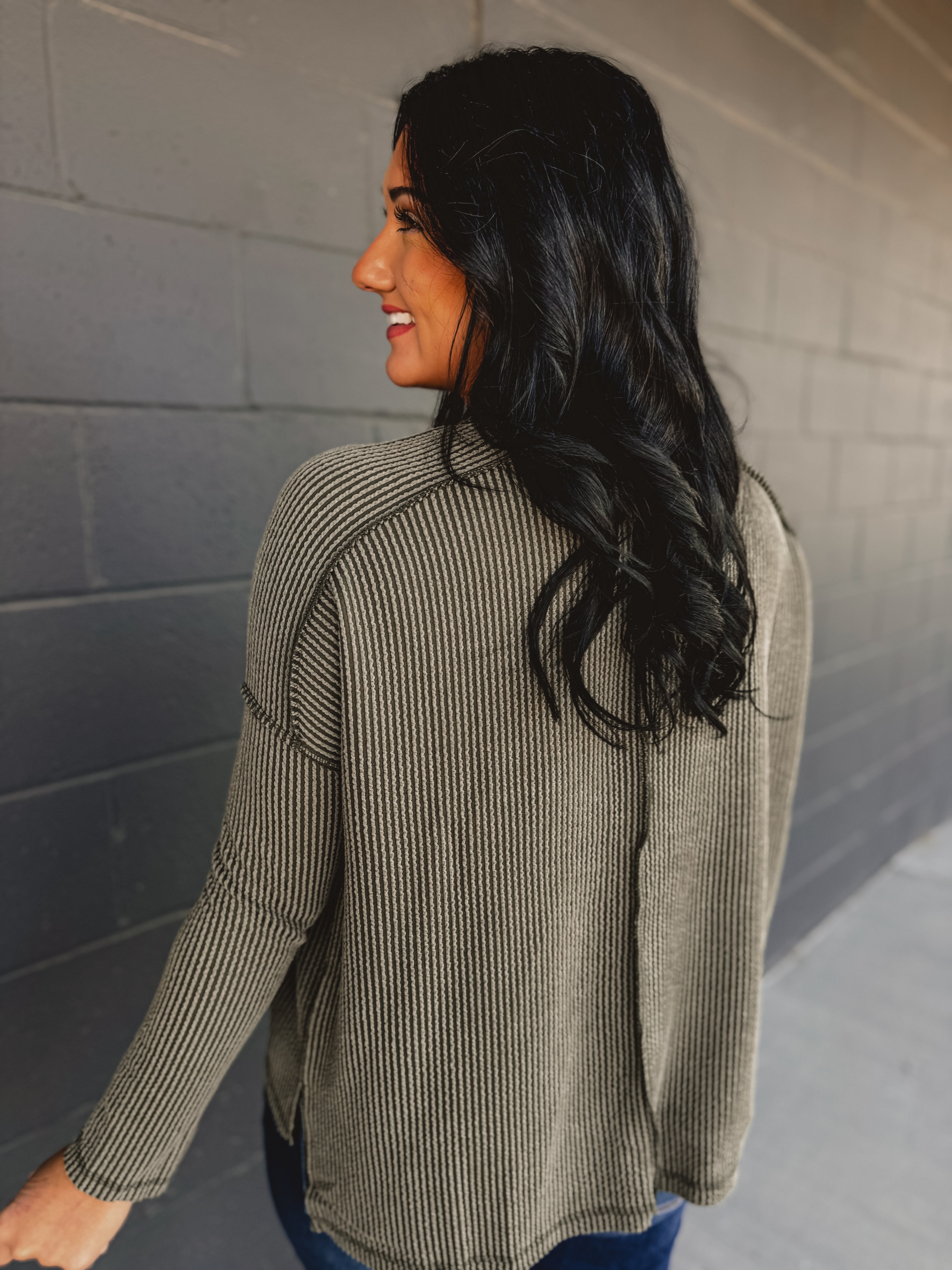 Laid-back and versatile, this dark olive ribbed long sleeve top features raw edge detailing for an effortlessly cool and casual look.