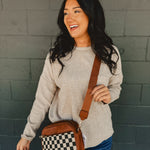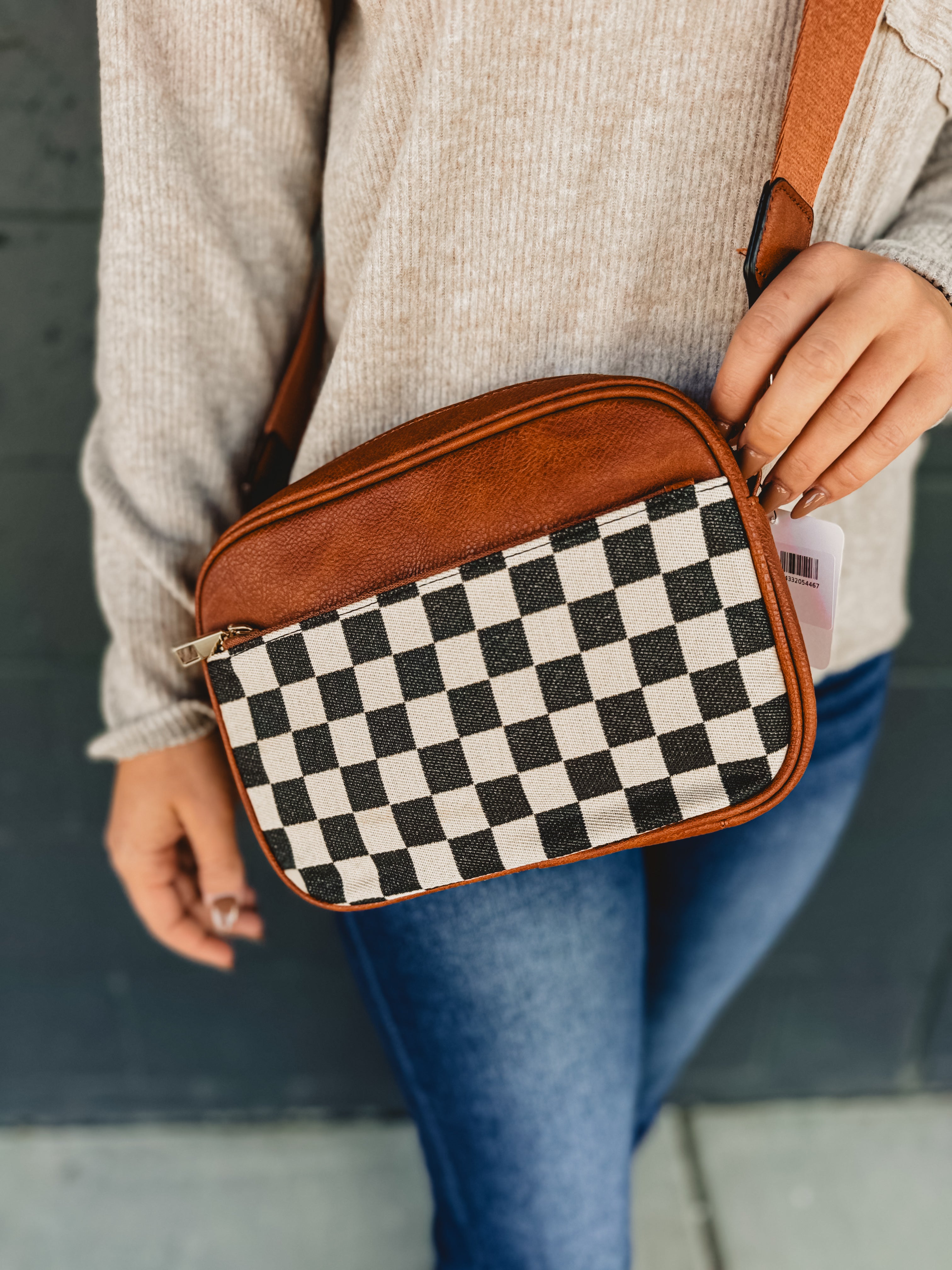 Chic and functional, this camel checkered crossbody bag brings a timeless touch to your look while offering the perfect blend of style and convenience.