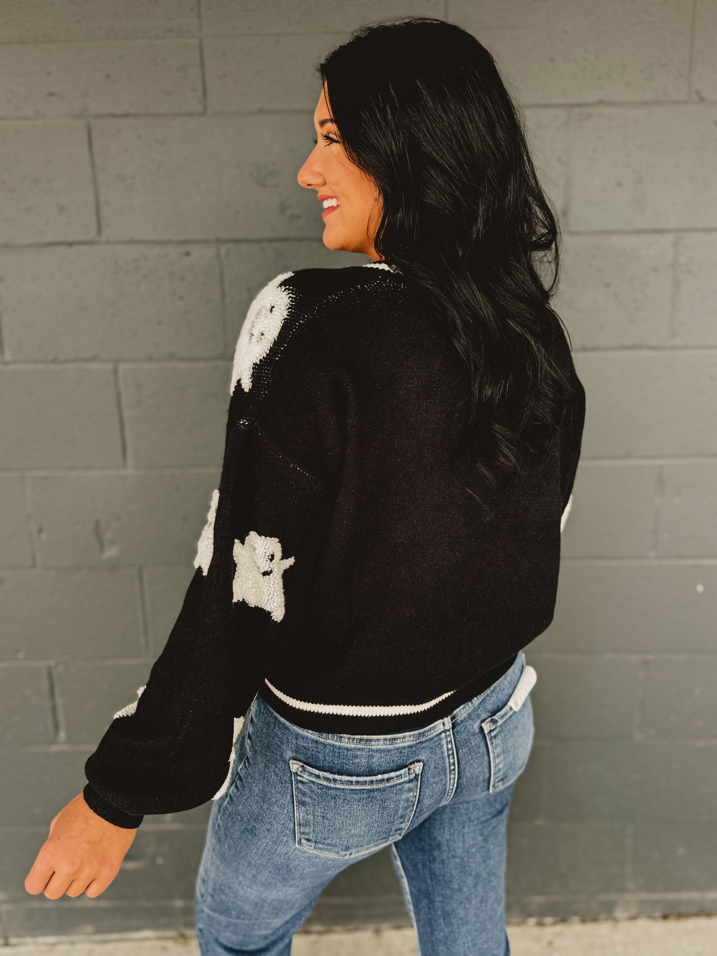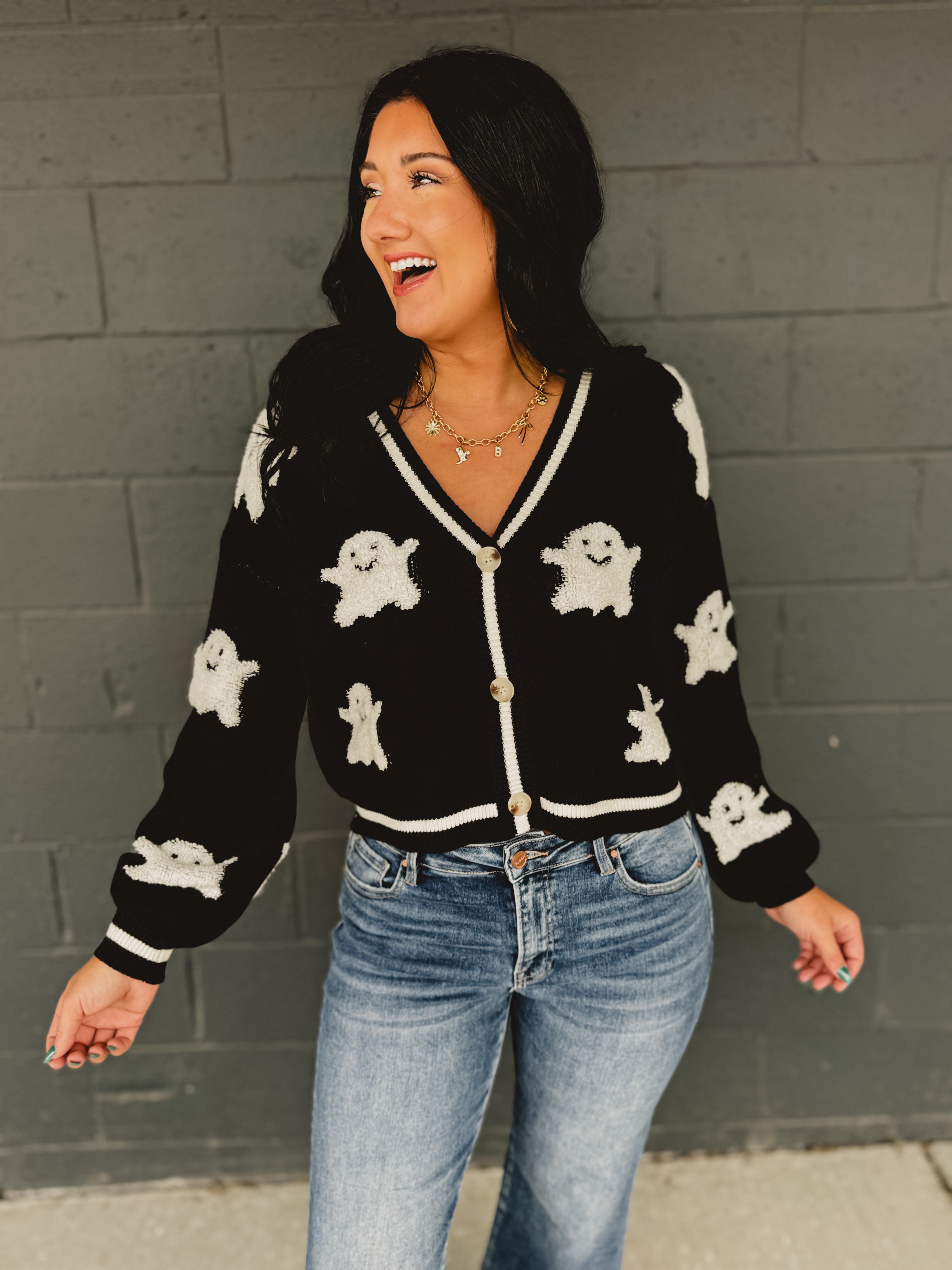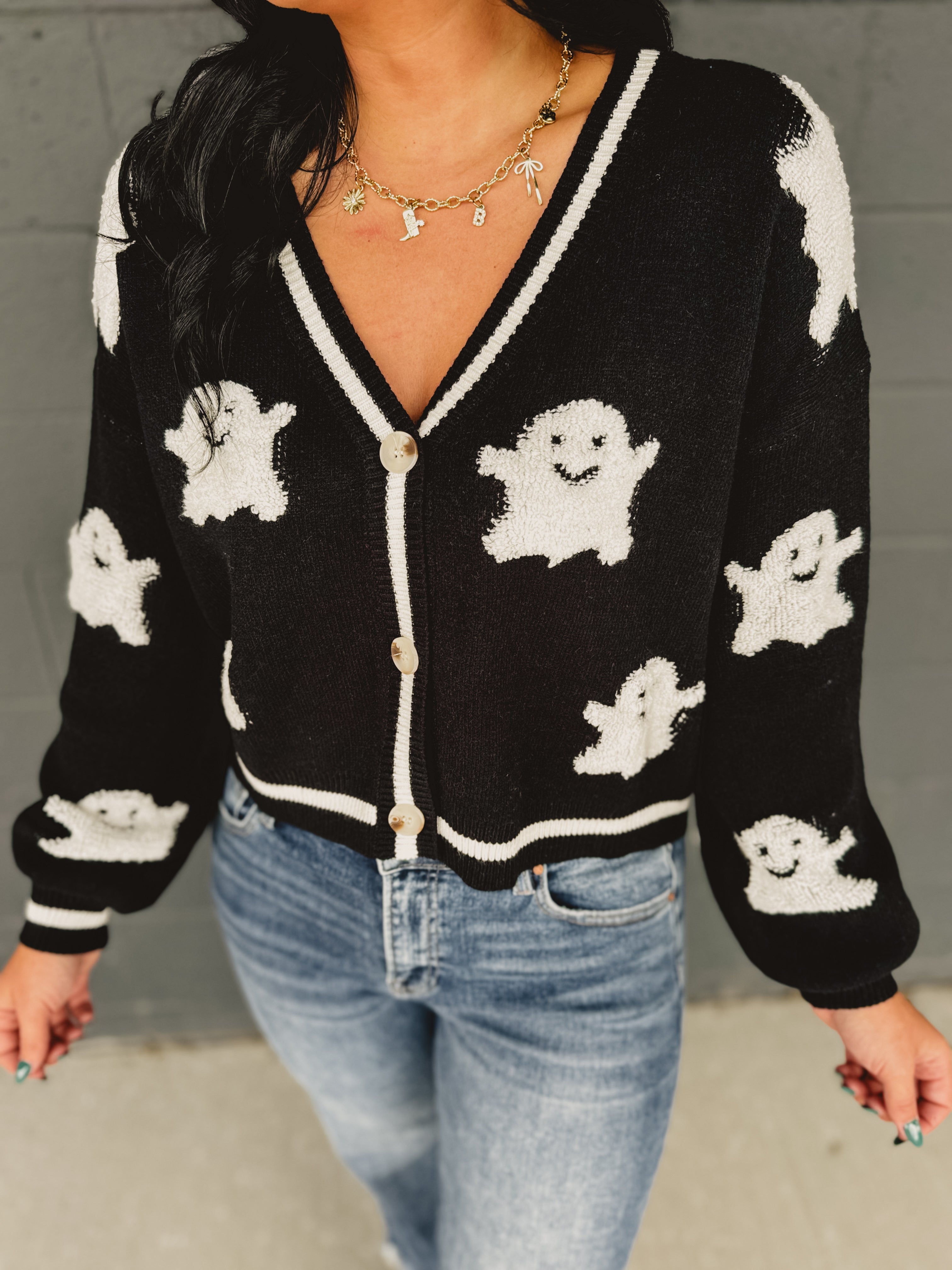 Add some playful spooky style to your wardrobe with this cozy knit cardigan featuring happy ghost patches. A button-up design makes it easy to wear layered or on its own.