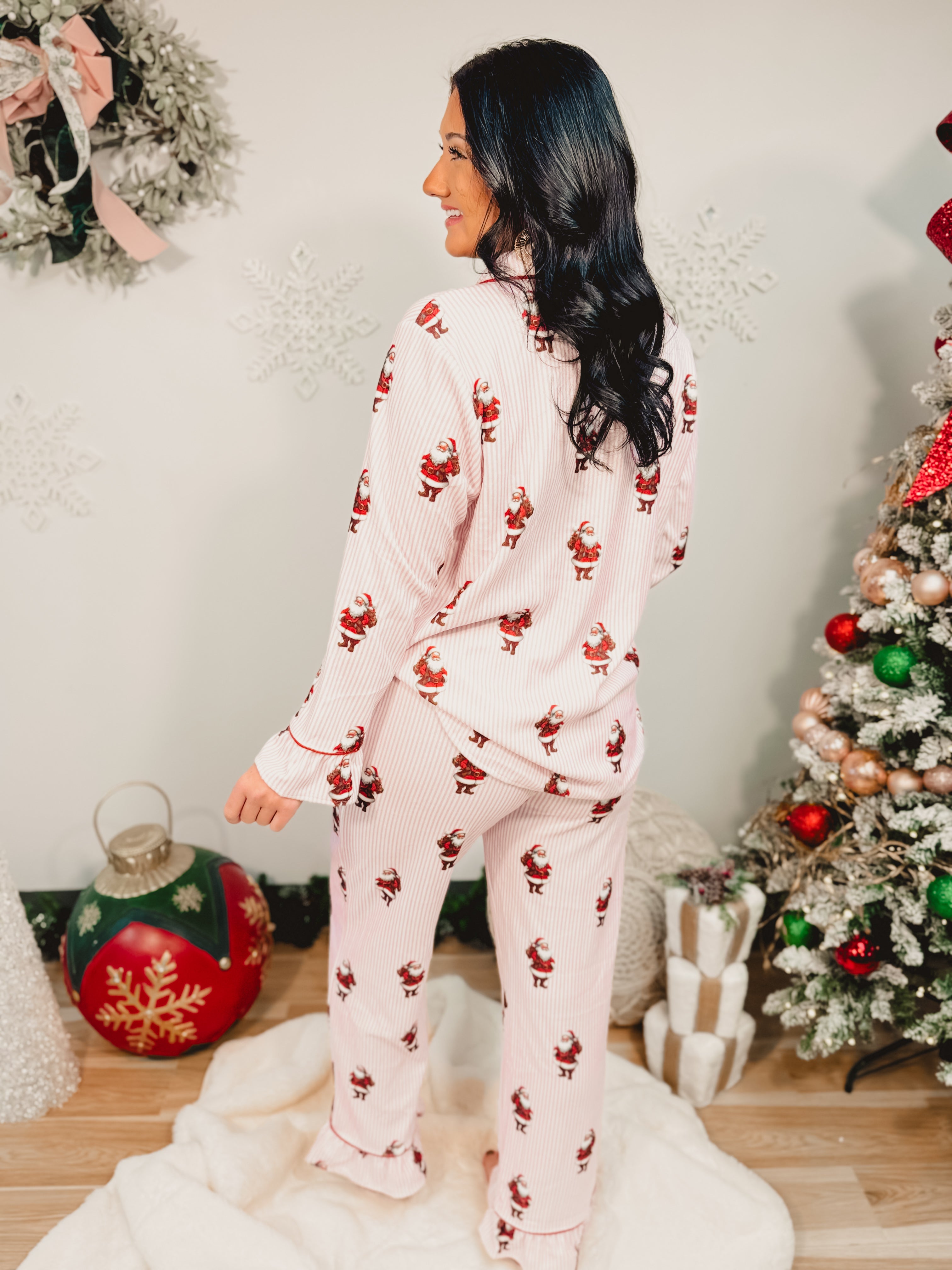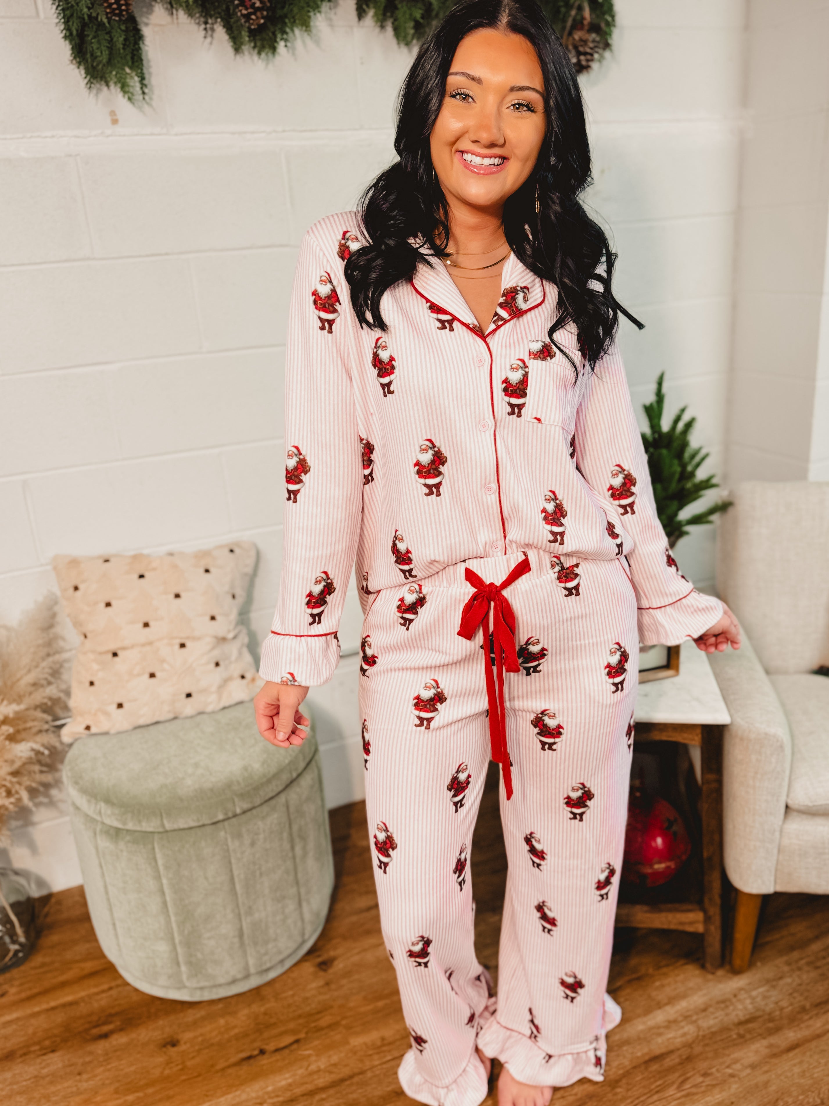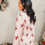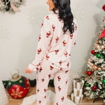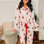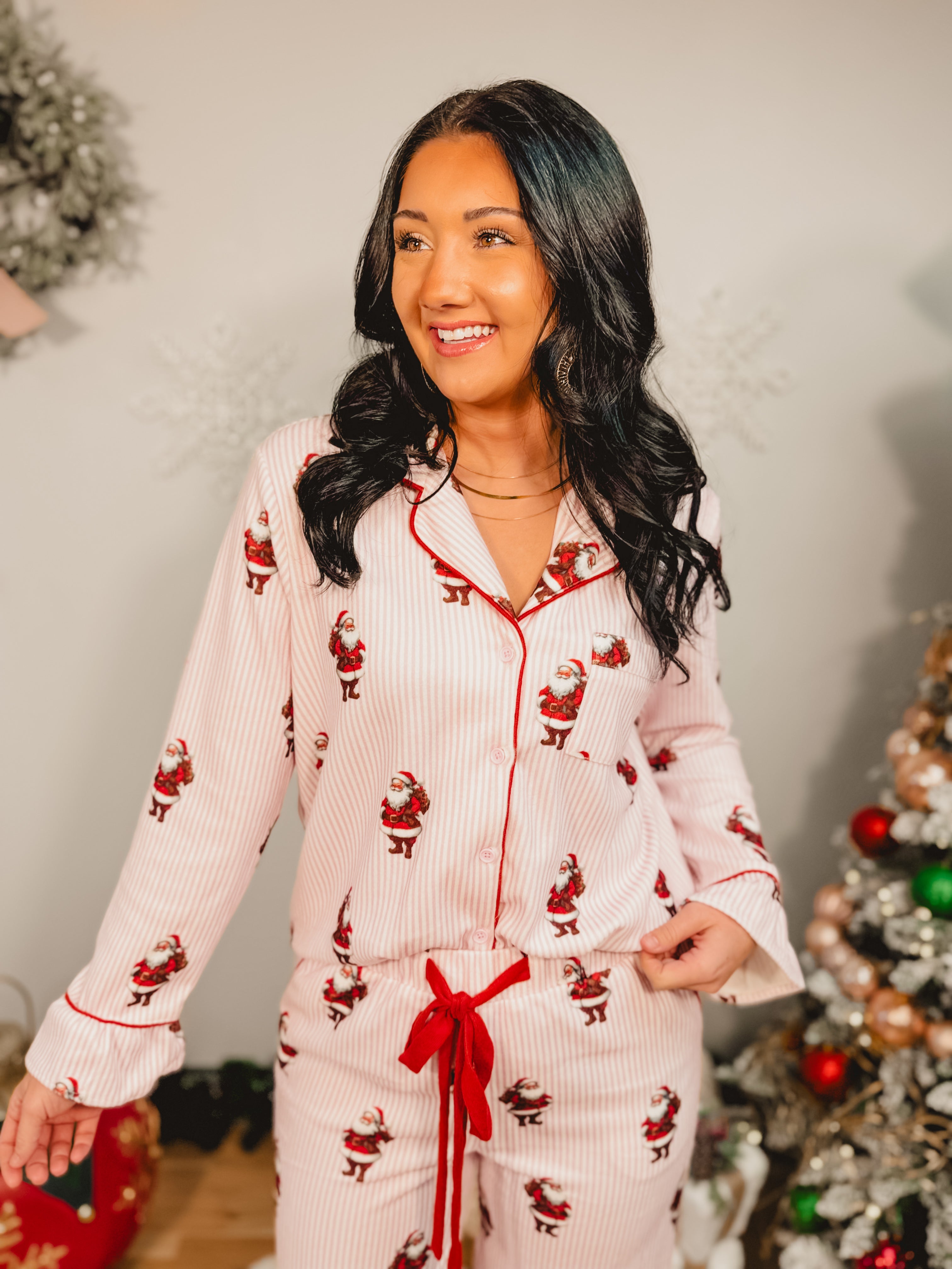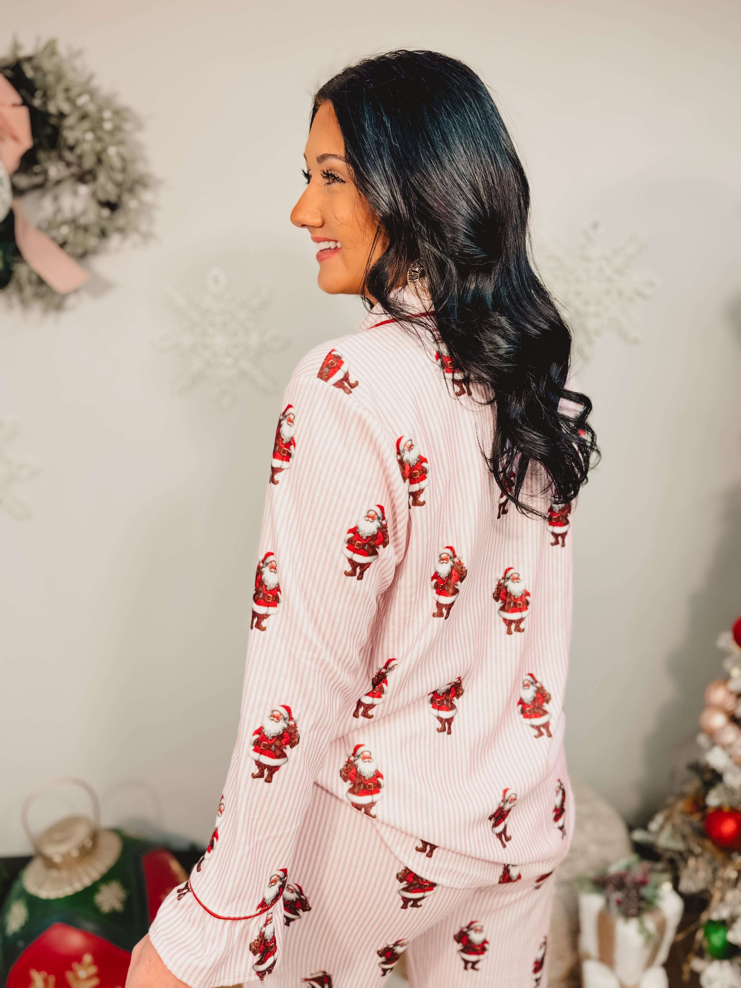 Sweet and festive, this pink and red striped pajama set features playful Christmas tree details for the perfect mix of cozy comfort and holiday cheer!