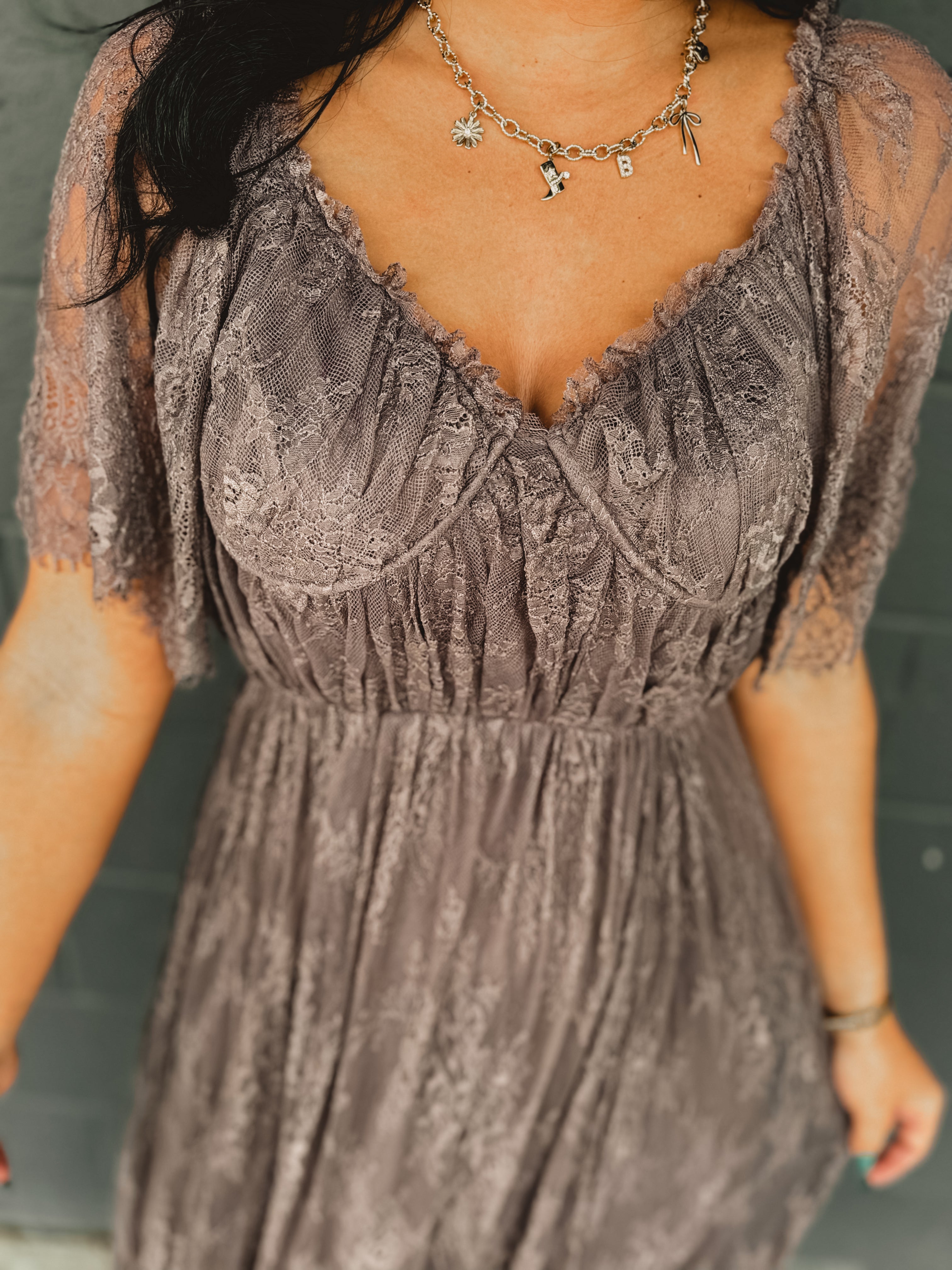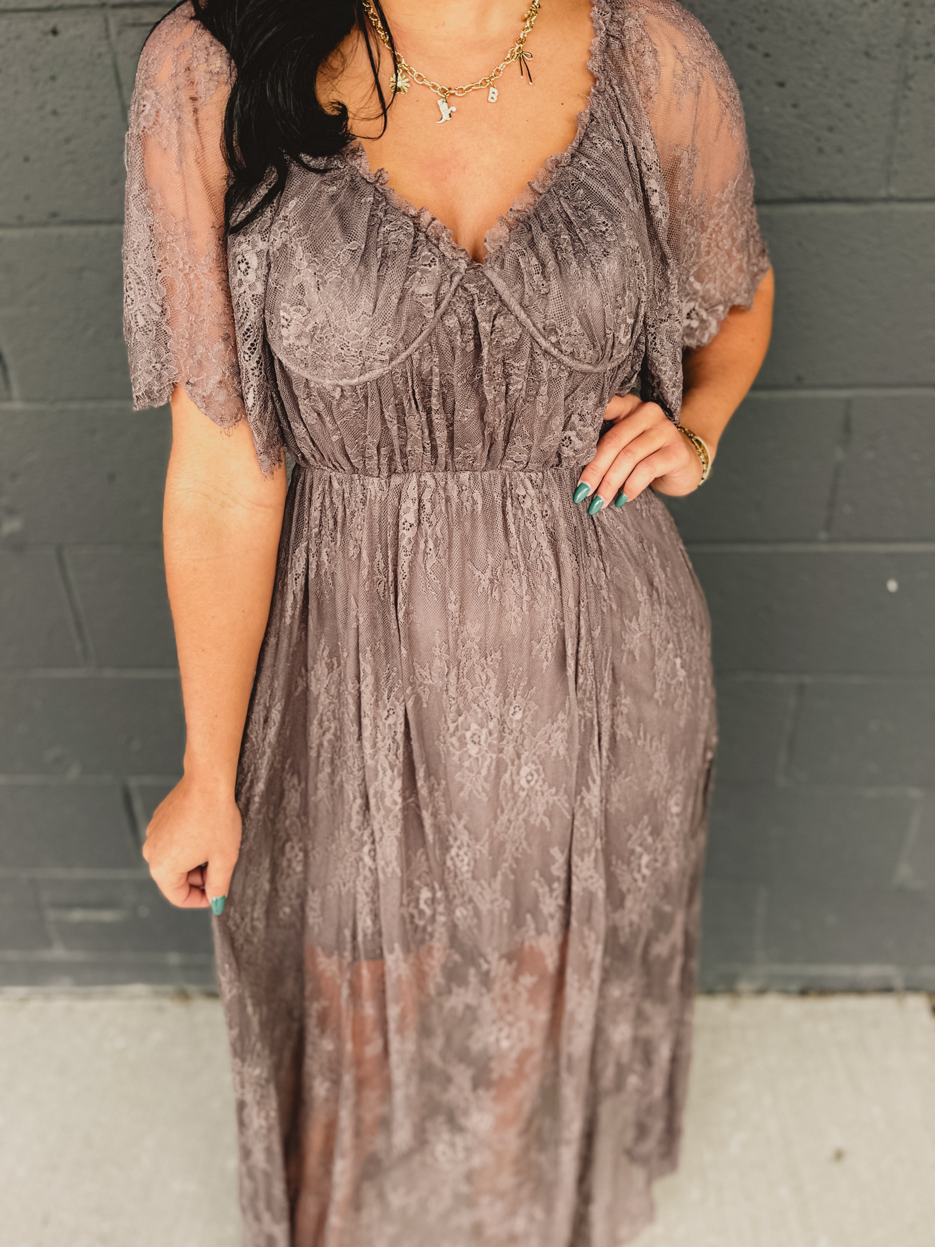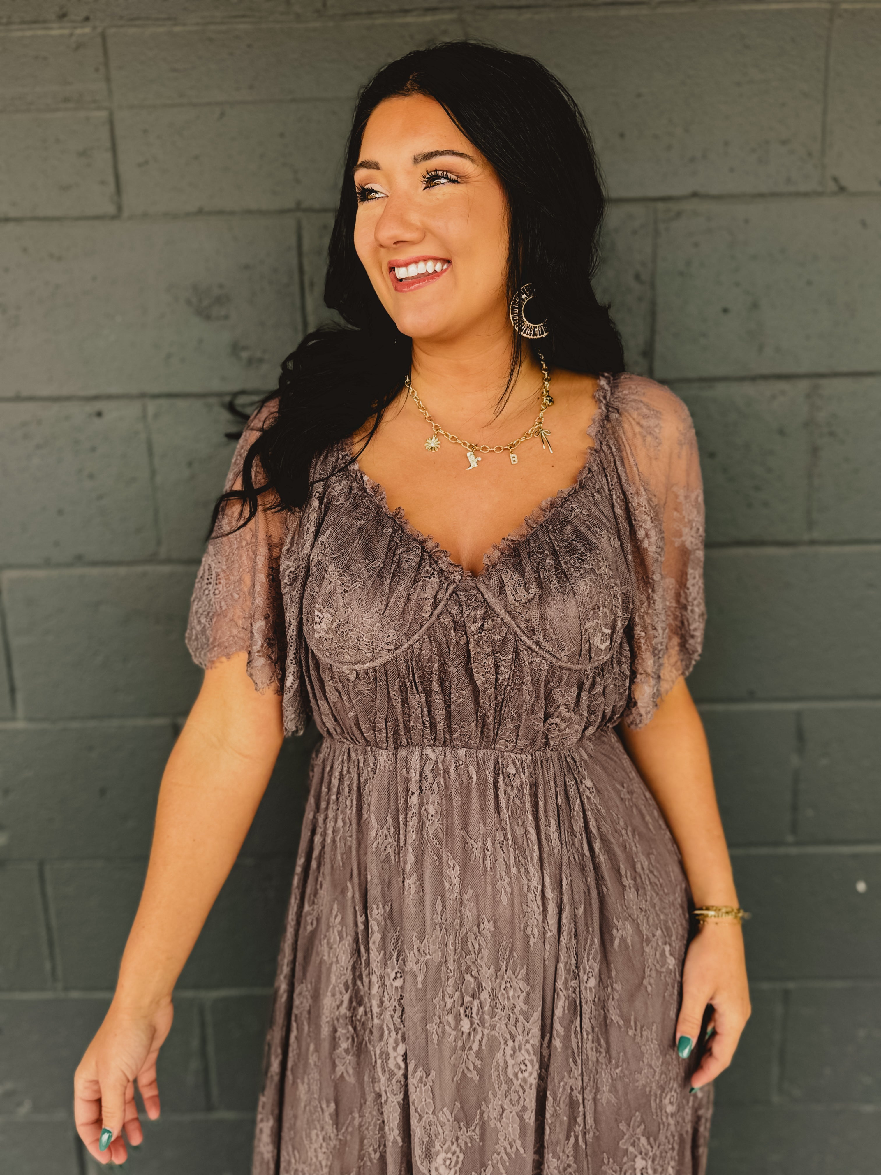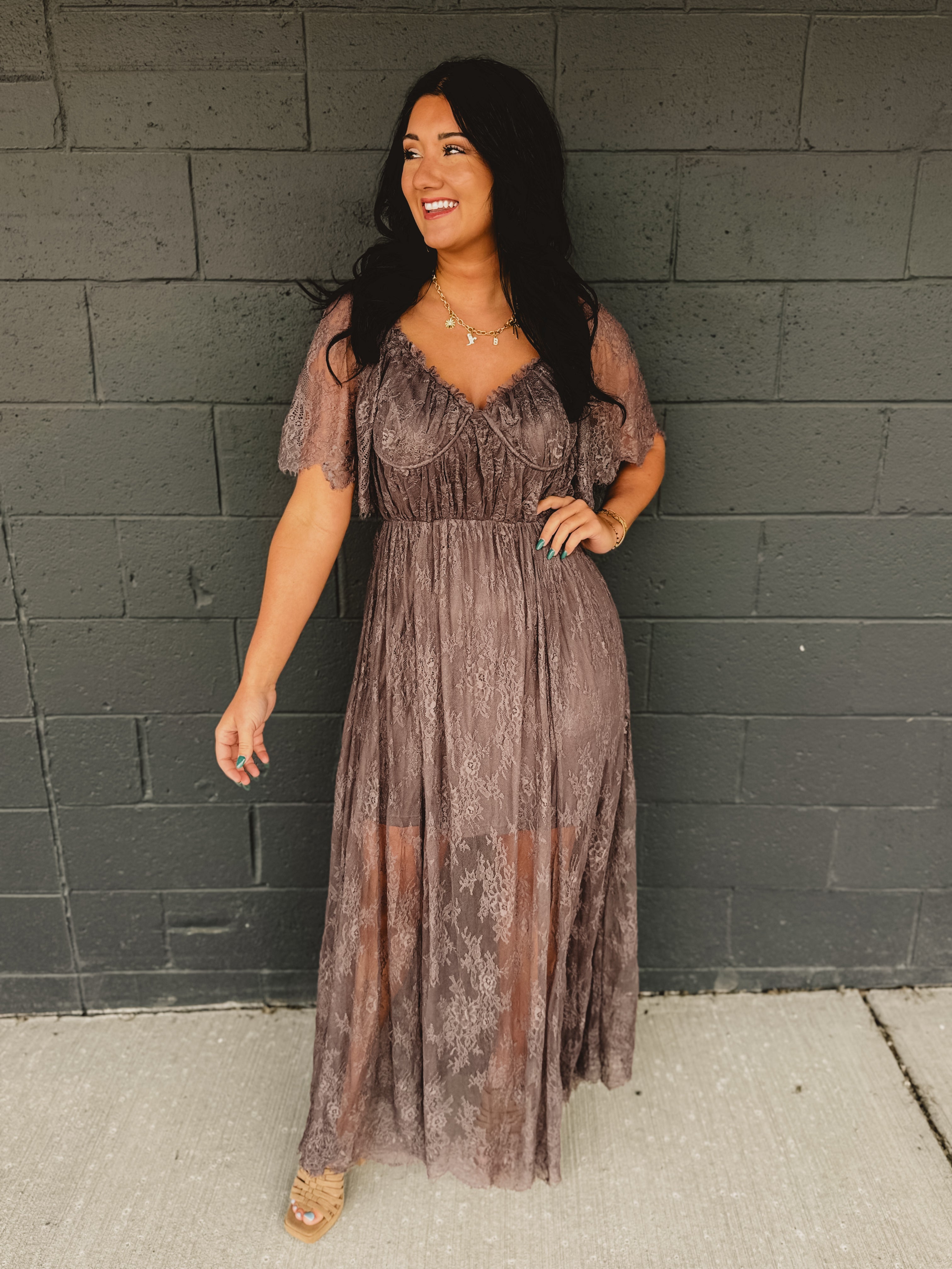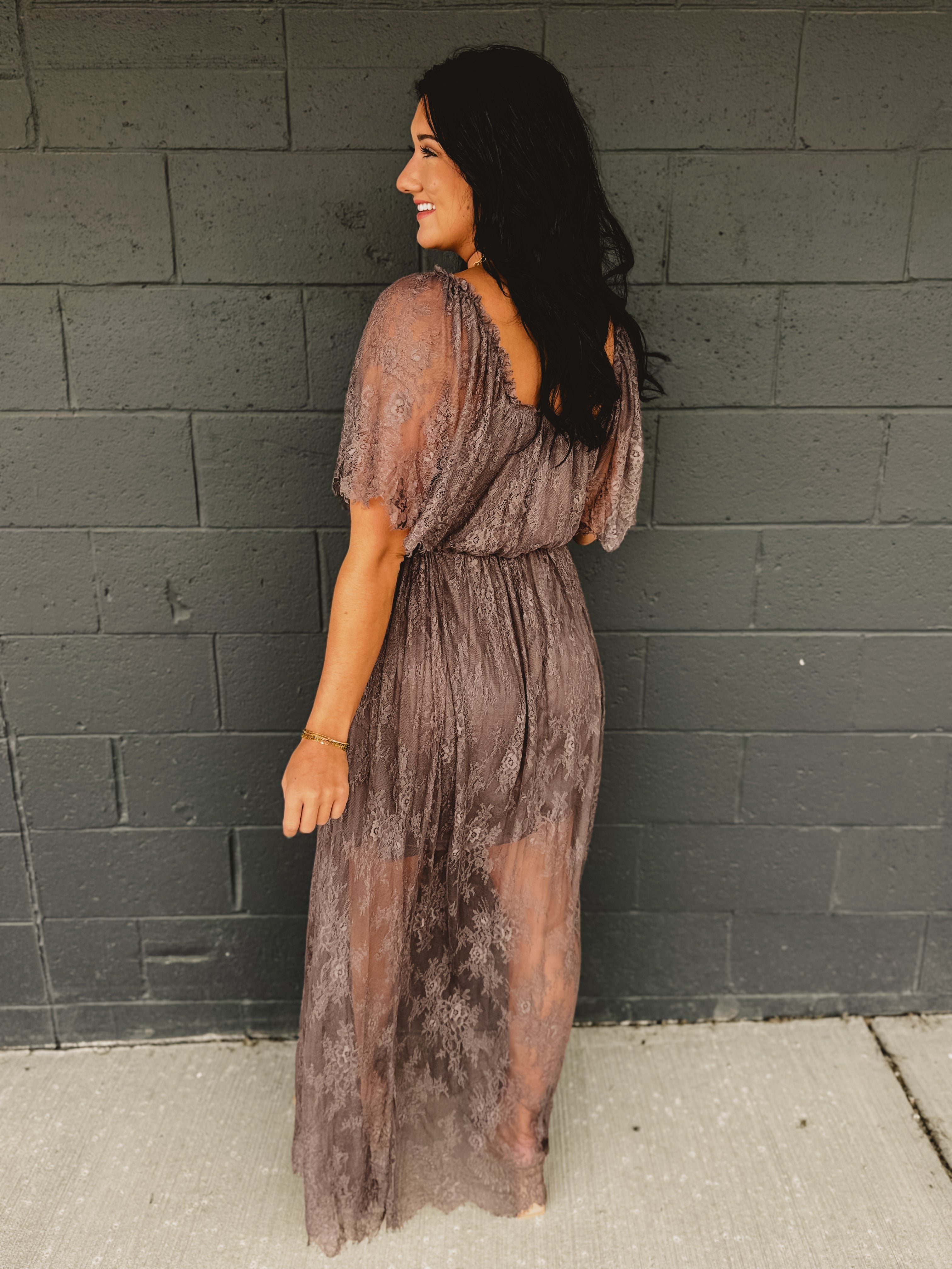 With its midnight hue and delicate lace overlay, this flowing maxi dress captures a romantic, sophisticated feel perfect for evening gatherings or formal occasions.