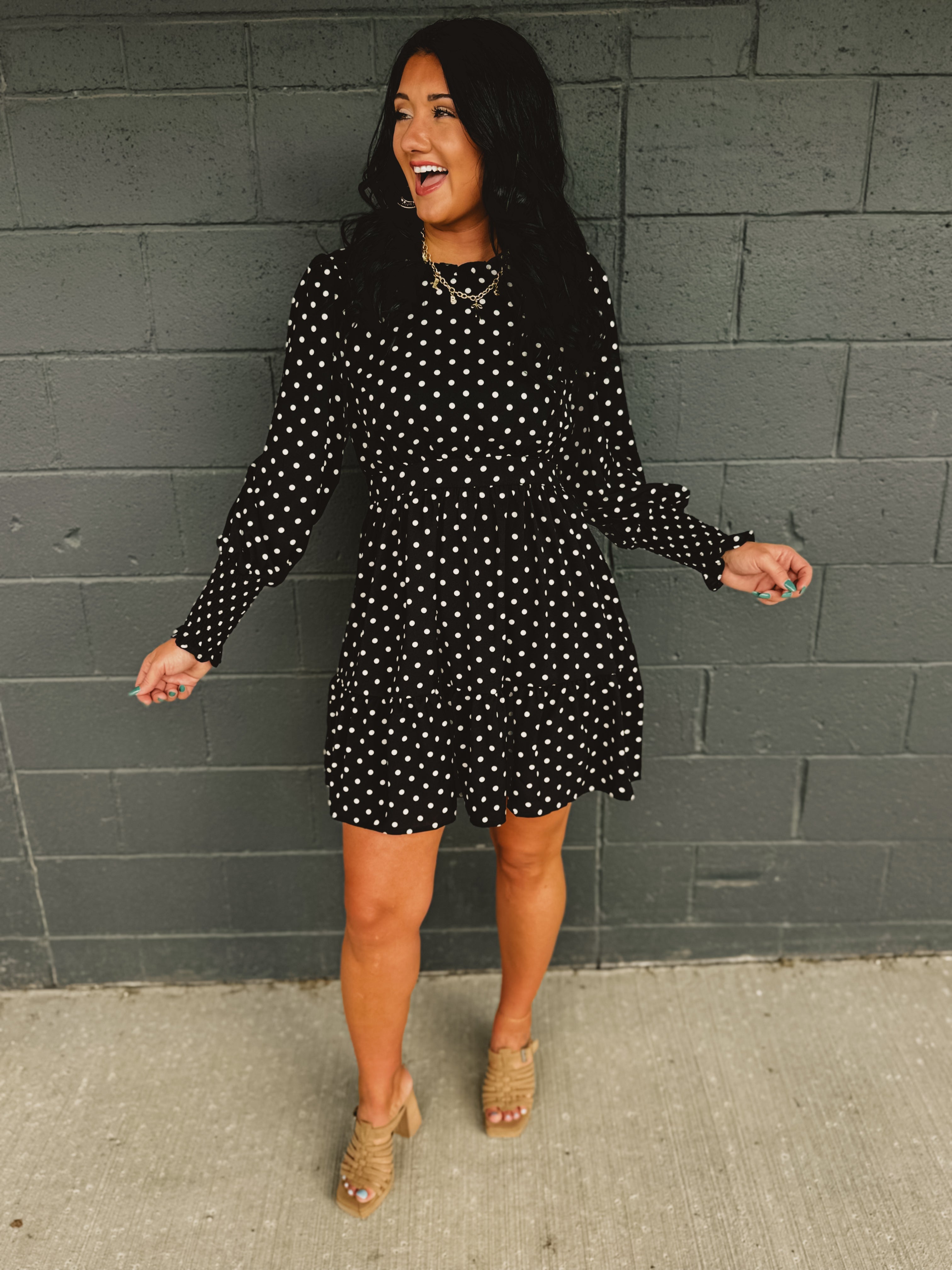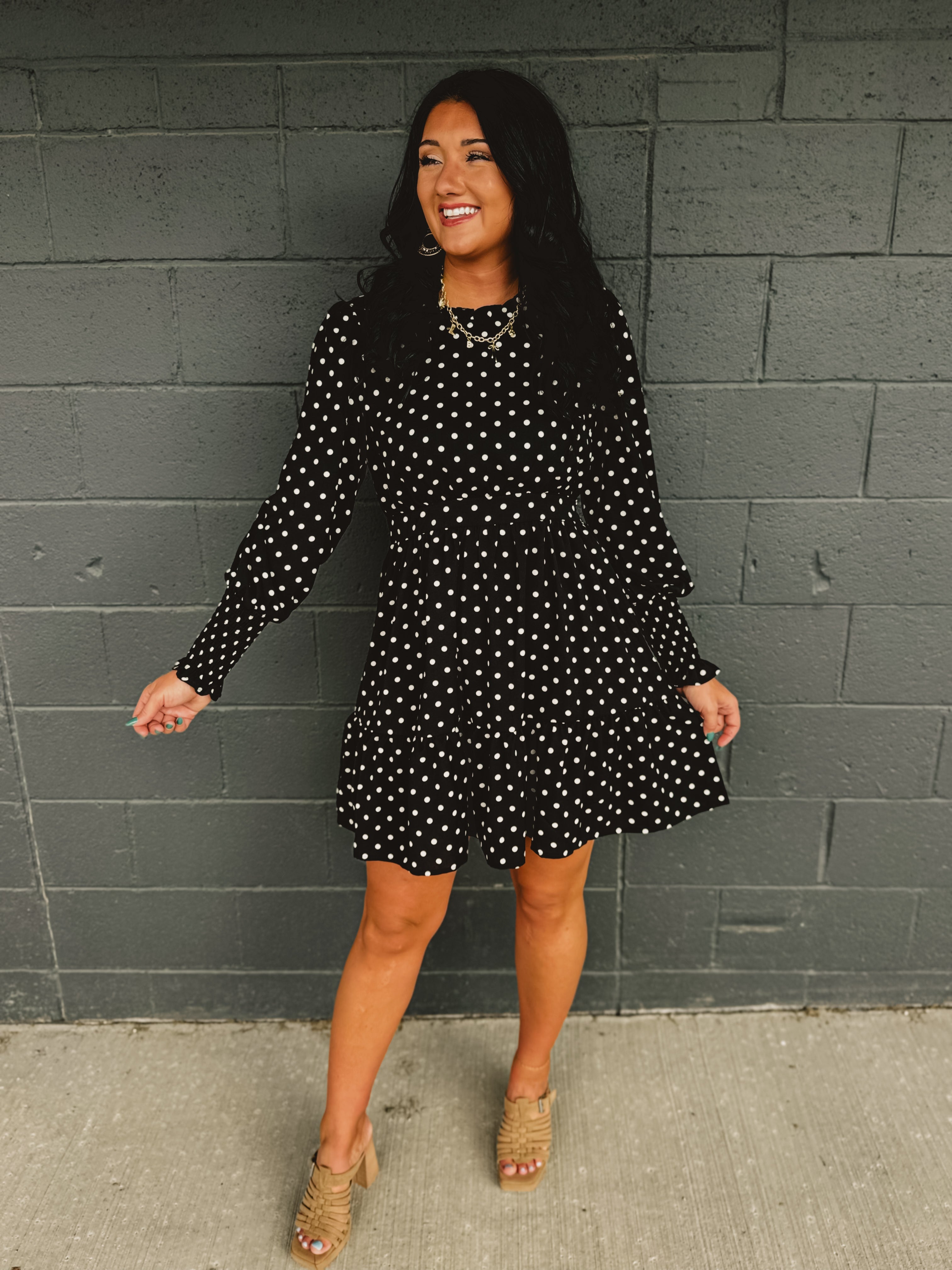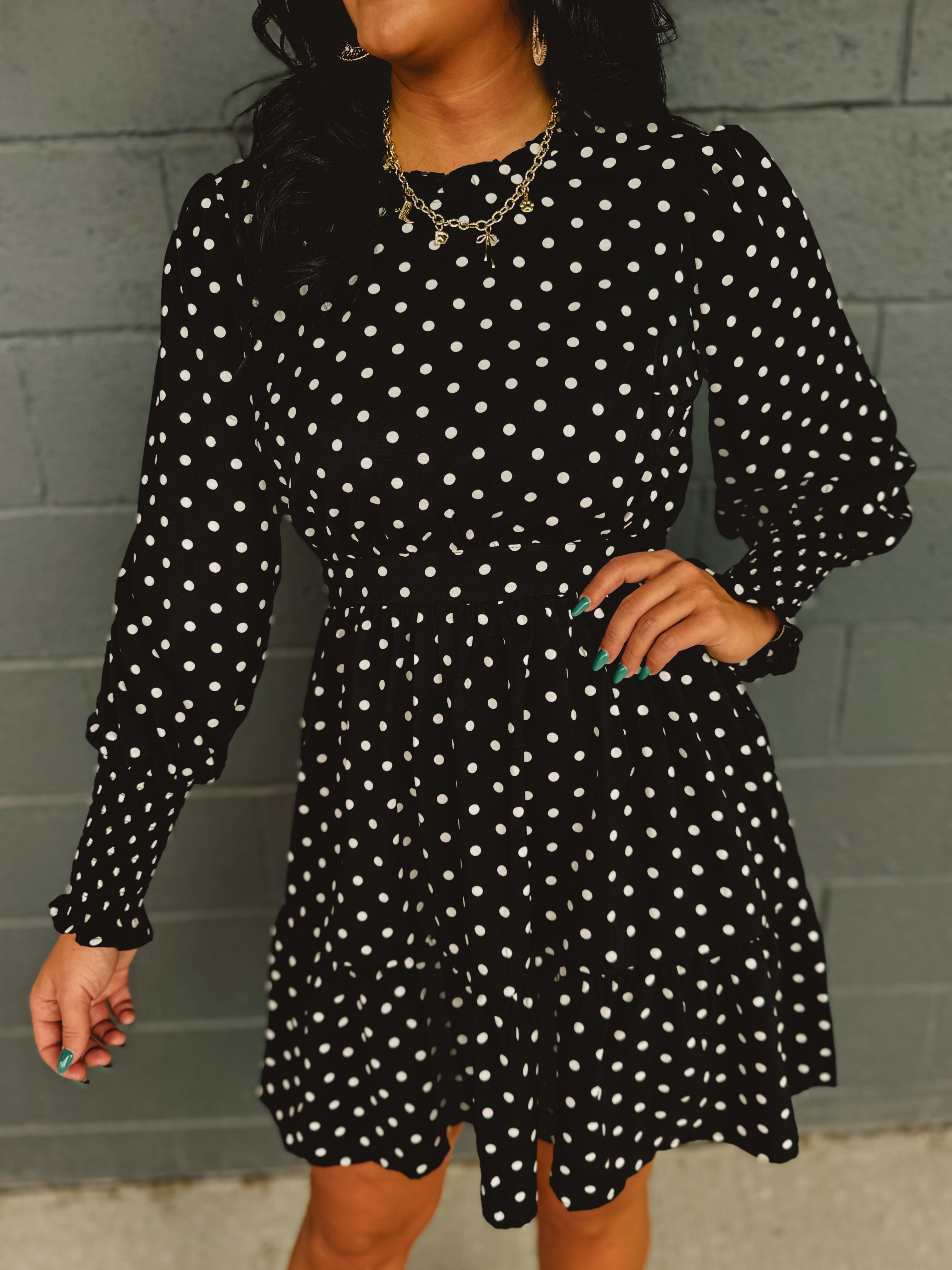 This black polka dot mini dress with ruffled details brings a playful yet chic vibe, perfect for parties or a night out!