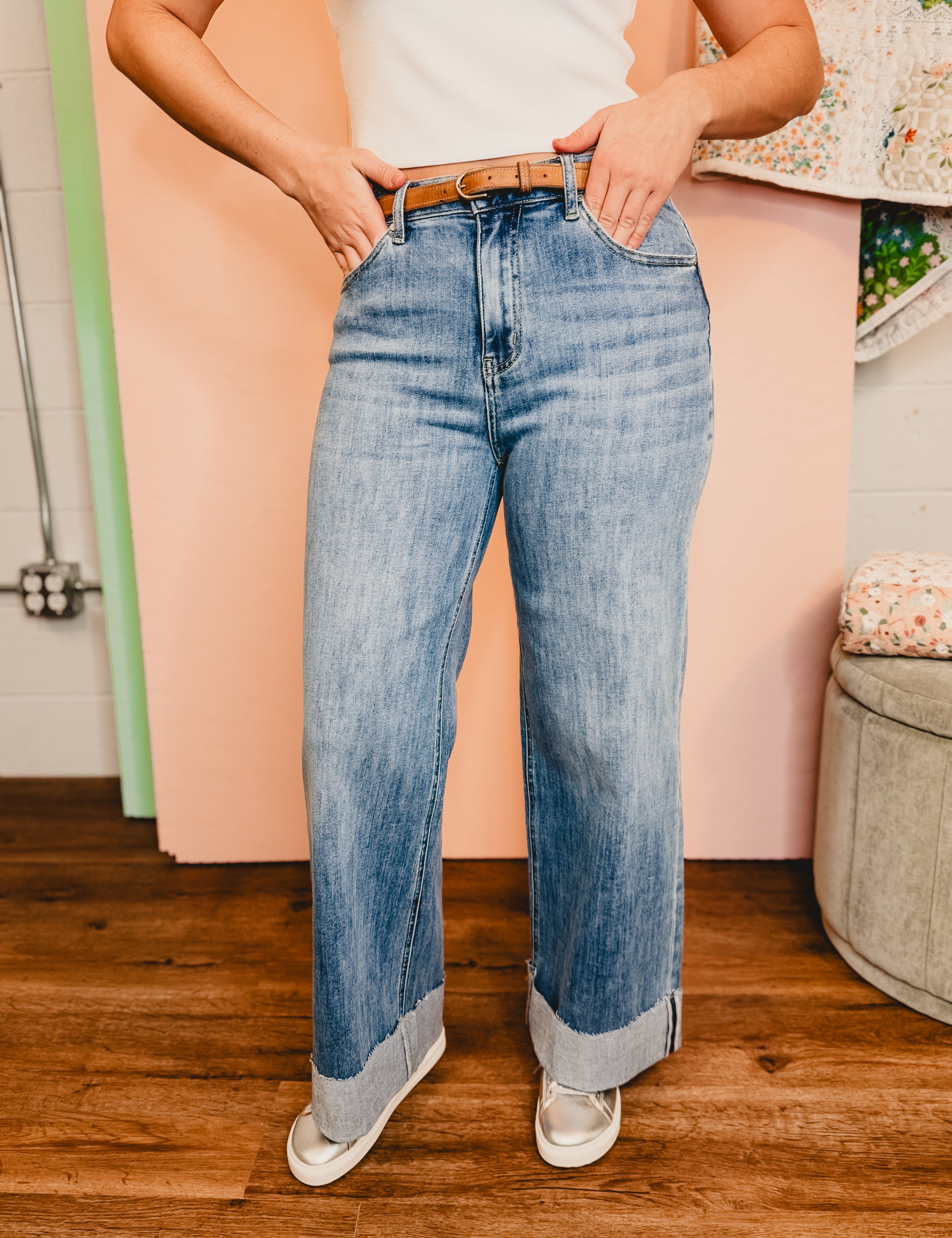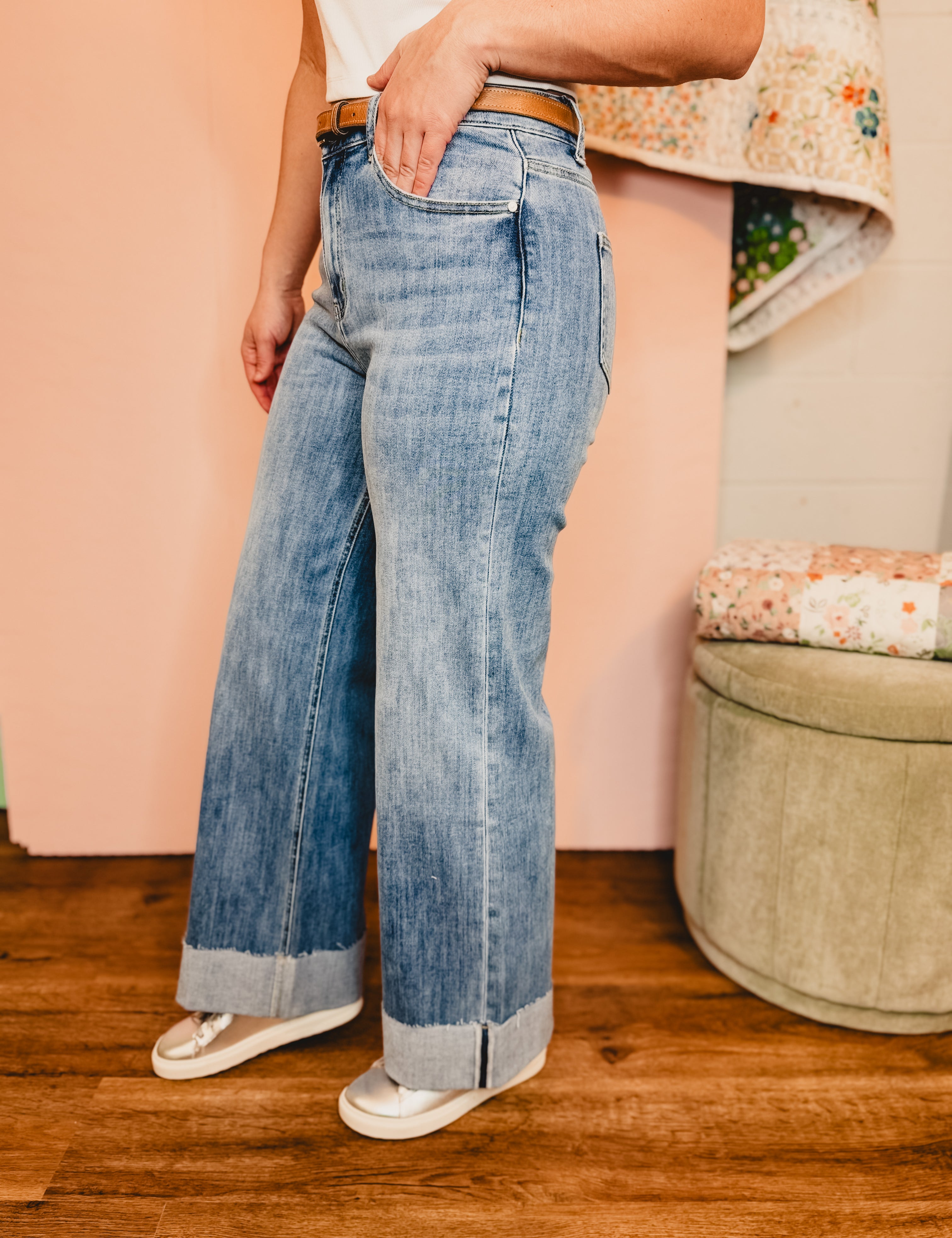 Hidden Cuffed Classic Distressed Wide Leg Jeans - Medium Wash