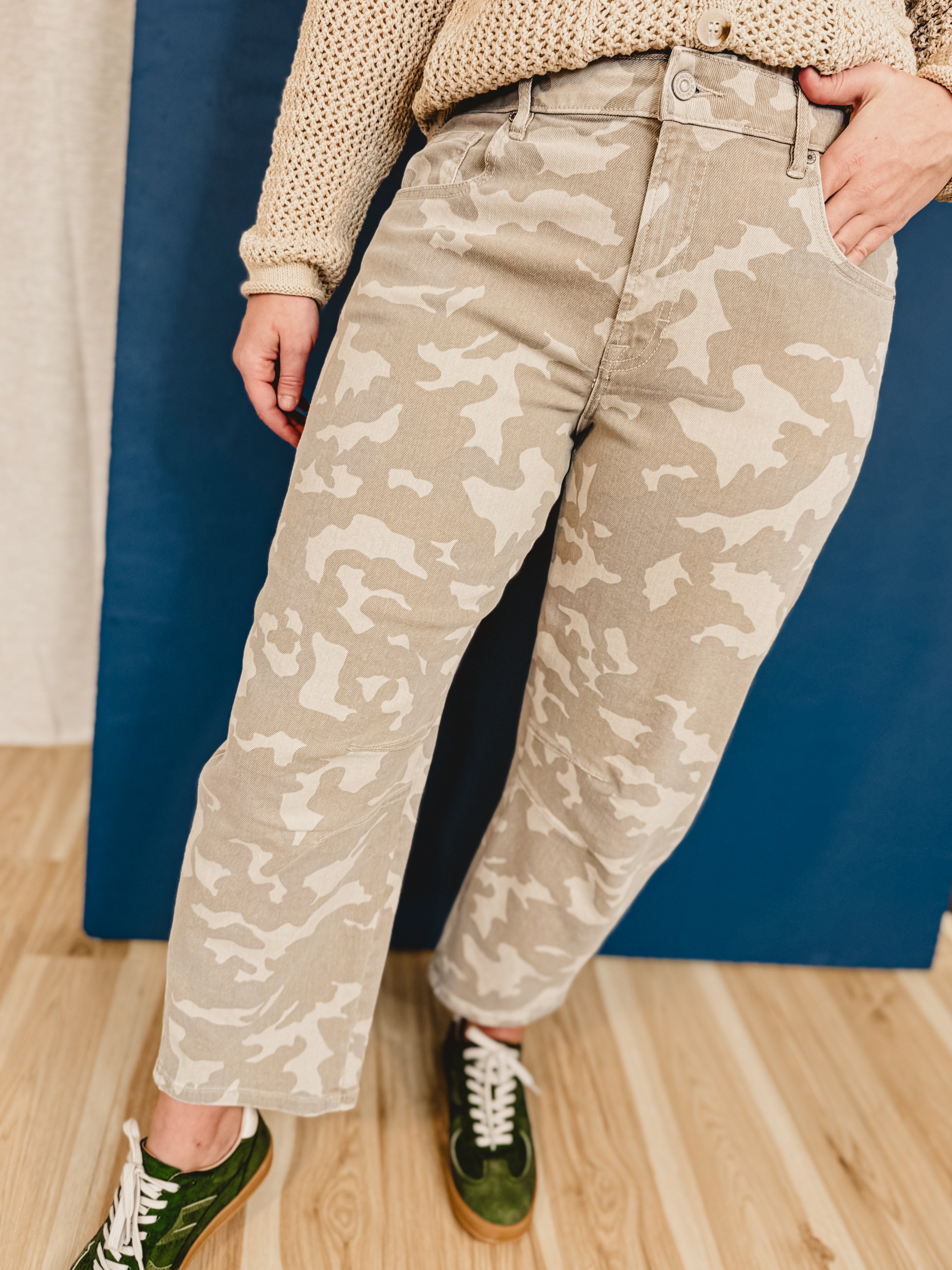 A trendy statement jean designed with a modern barrel silhouette. The Sammie jeans feature a high-rise fit and tan camo print for an effortlessly cool look!