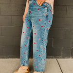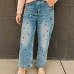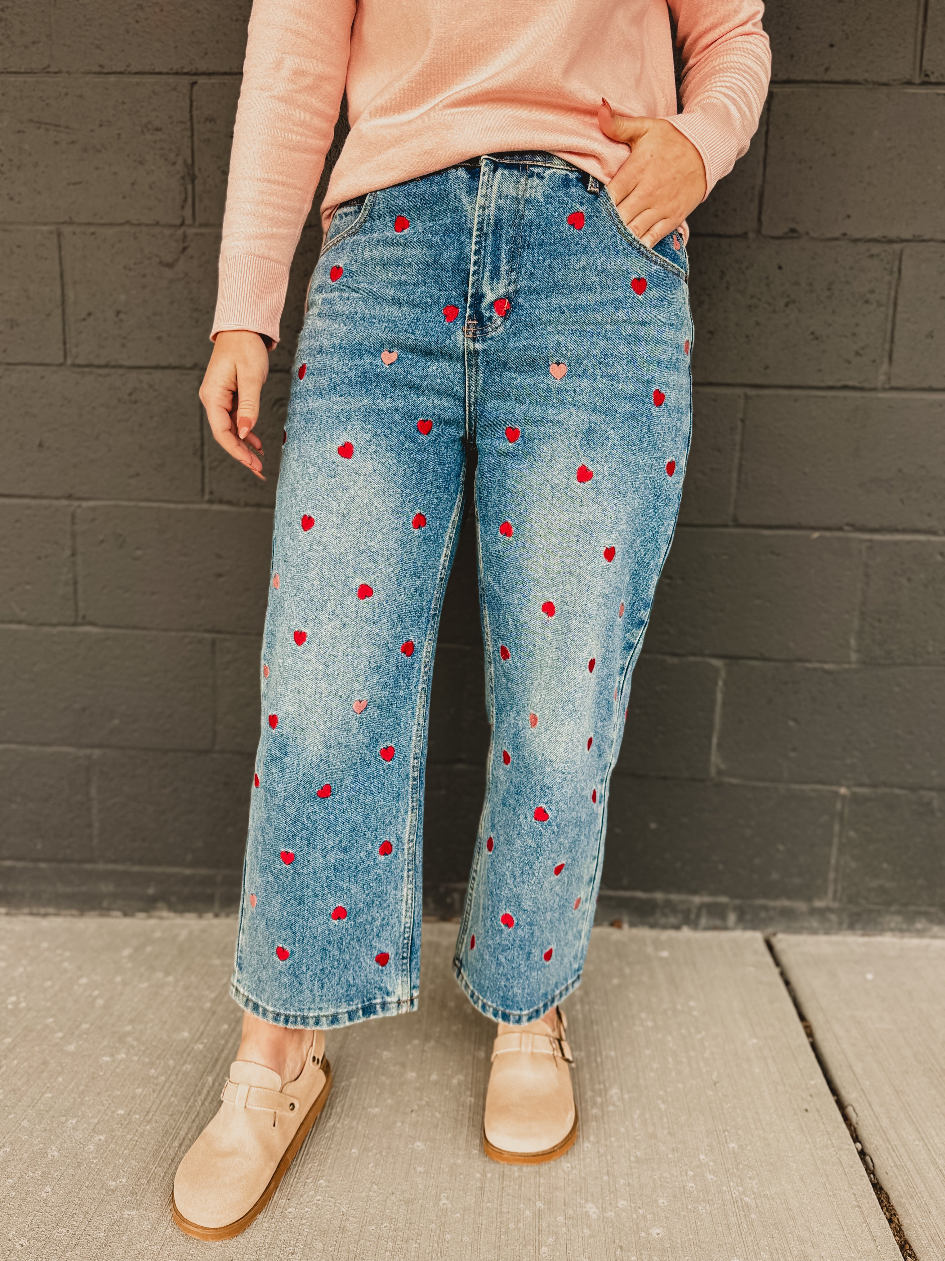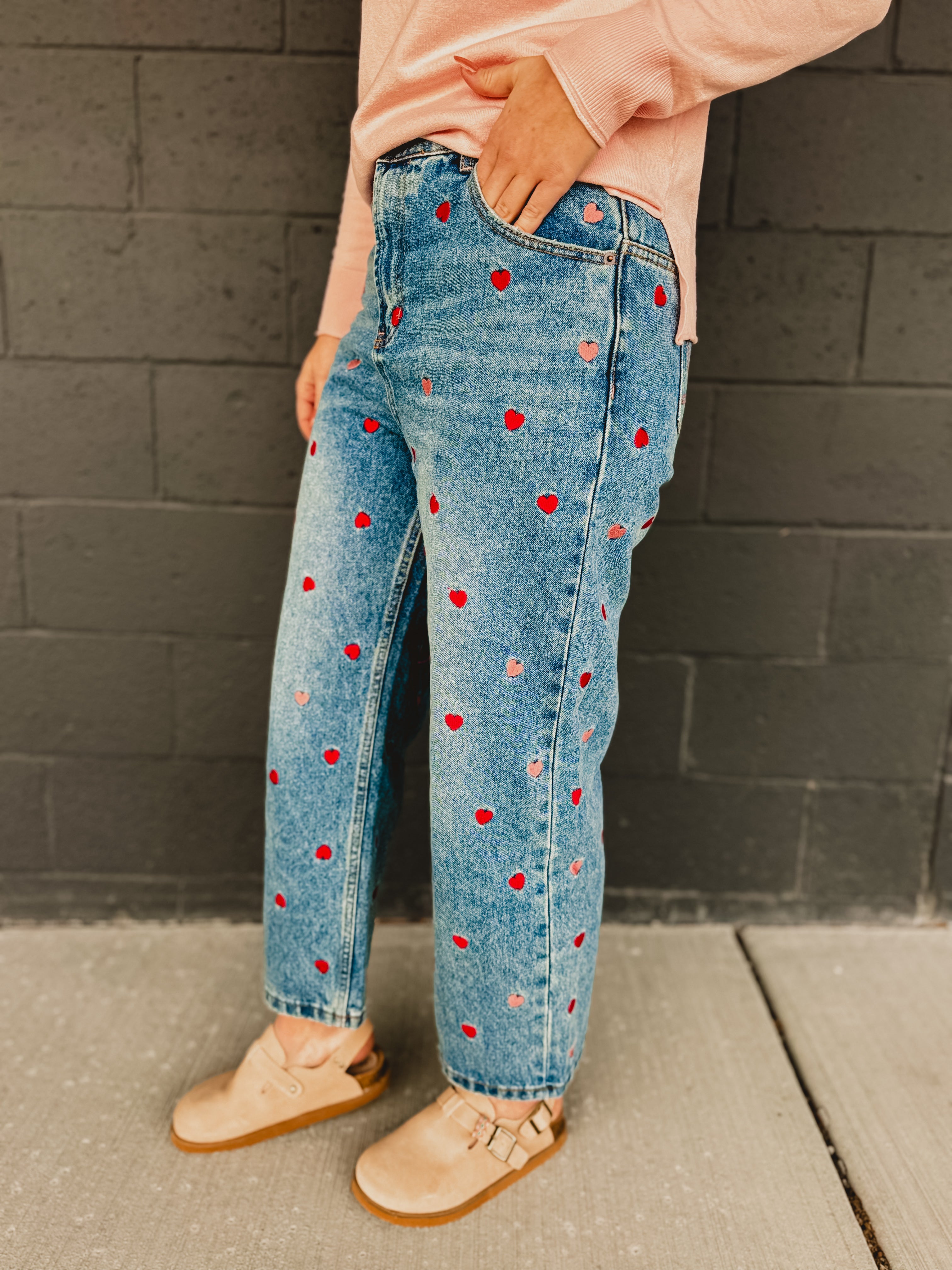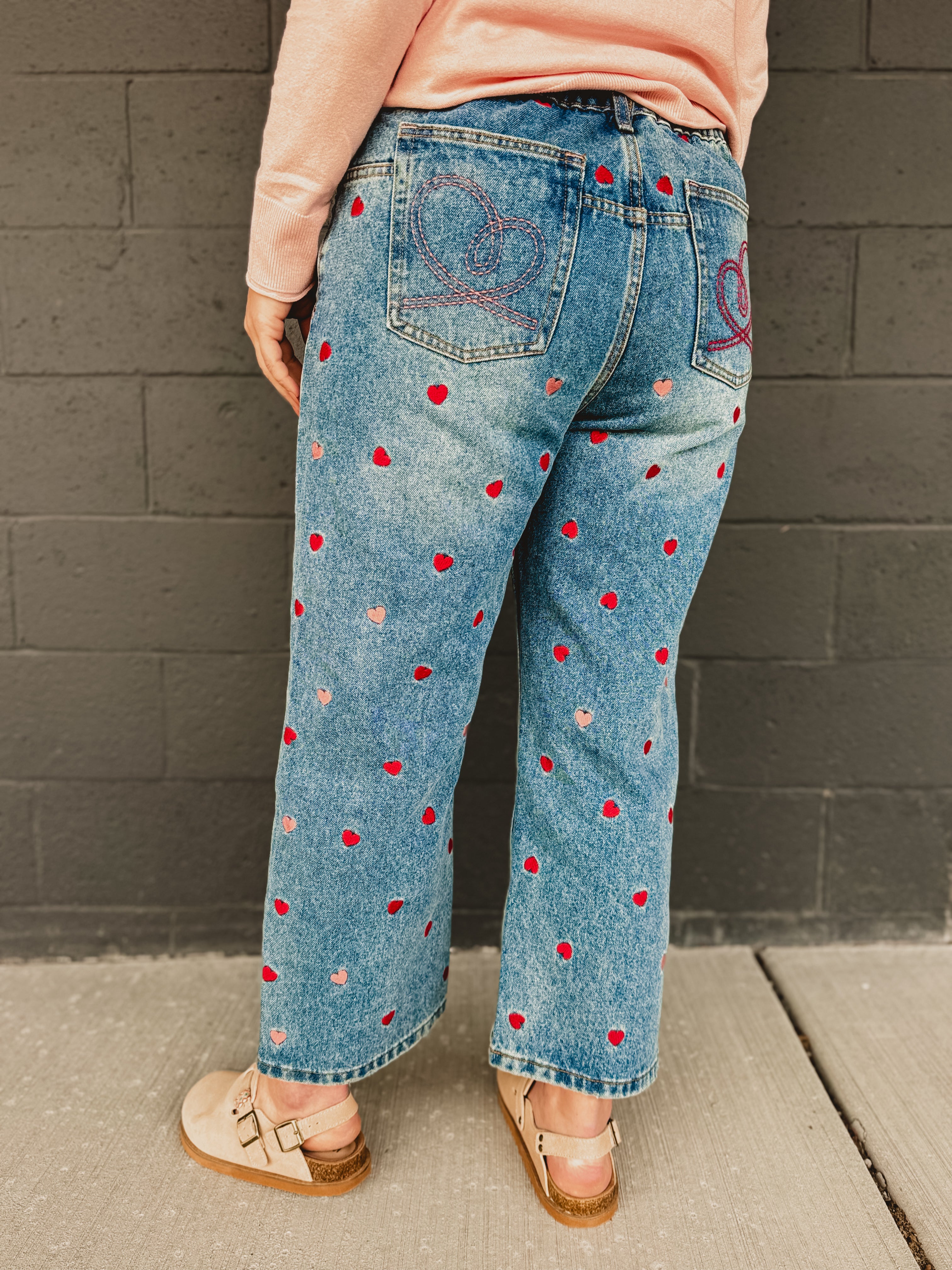 Stylish and playful, these heart embroidered jeans are a wardrobe must-have. Pair it with a heart decorated sweater and you have the perfect fit for Valentine's Day!