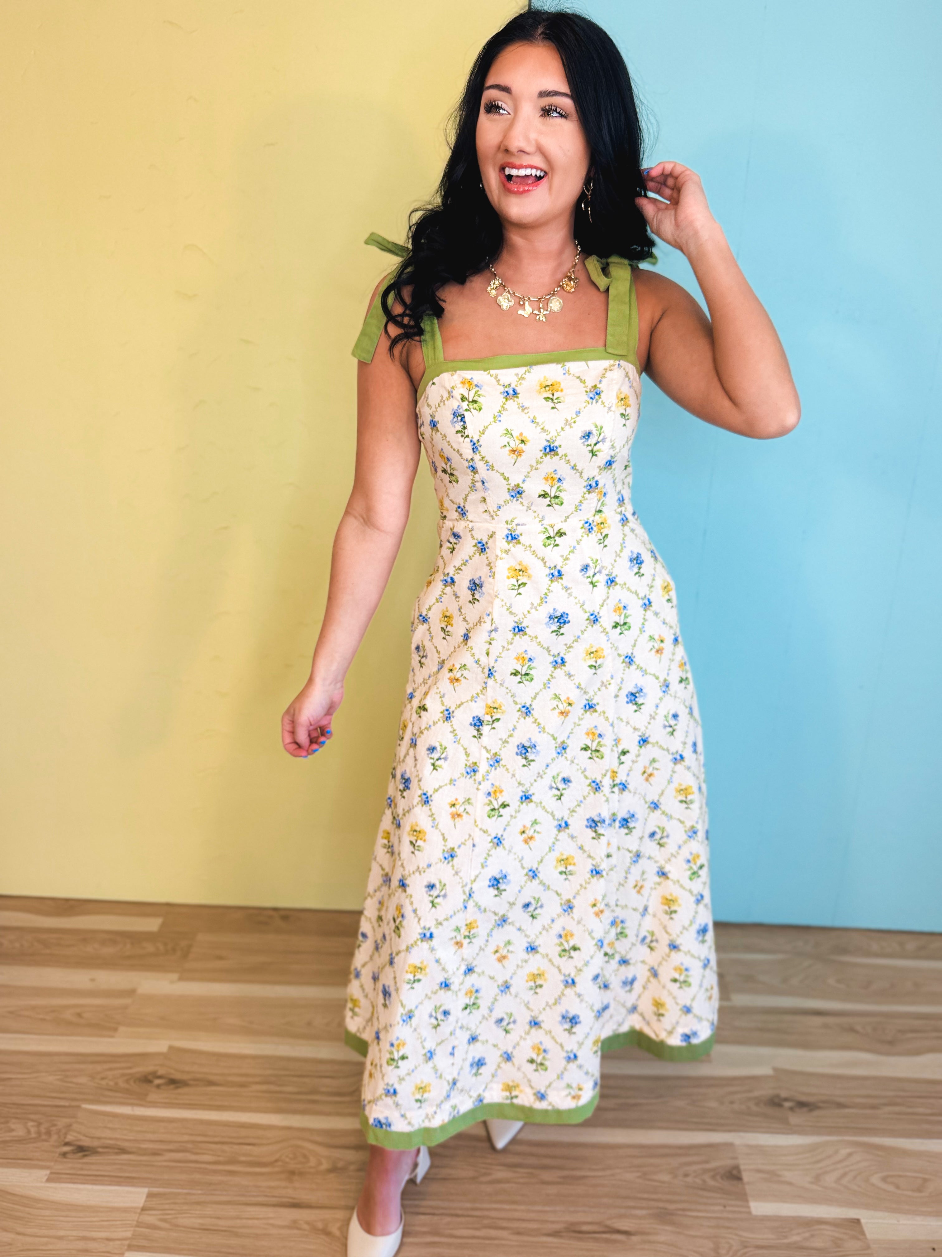A fresh floral maxi dress perfect for sunny days and warm weather outings. The contrast trim and shoulder tie details add a charming touch while the smocked back provides a comfortable fit.