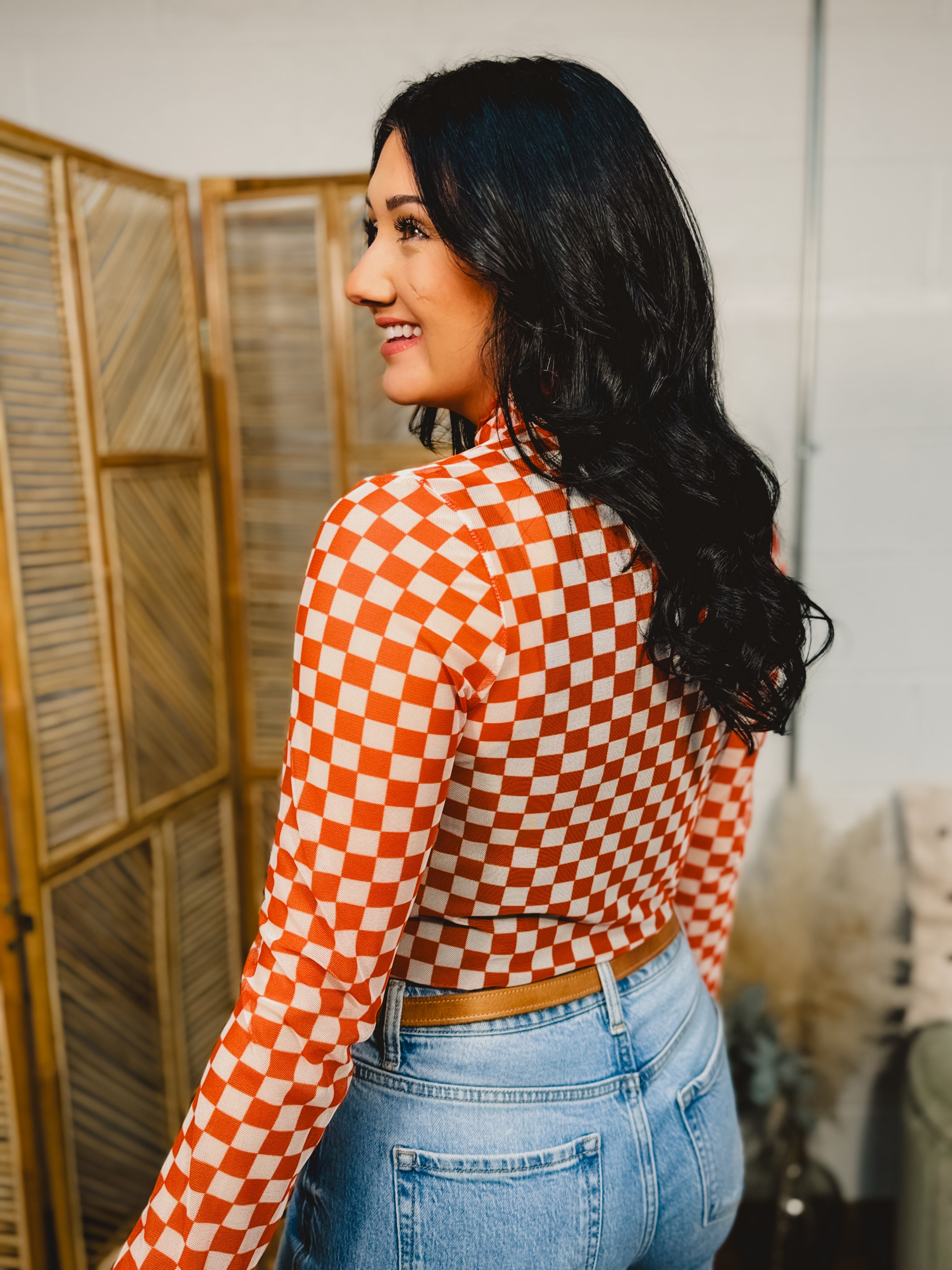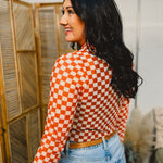 This orange checkered mesh mock neck top adds a bold, trendy edge that’s perfect for layering or making a statement on its own. We love it paired with a Bengals graphic tee!