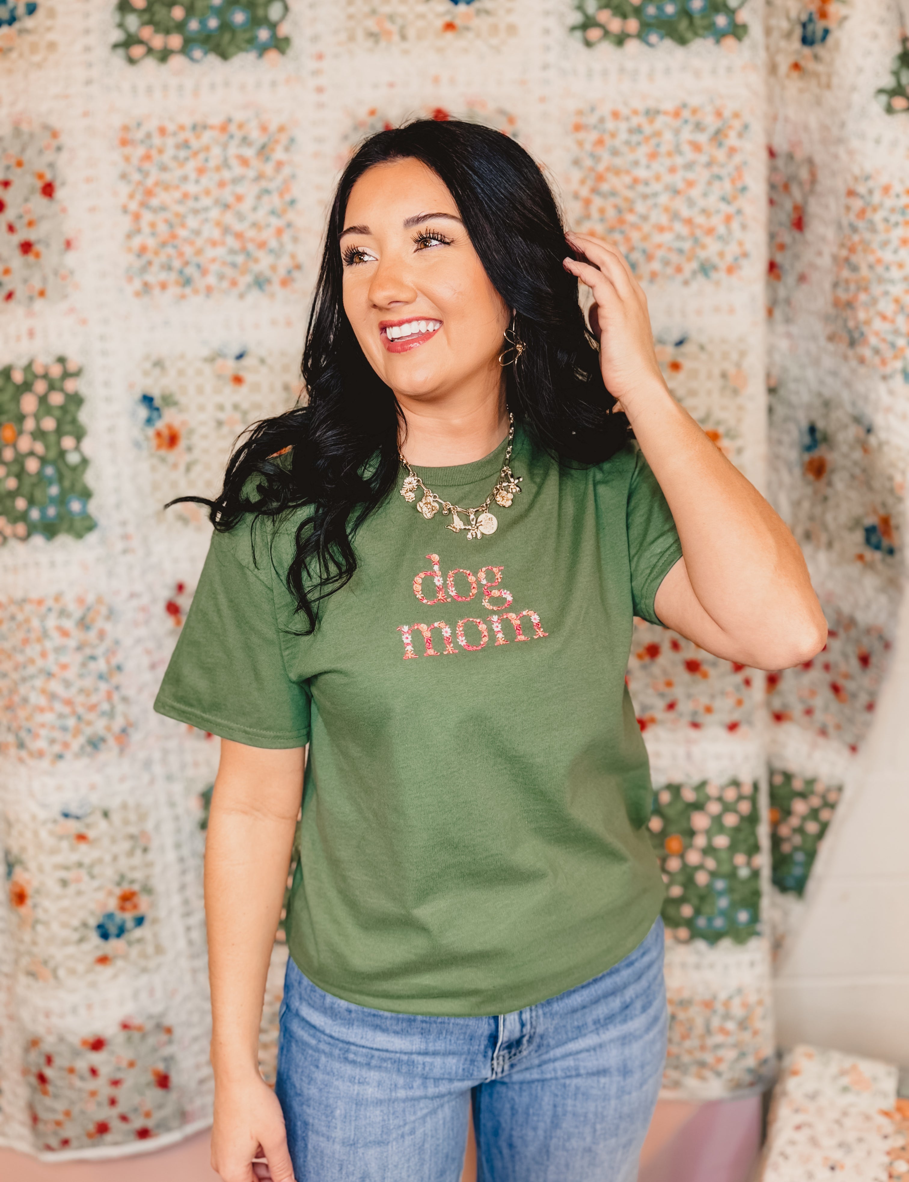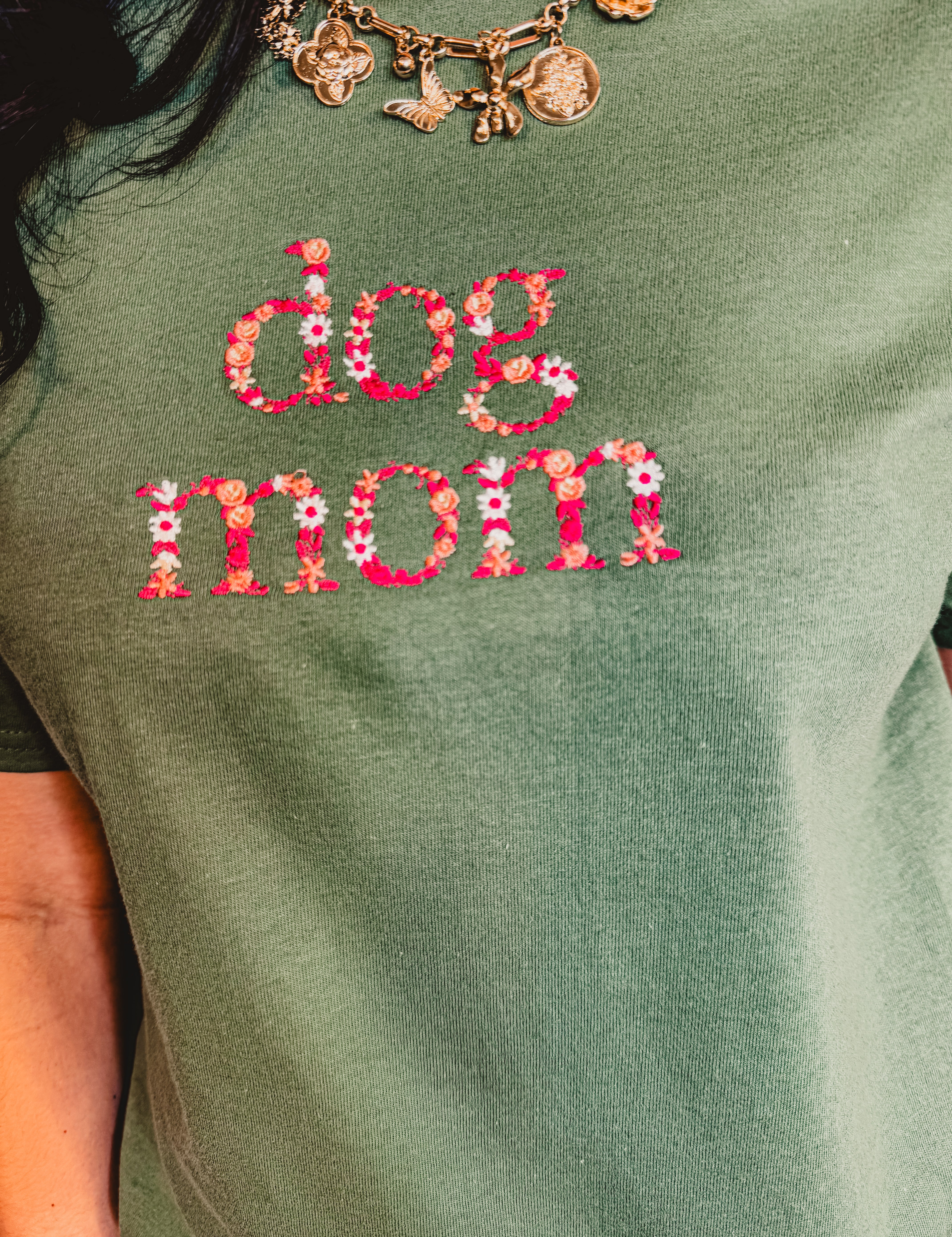 Embroidered Floral Dog Mom Graphic Tee - Sage