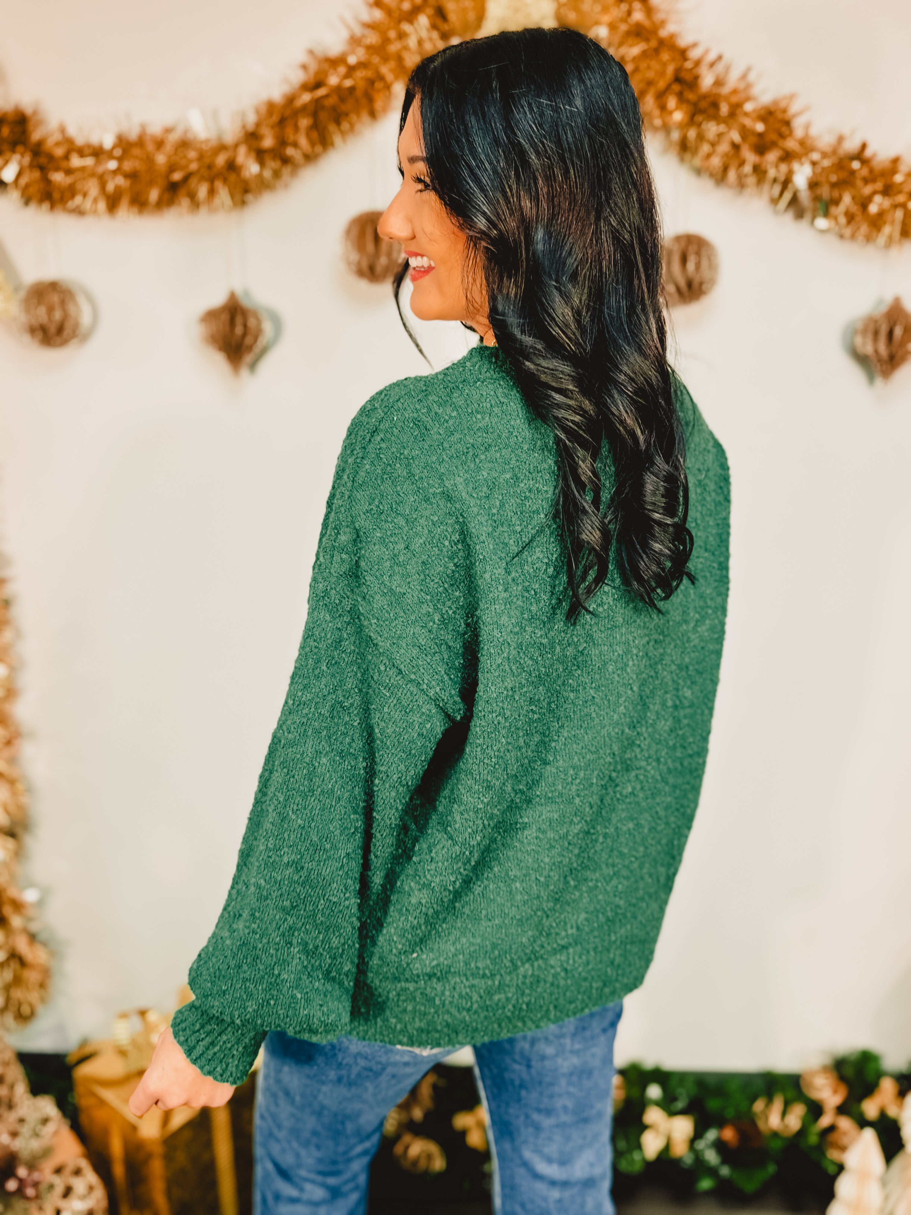 Playful and festive, this green sweater features a sparkling sequin snowman with “Ho Ho Ho” detailing — a cheerful must-have for the holiday season!