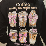 - Front, back, and sleeve graphics featuring the fun phrase: “Coffee makes me much nicer”