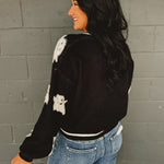 Add some playful spooky style to your wardrobe with this cozy knit cardigan featuring happy ghost patches. A button-up design makes it easy to wear layered or on its own.
