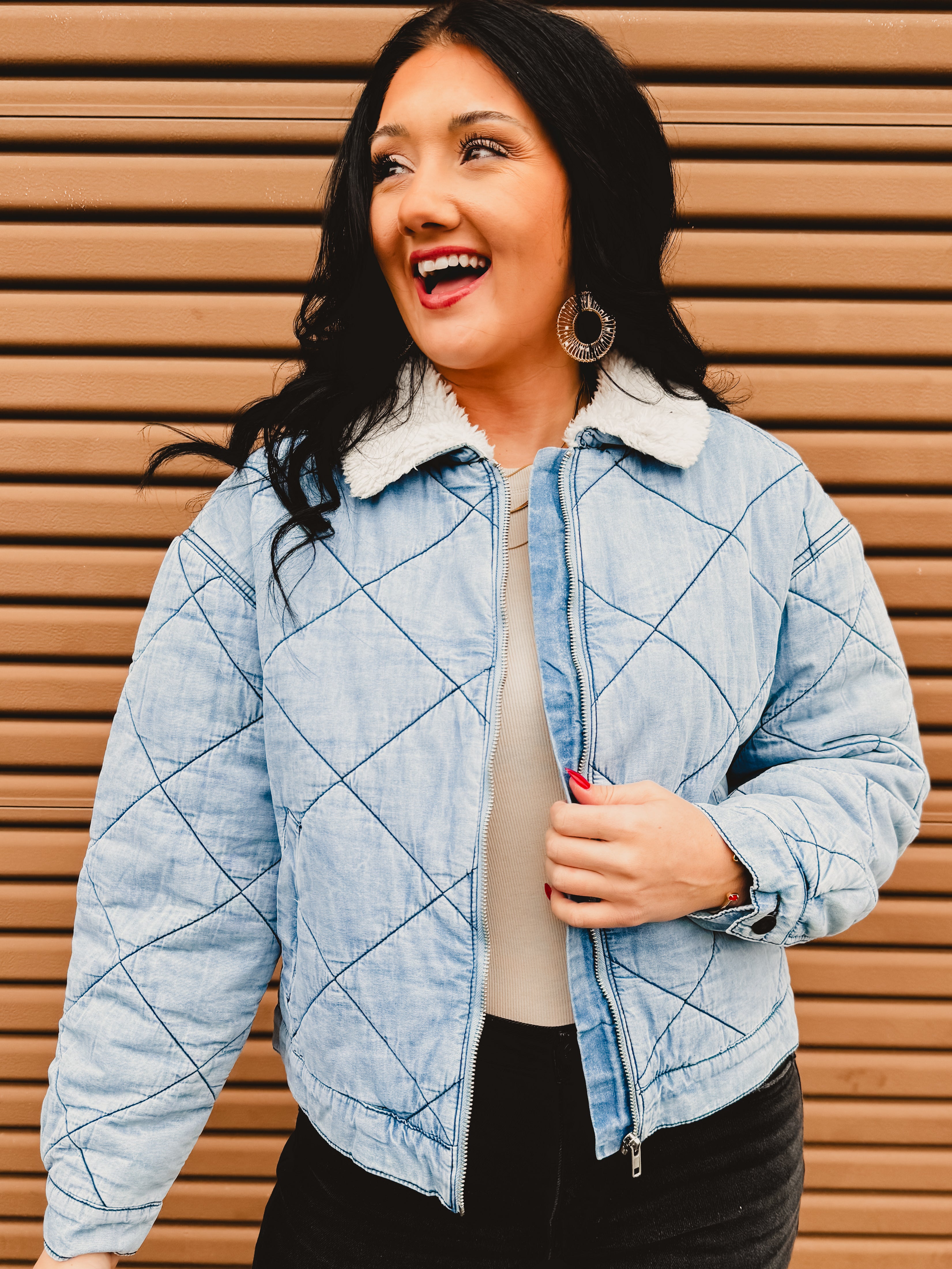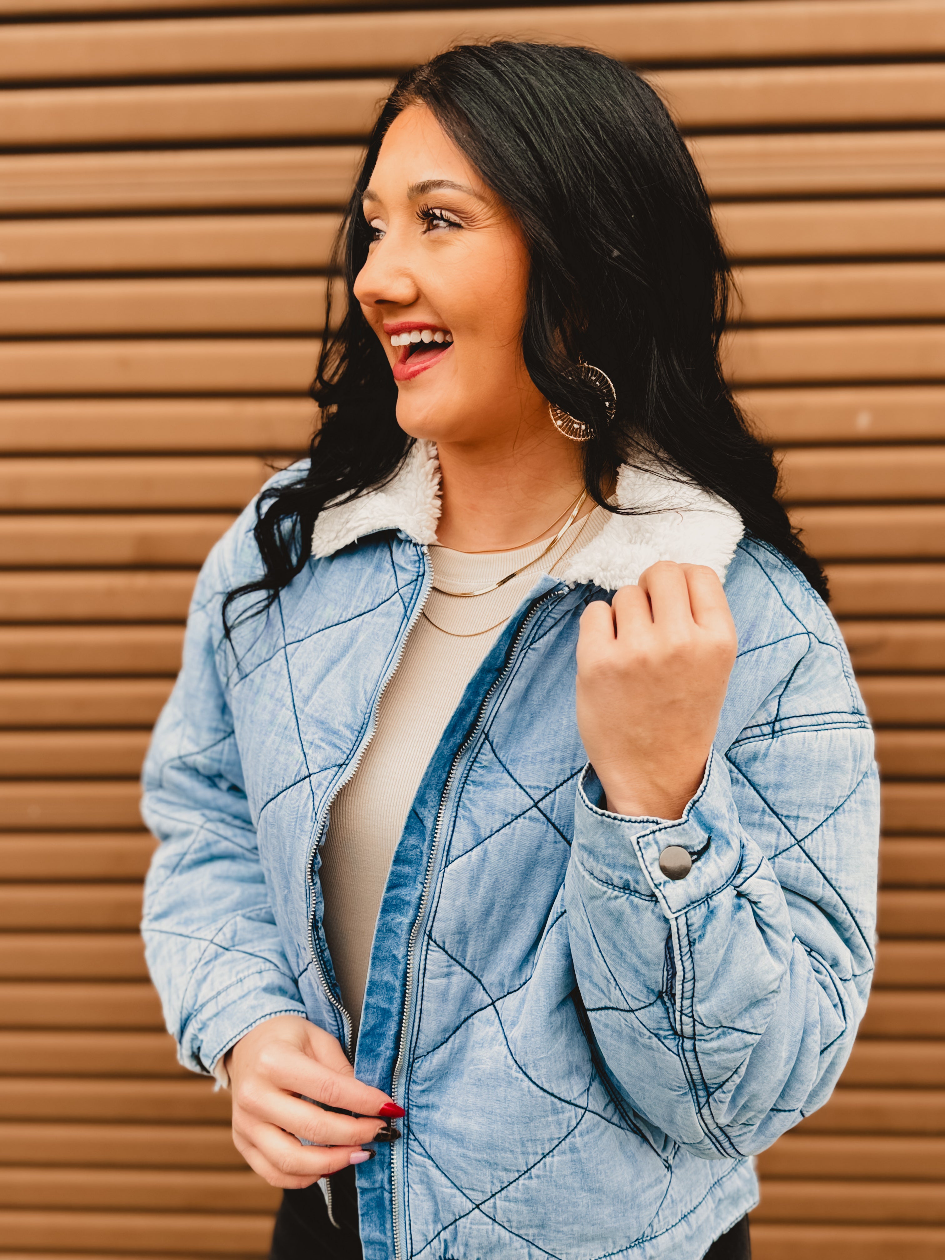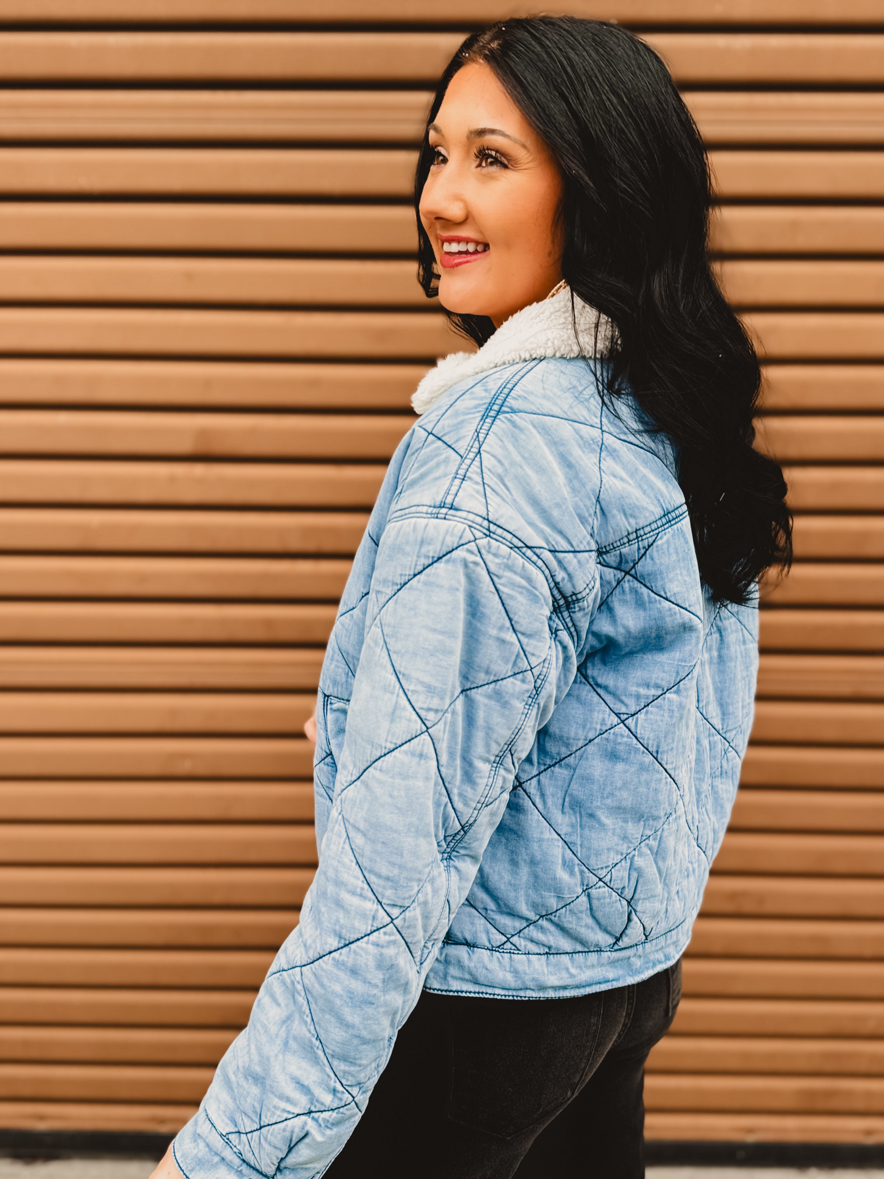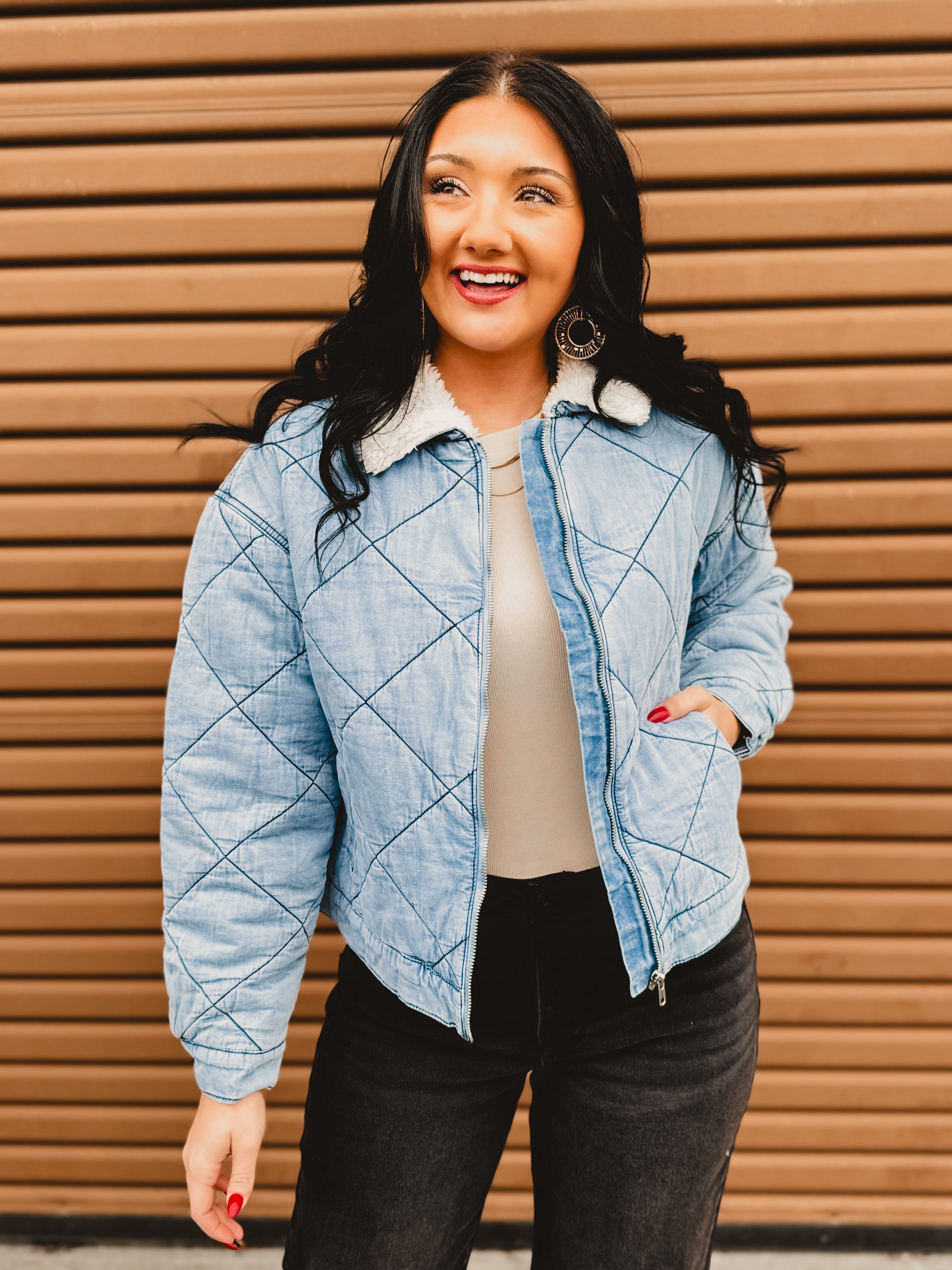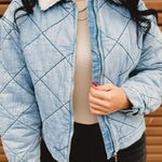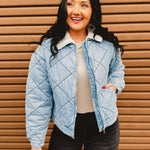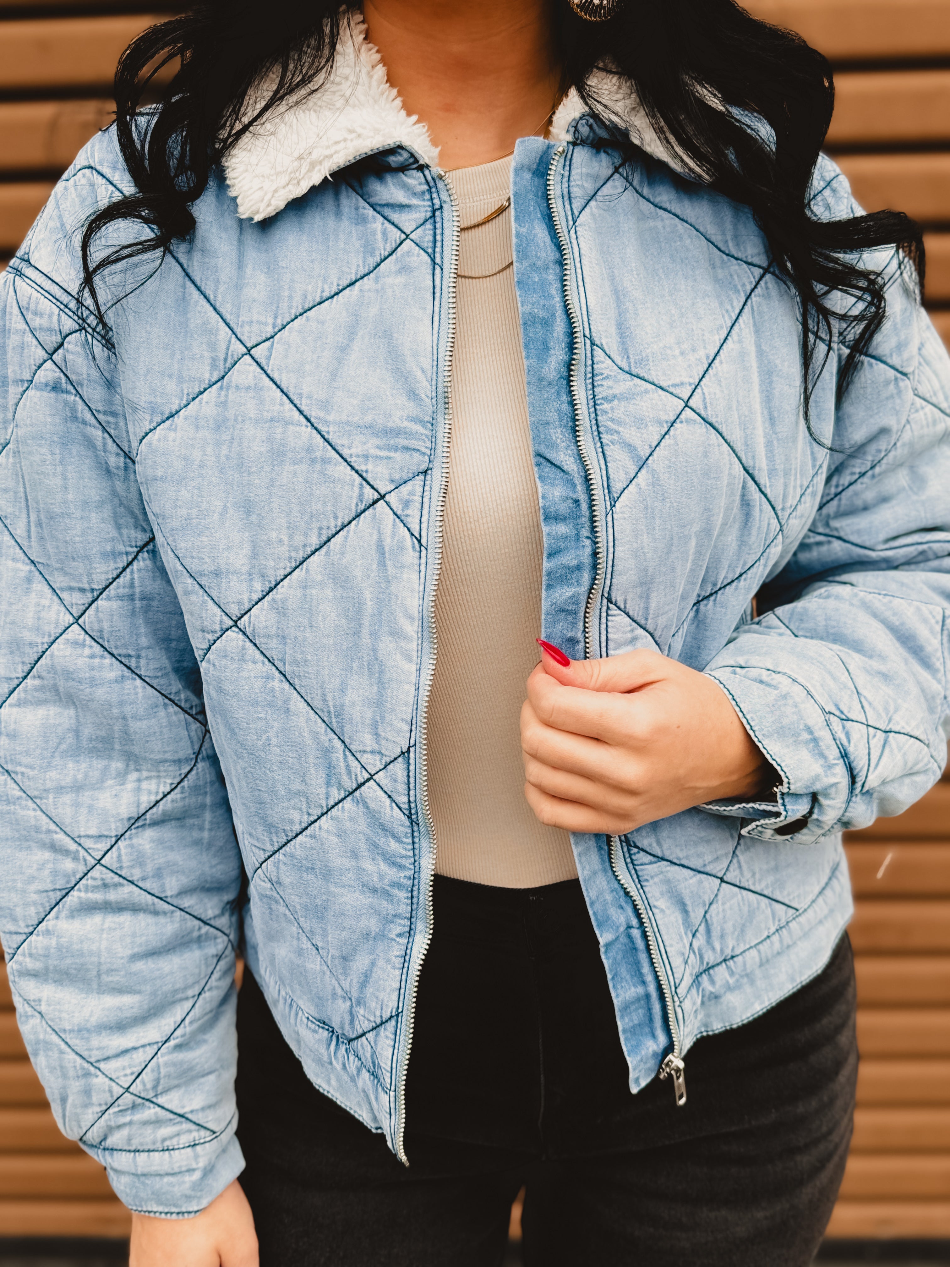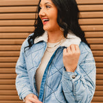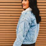 Cozy meets cool with this effortlessly stylish quilted denim jacket. Designed with soft contrast sherpa at the collar and a classic zip-up front, it’s the perfect layering piece for crisp days when you want warmth without sacrificing style. Easy to dress up or down, this jacket is a must-have for fall and winter.