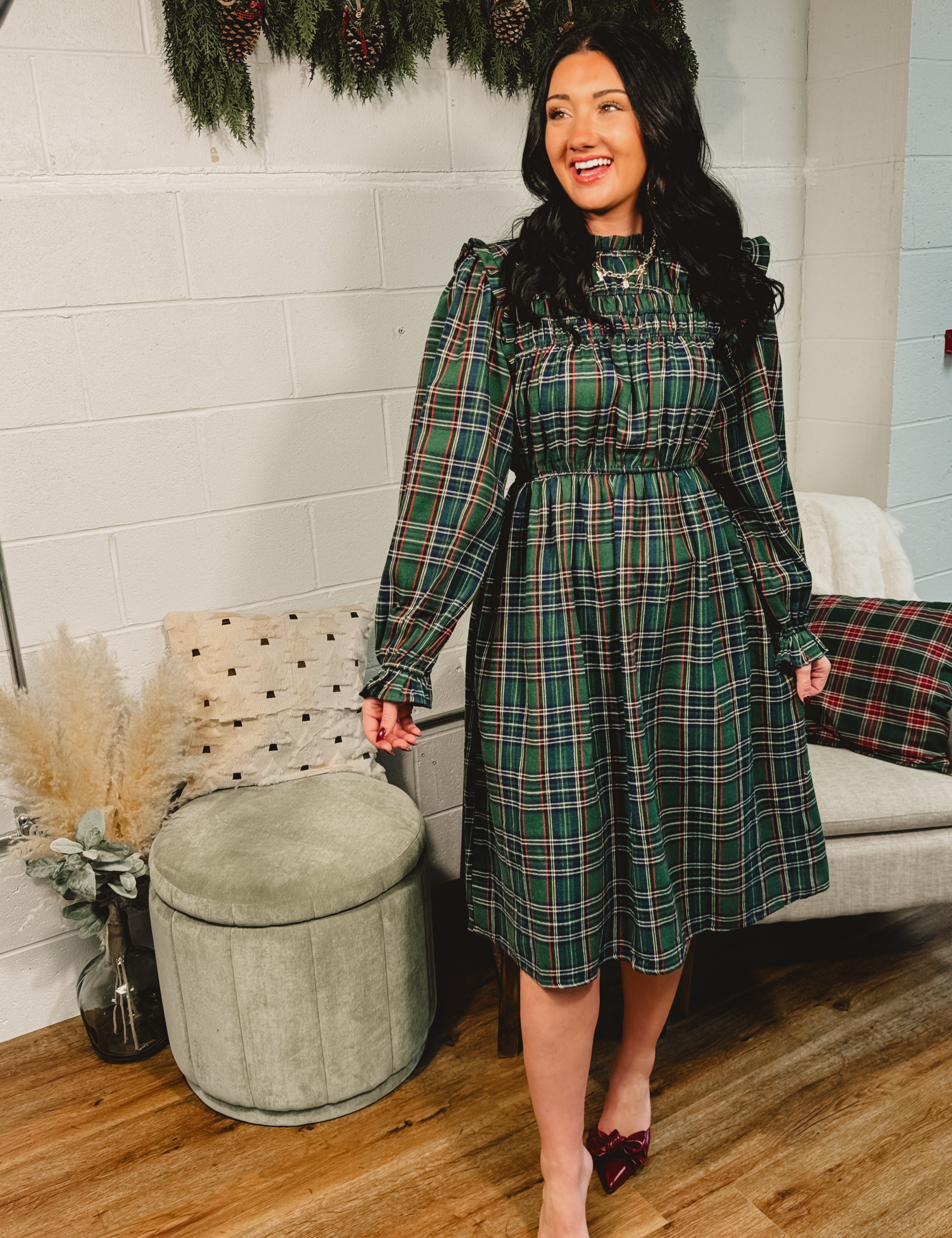 Plaid Mock Neck Long Sleeve Midi Dress - Hunter Green