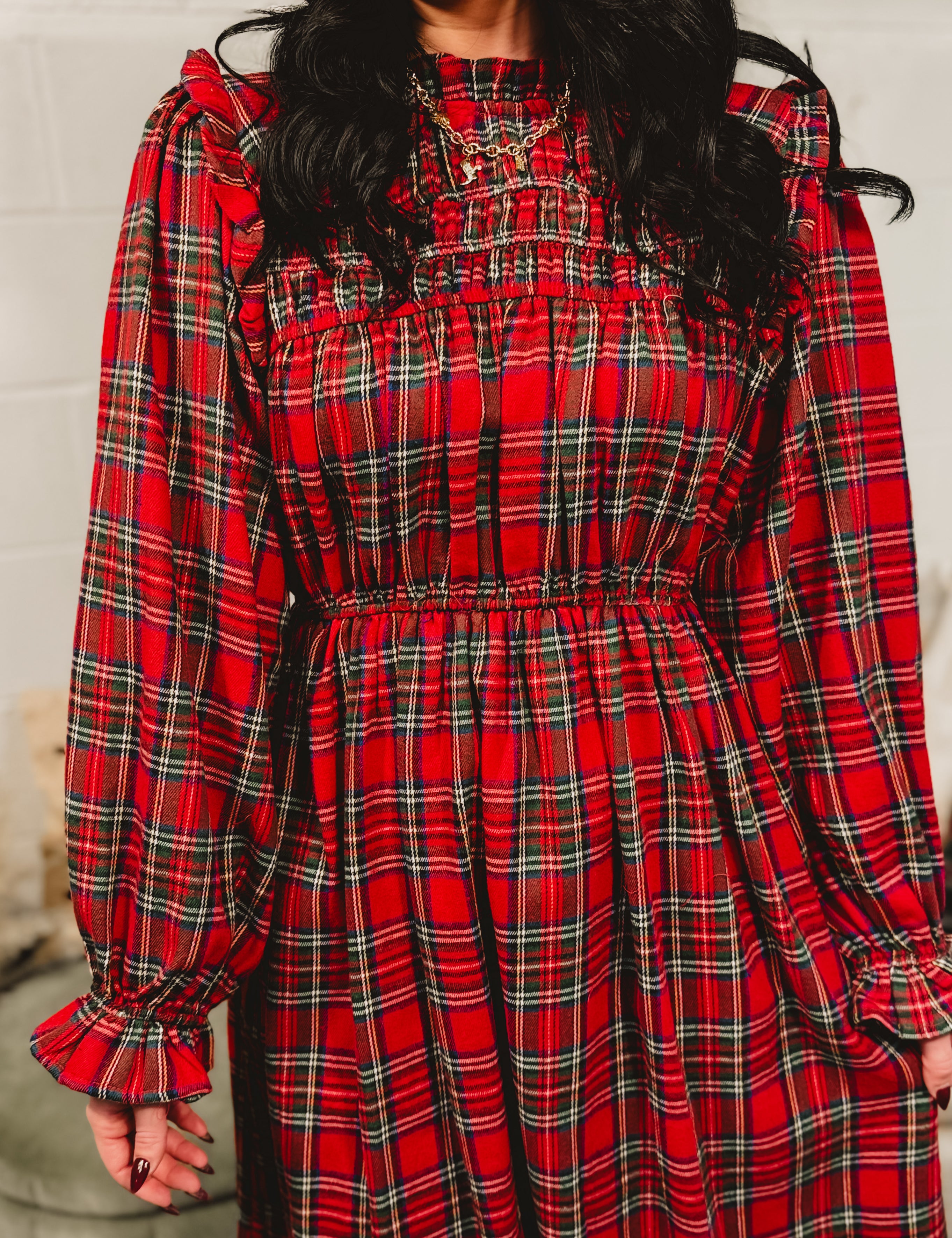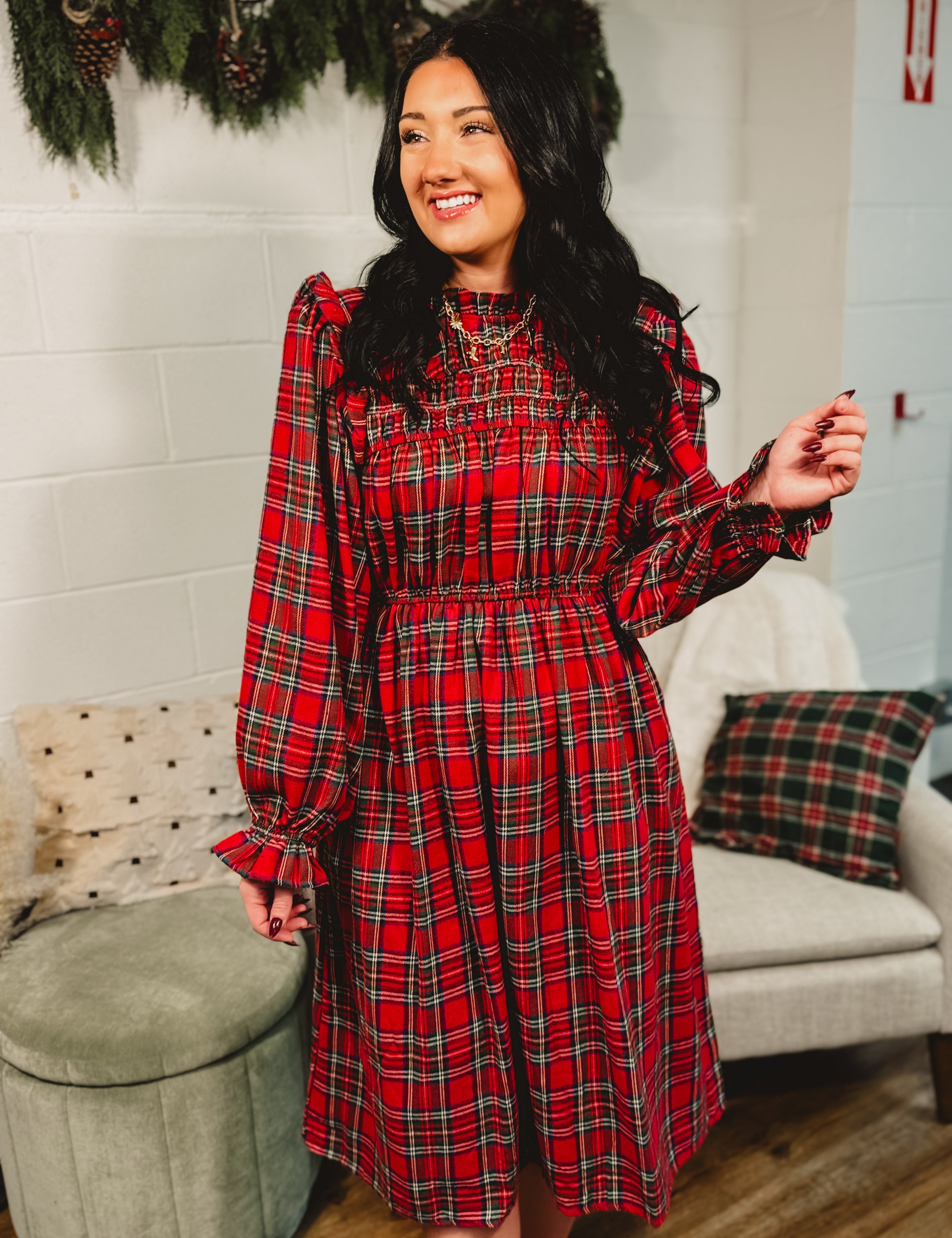 Plaid Mock Neck Long Sleeve Midi Dress - Red