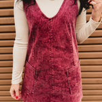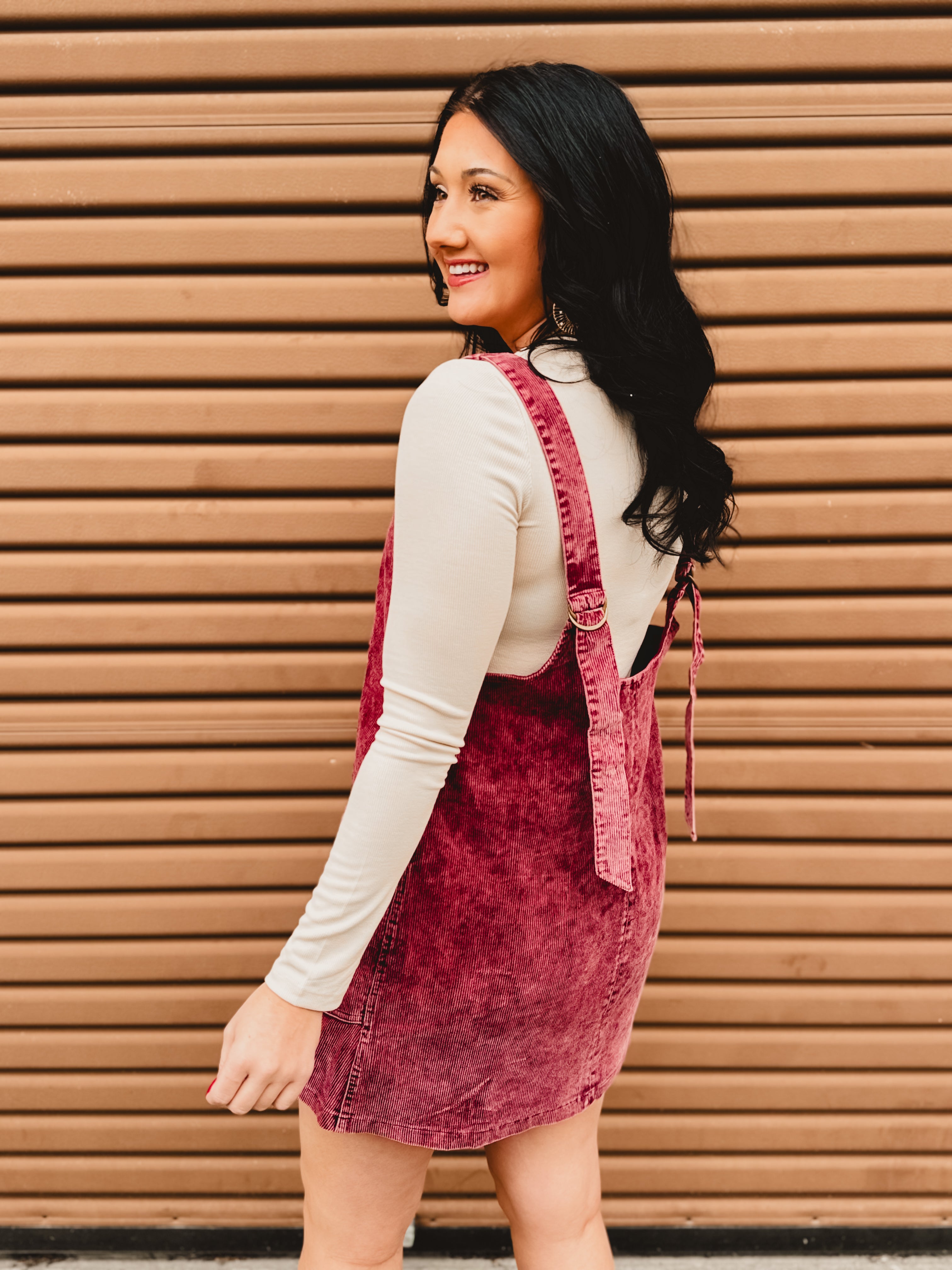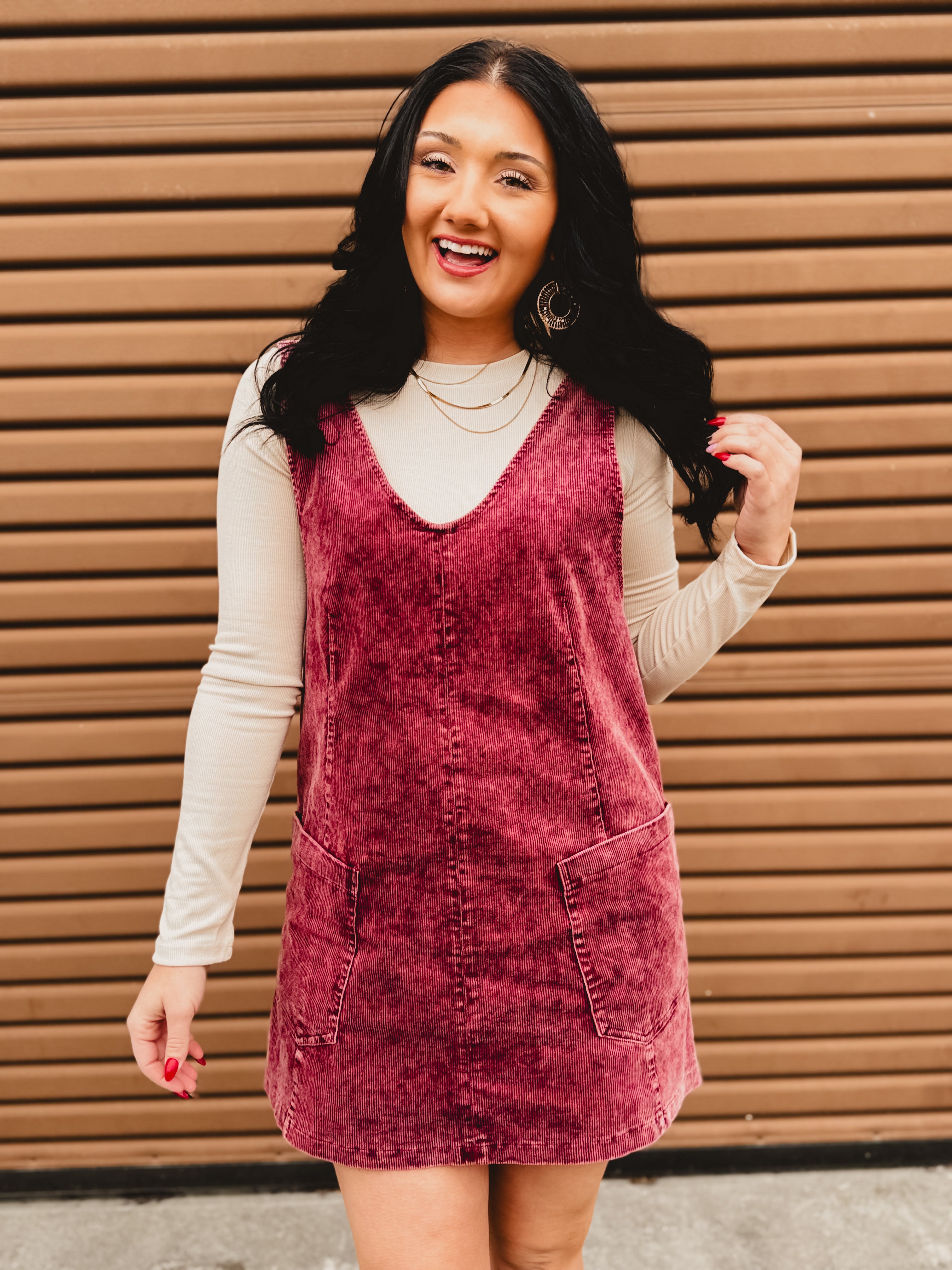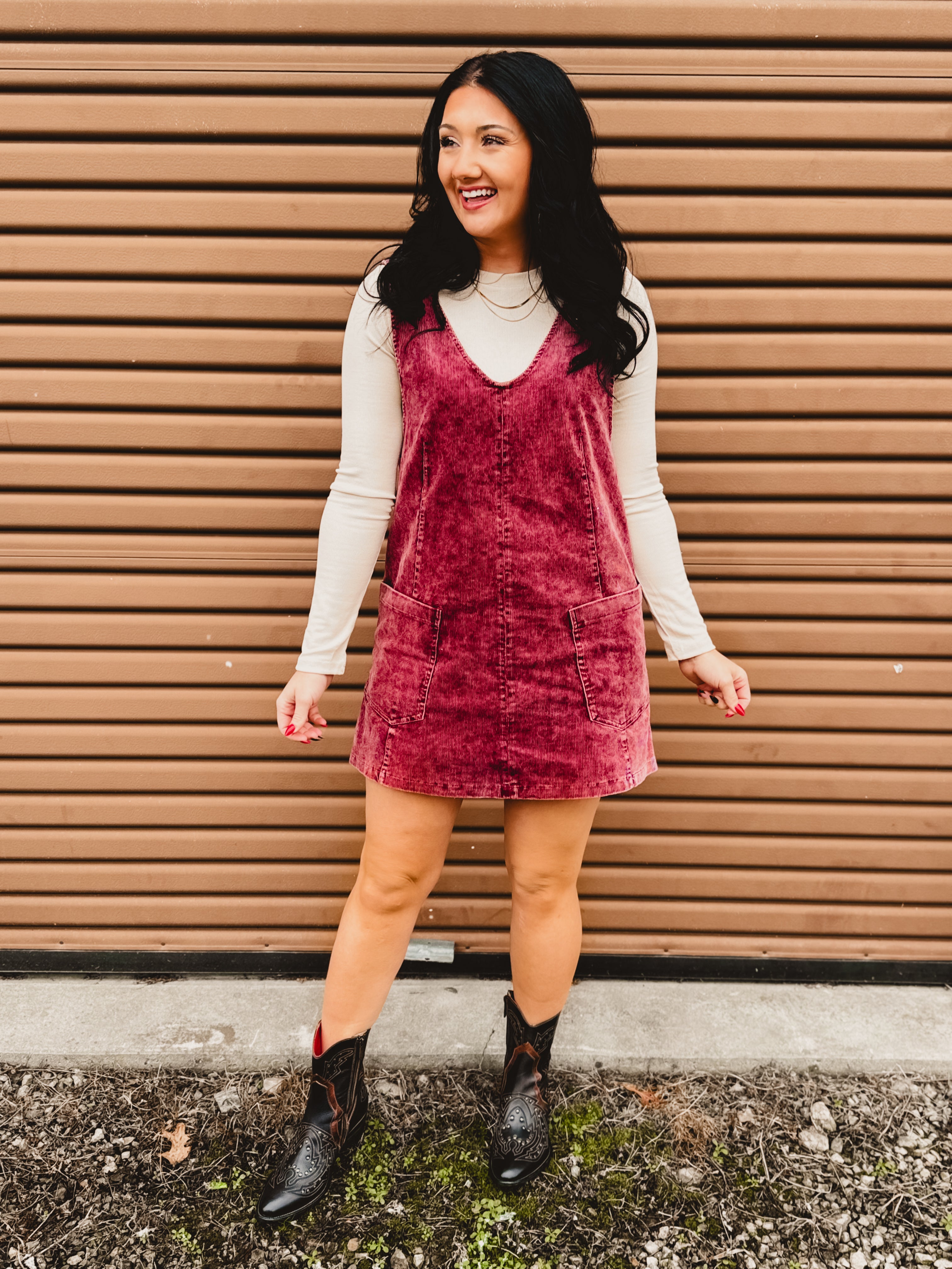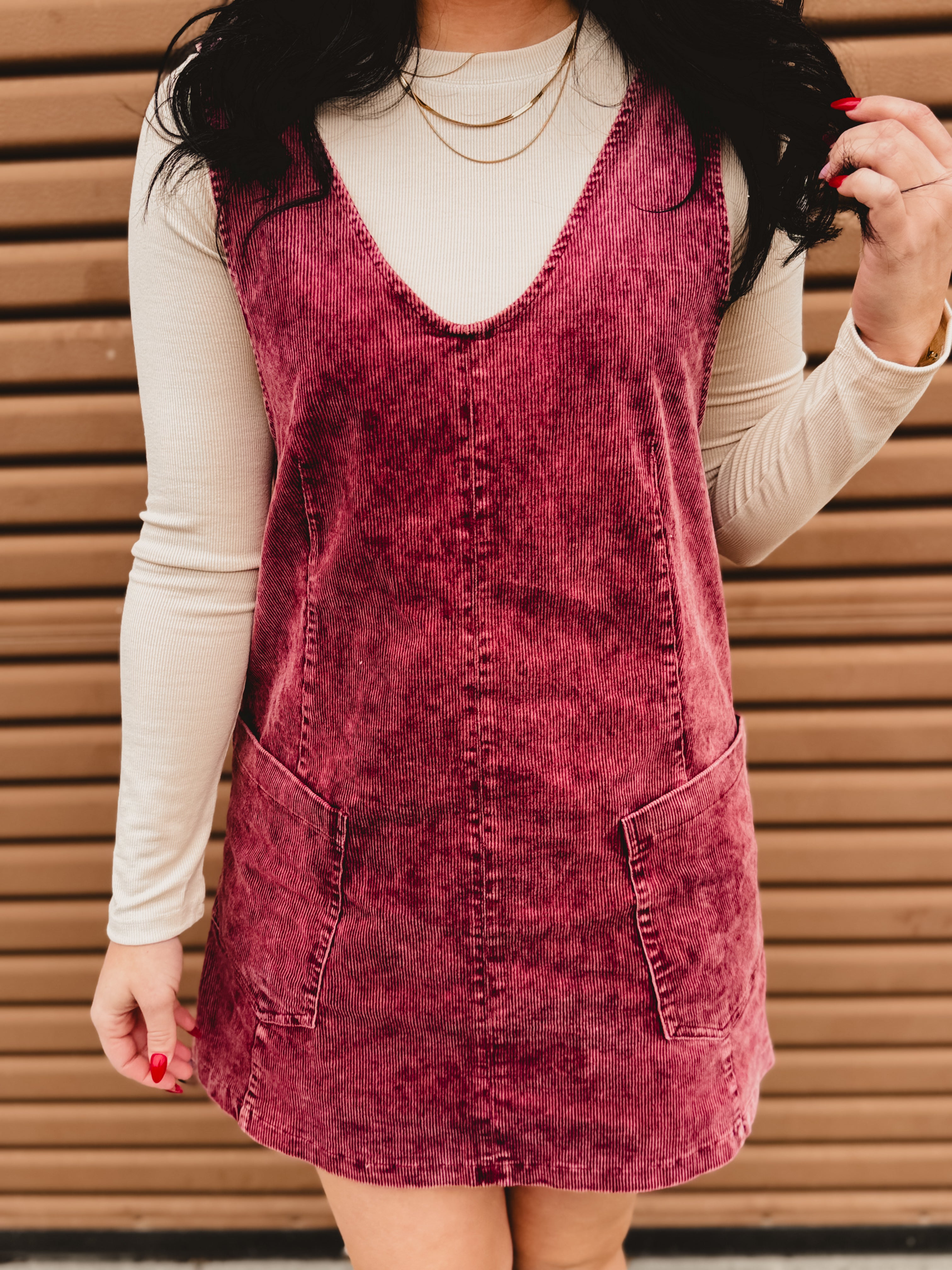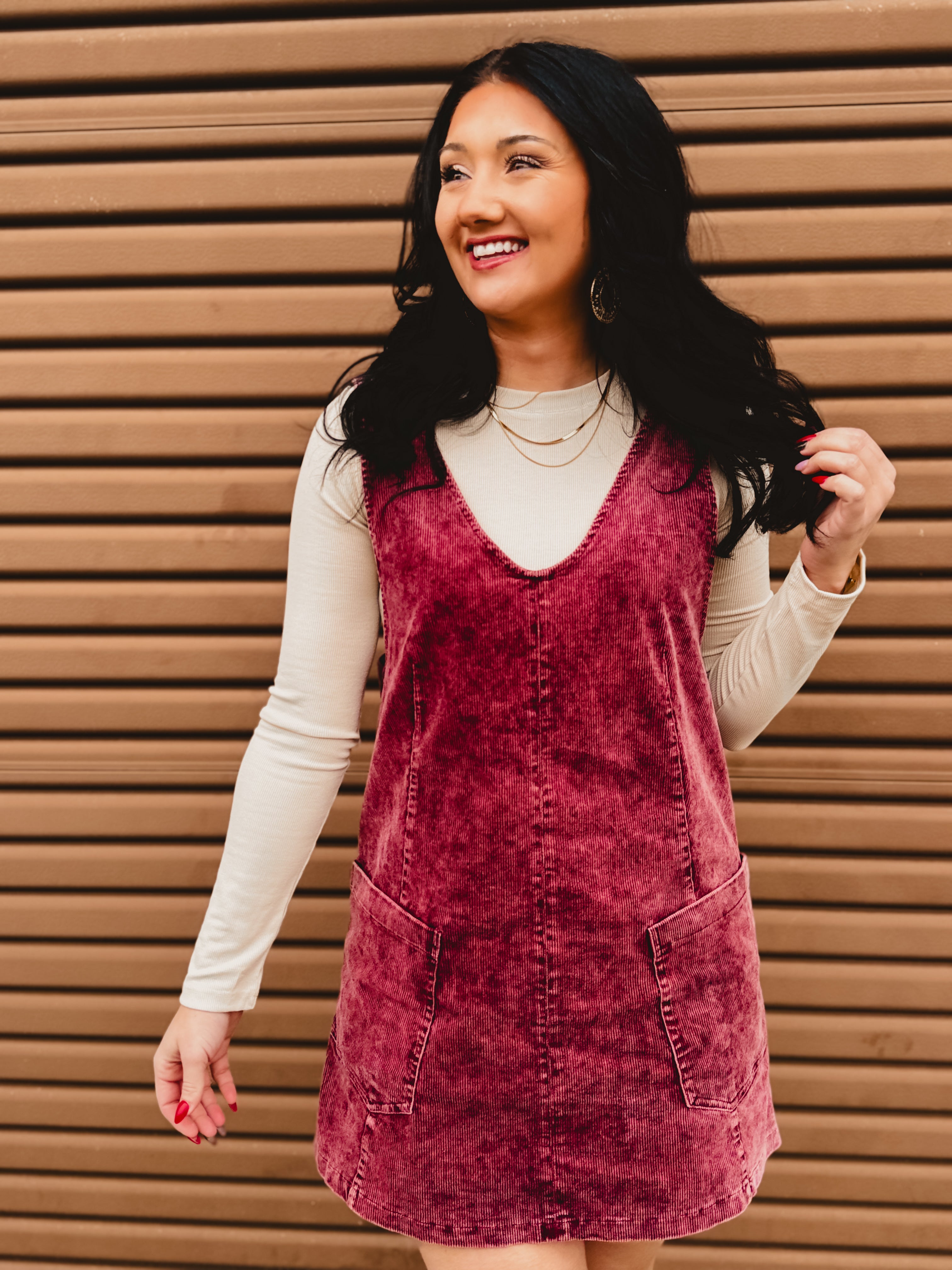 Soft, playful, and full of vintage charm, this snow-washed corduroy pinafore dress is the perfect layering piece for every season. Its easy silhouette and textured finish make it an effortless go-to for casual, cozy styling.