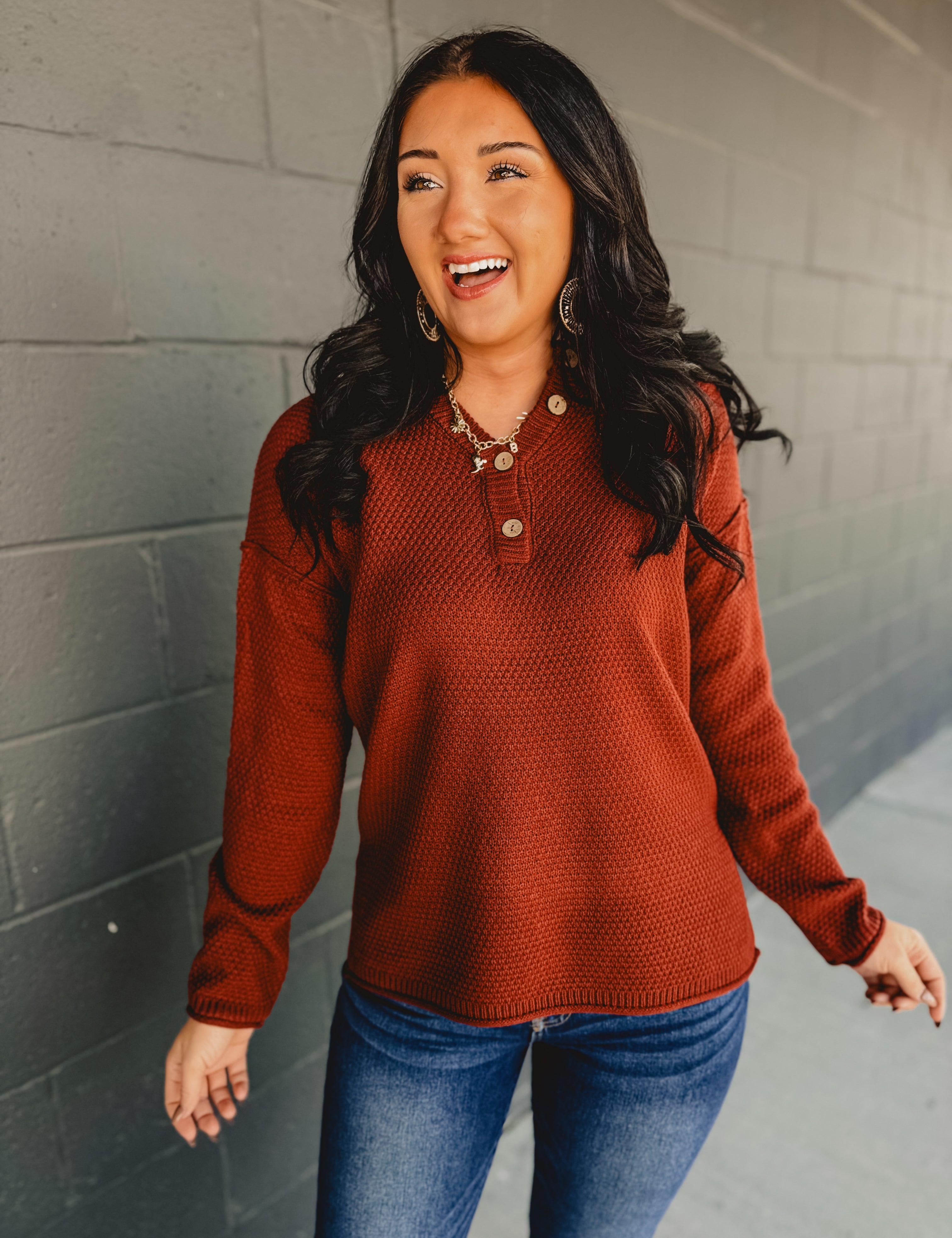 Henley Waffle Knit Long Sleeve Sweater - Dark Rust