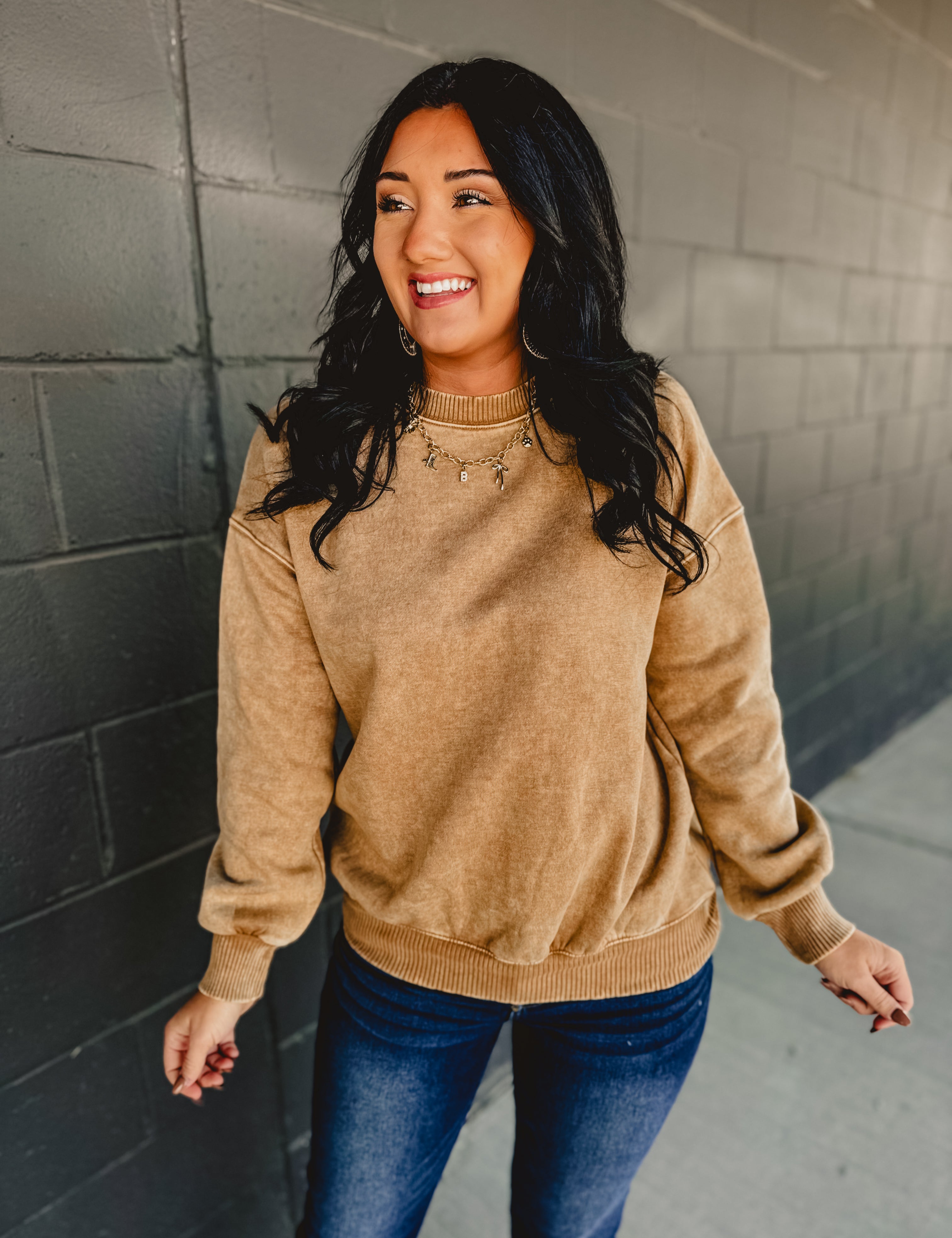Oversized Acid Washed Fleece Pullover - Deep Camel