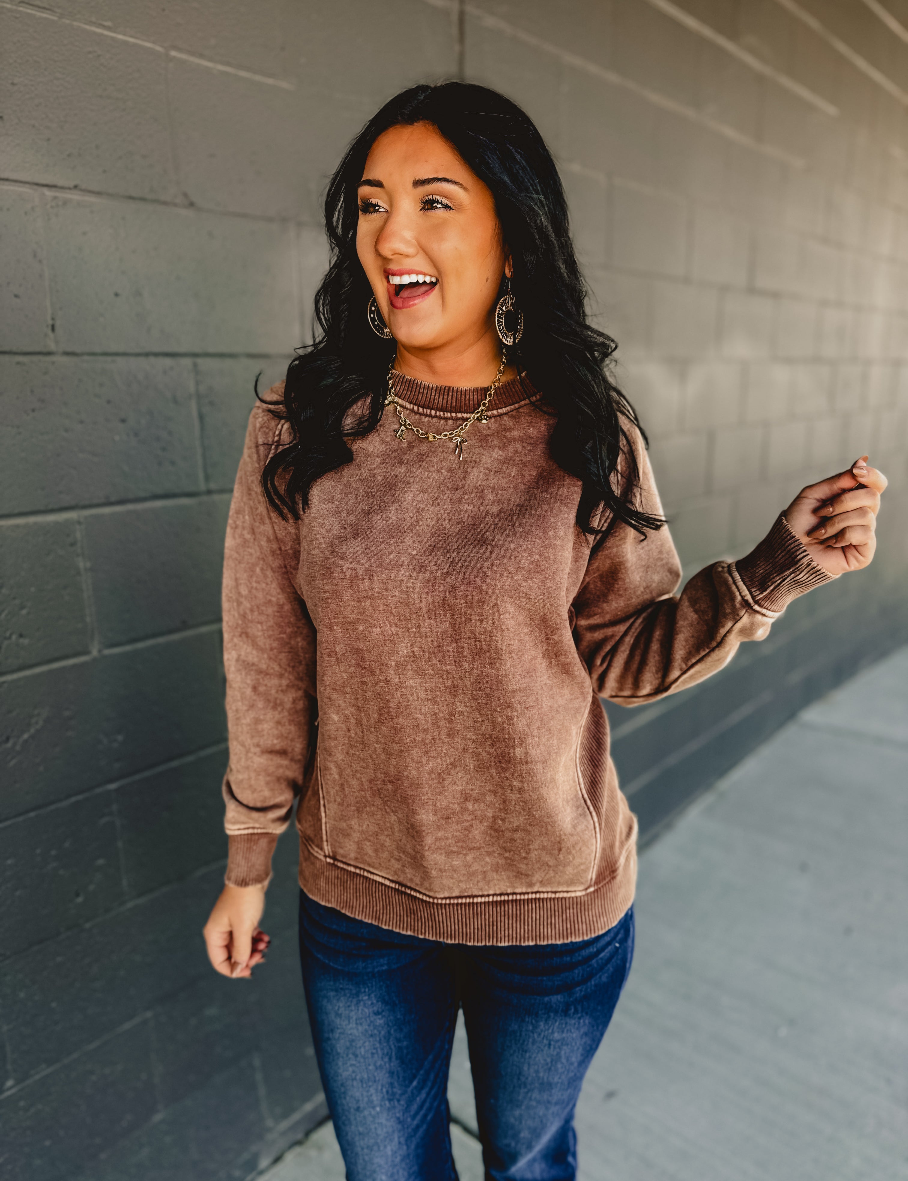 Acid Washed Fleece Crewneck Sweatshirt - Brown