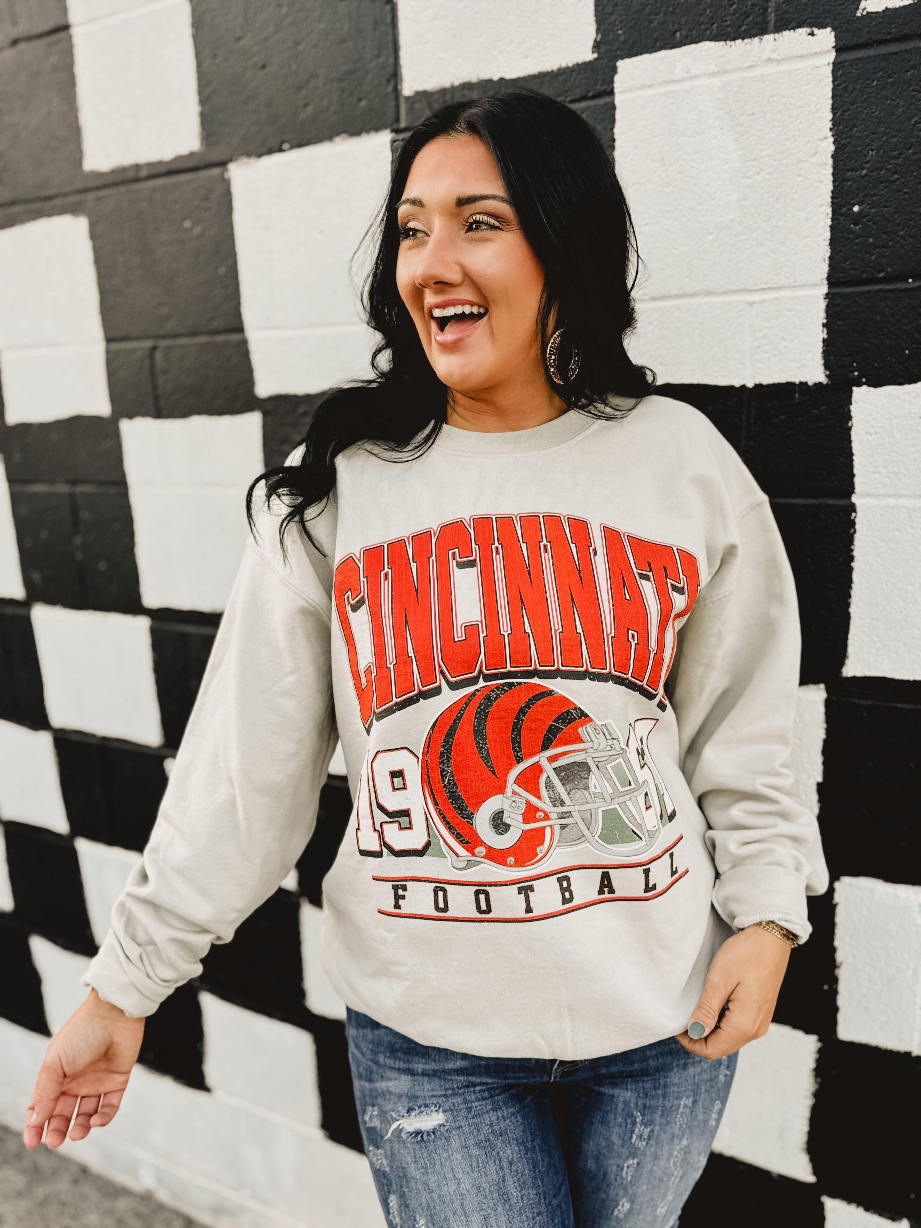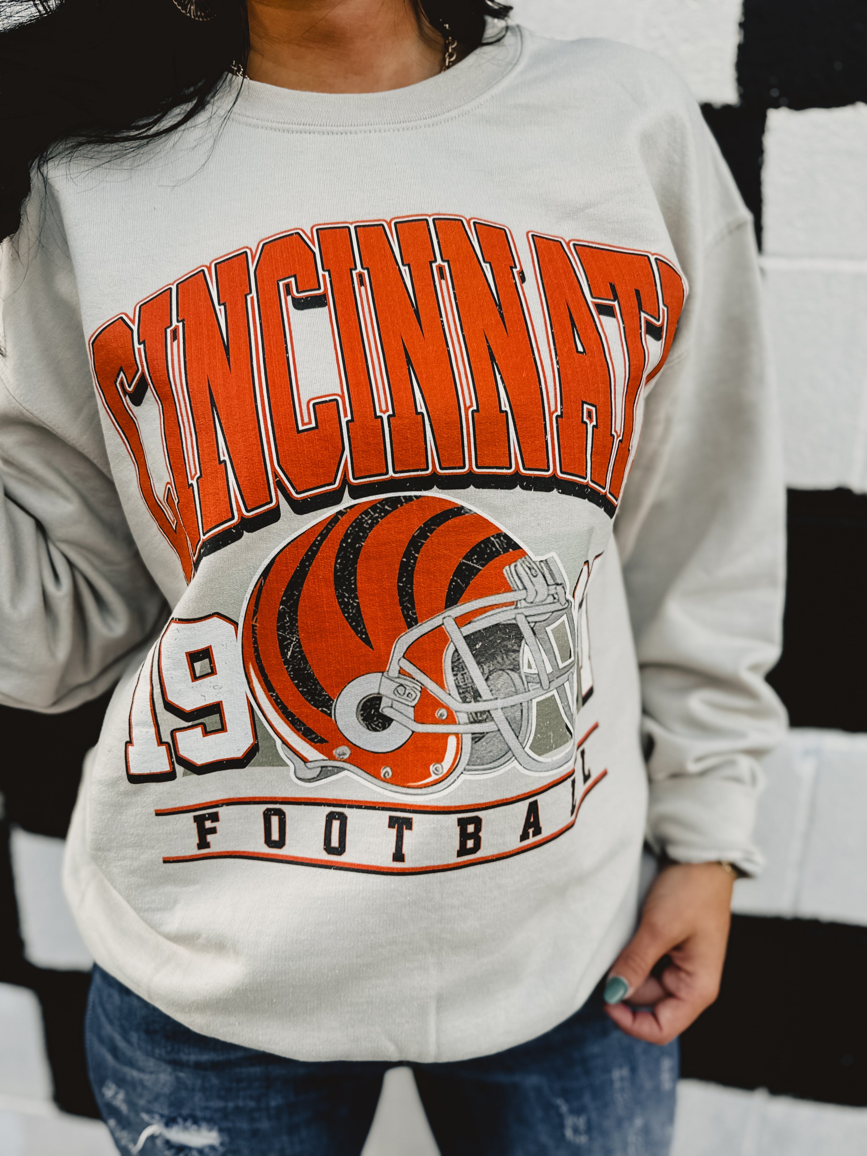 Celebrate your team in throwback style with this 90’s vintage Cincinnati football crewneck, designed in a classic sand hue for game day and beyond.