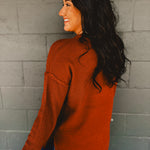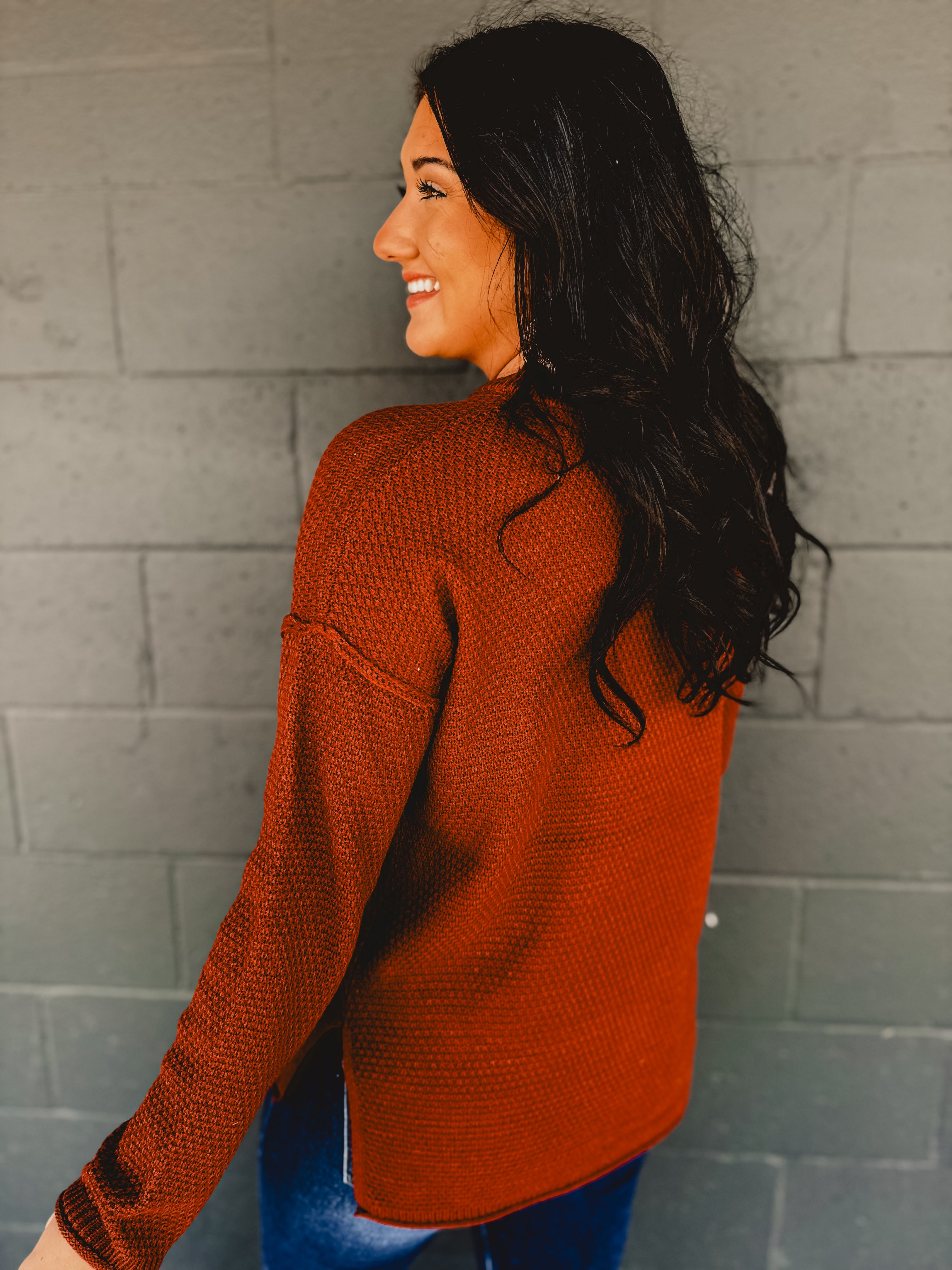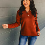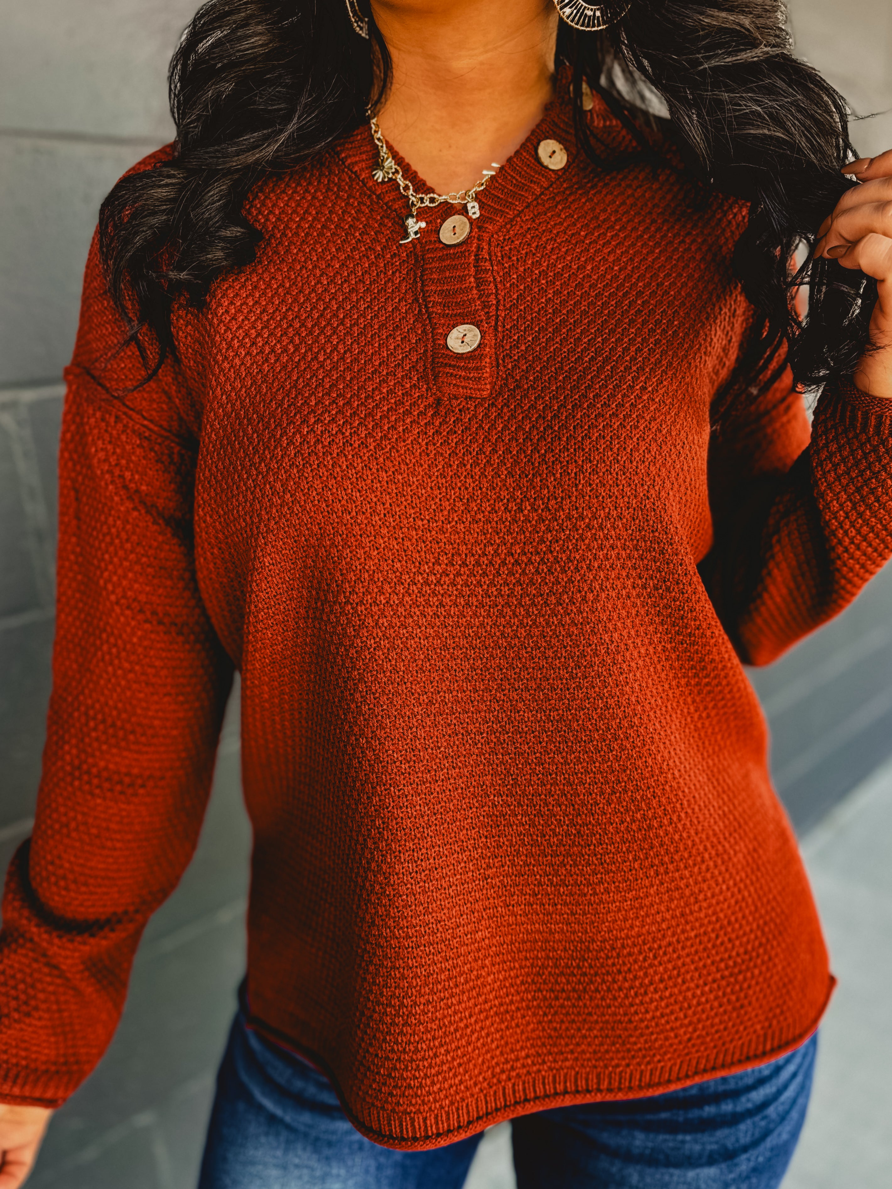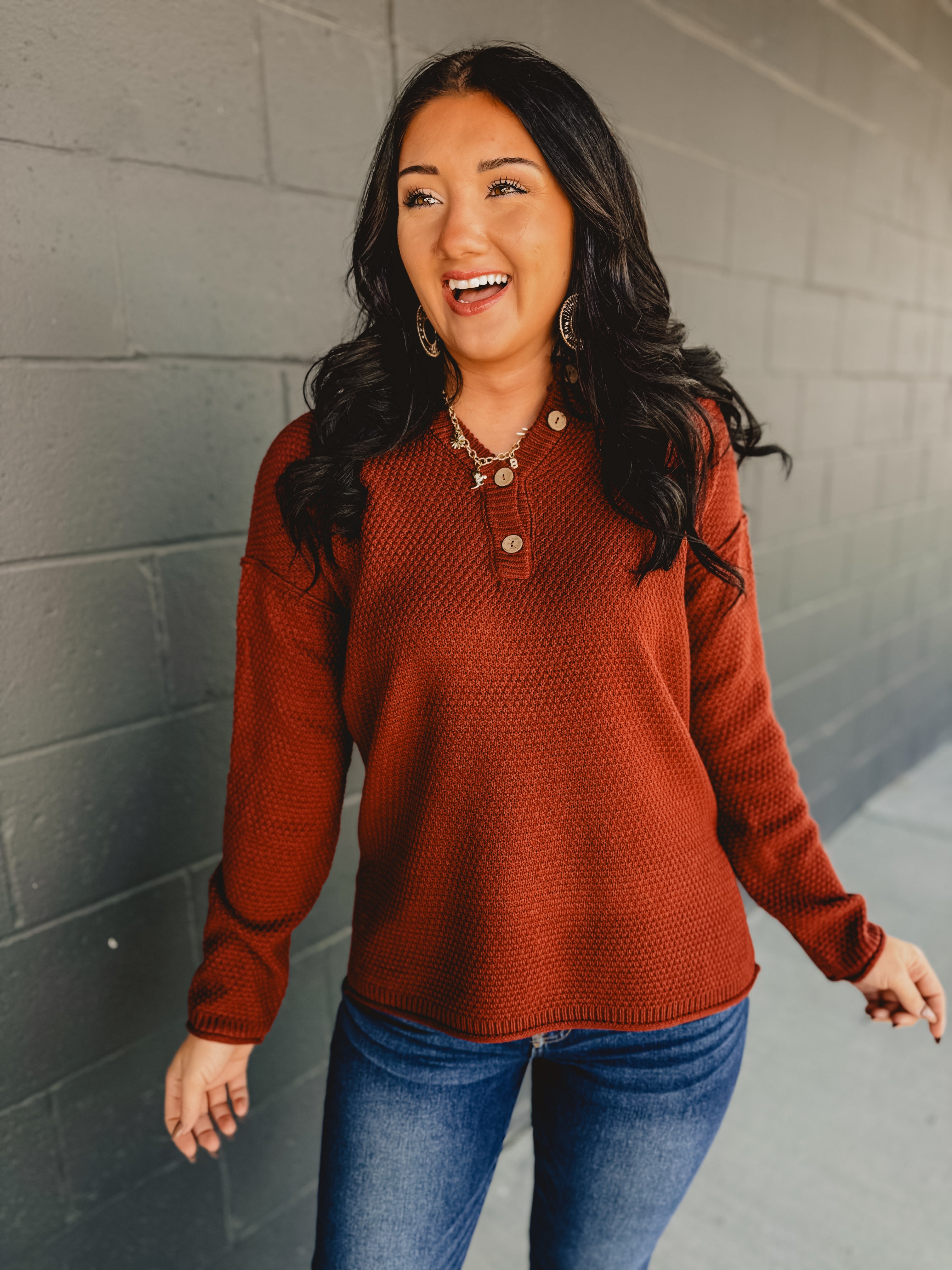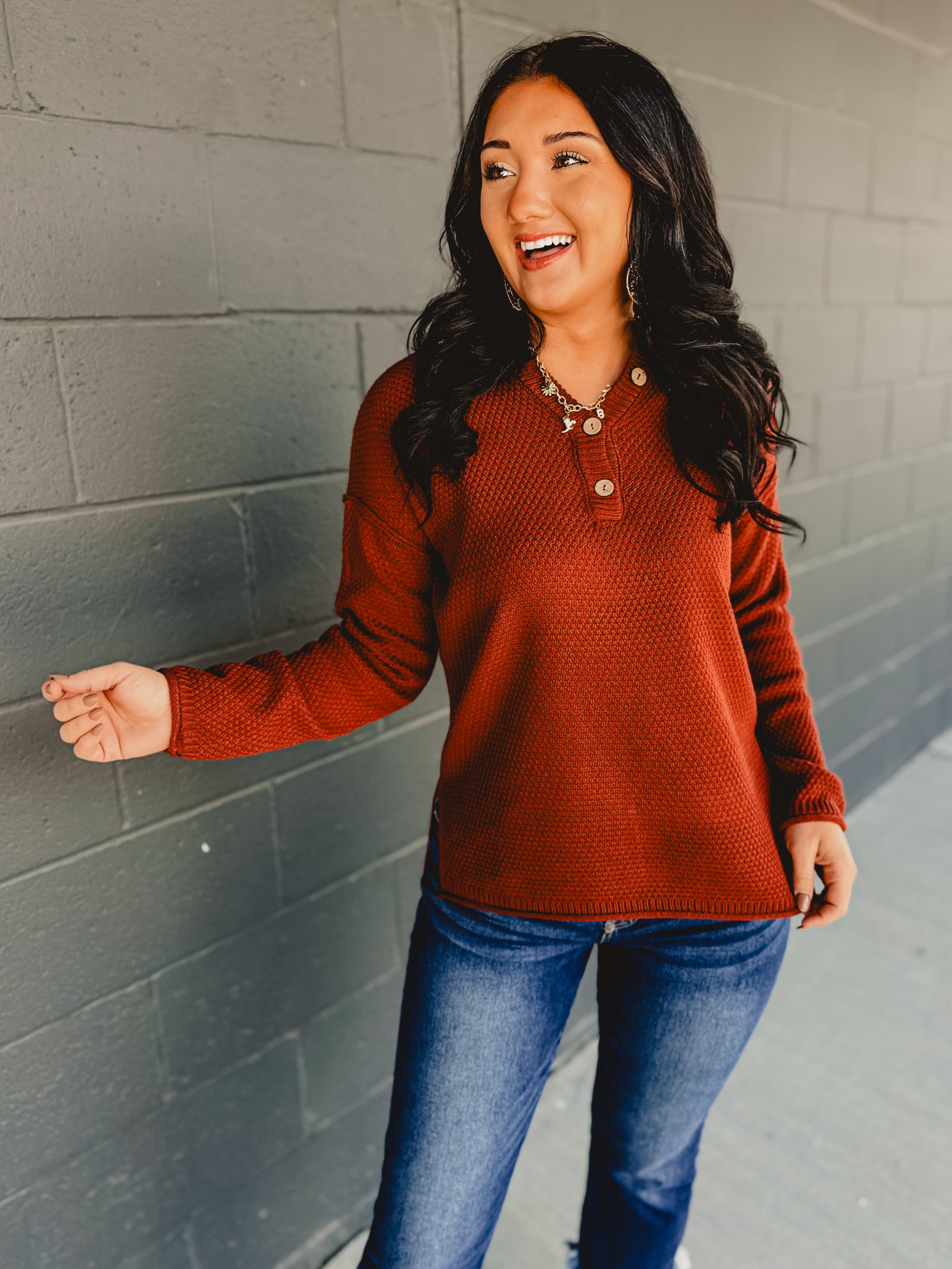 Henley Waffle Knit Long Sleeve Sweater - Dark Rust