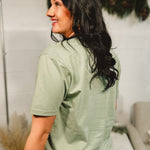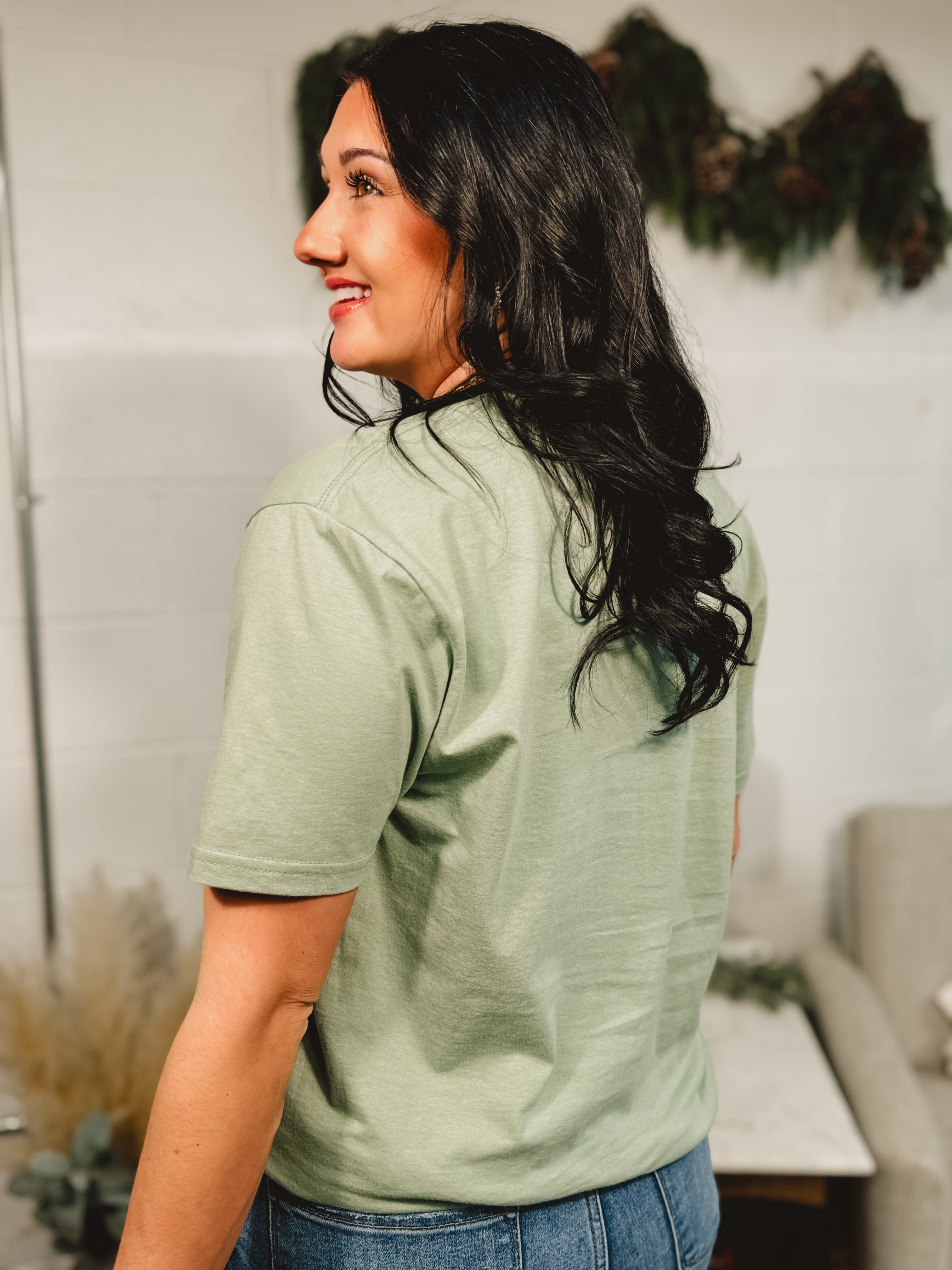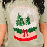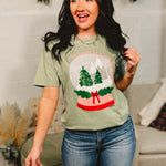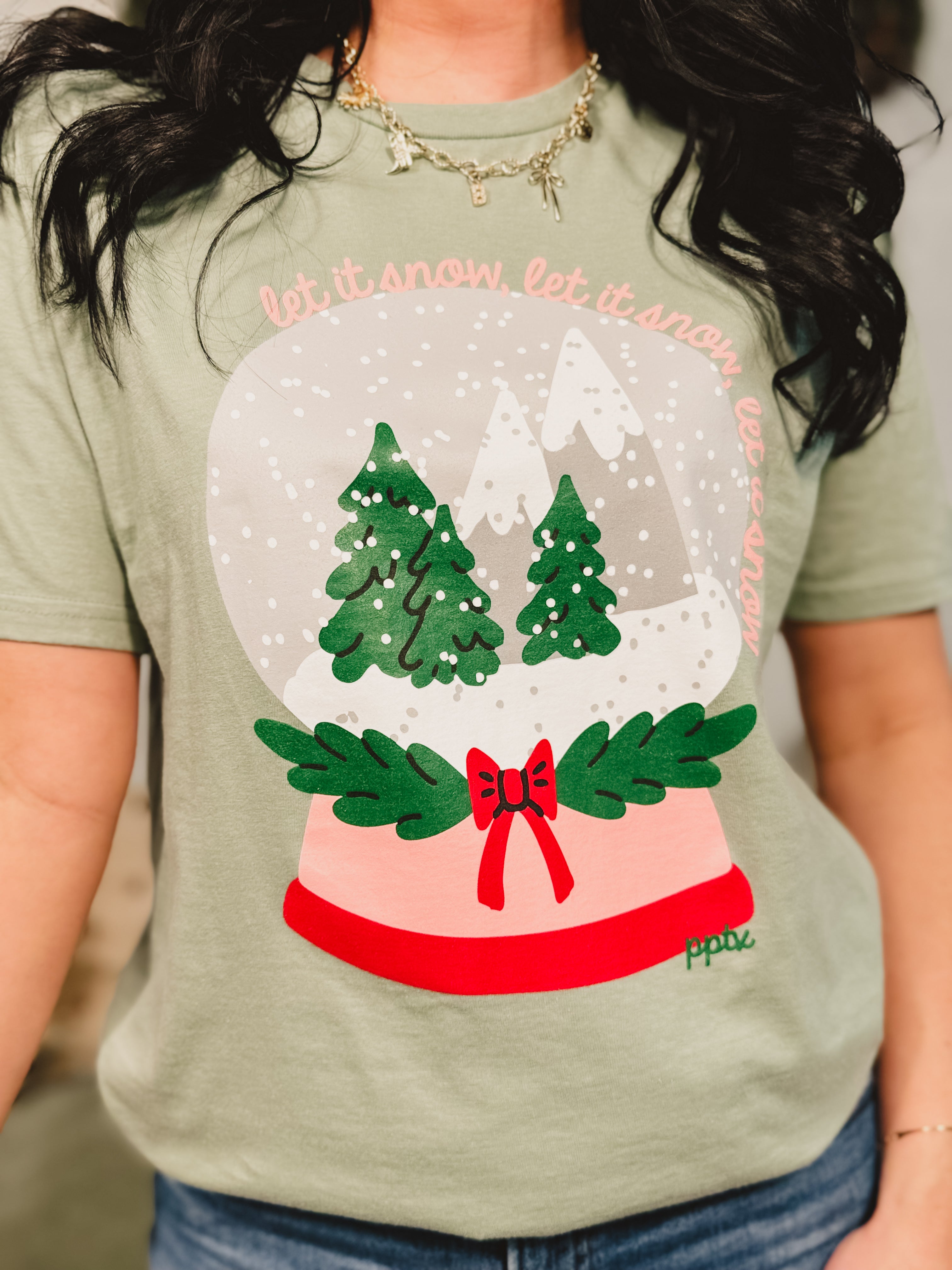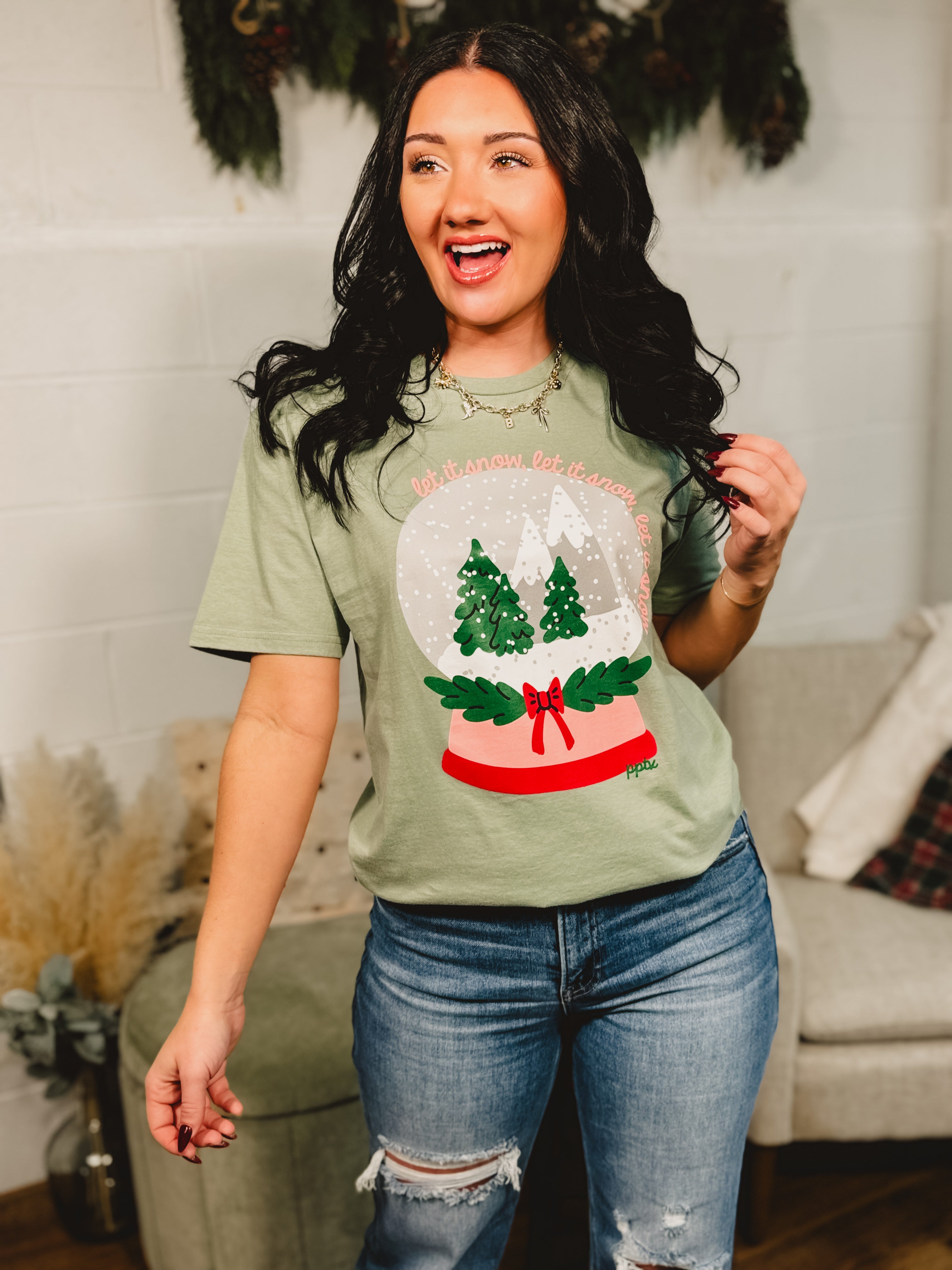 - Sage short-sleeve tee with a “Let It Snow” snow globe graphic