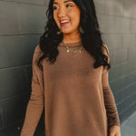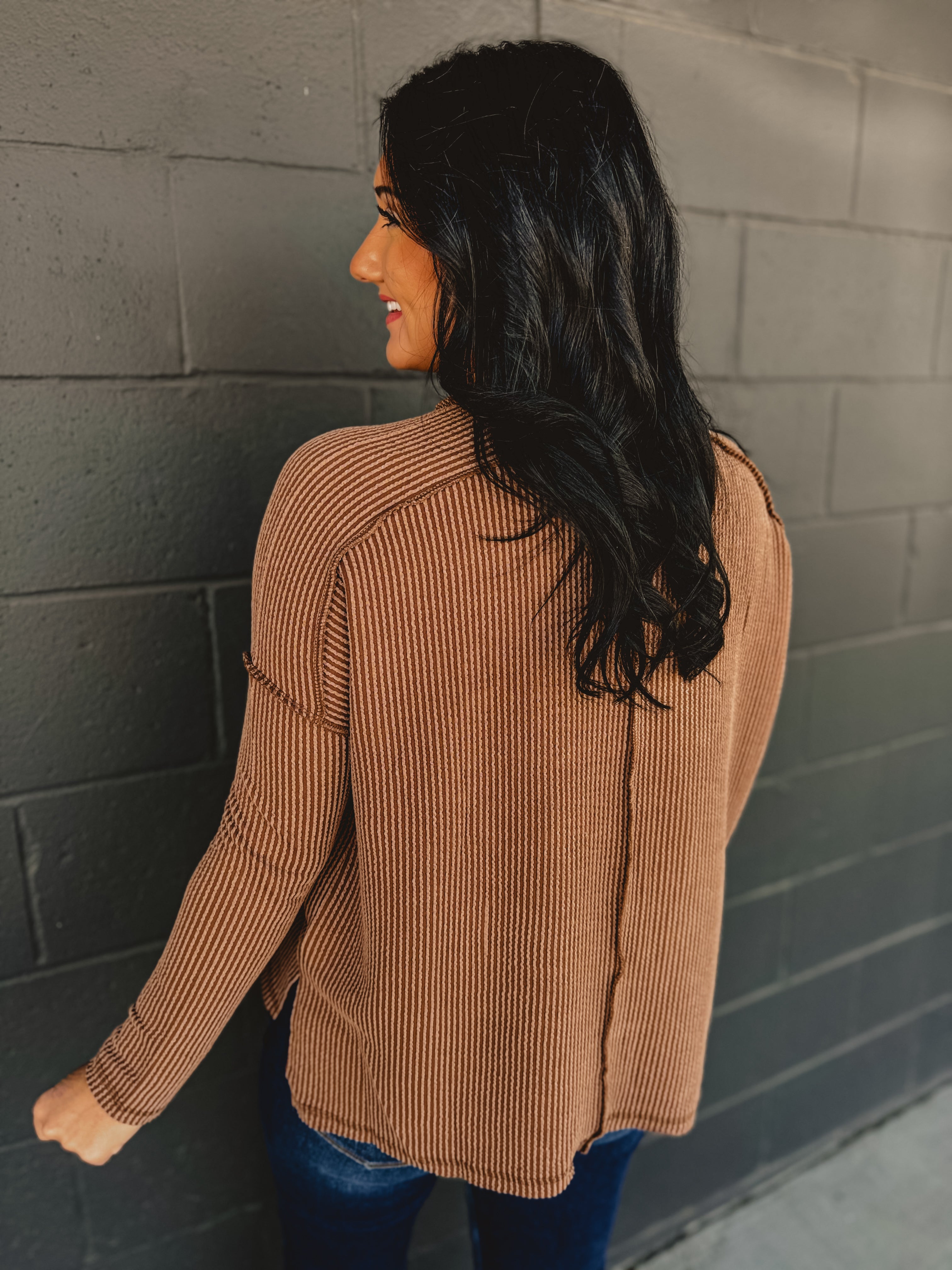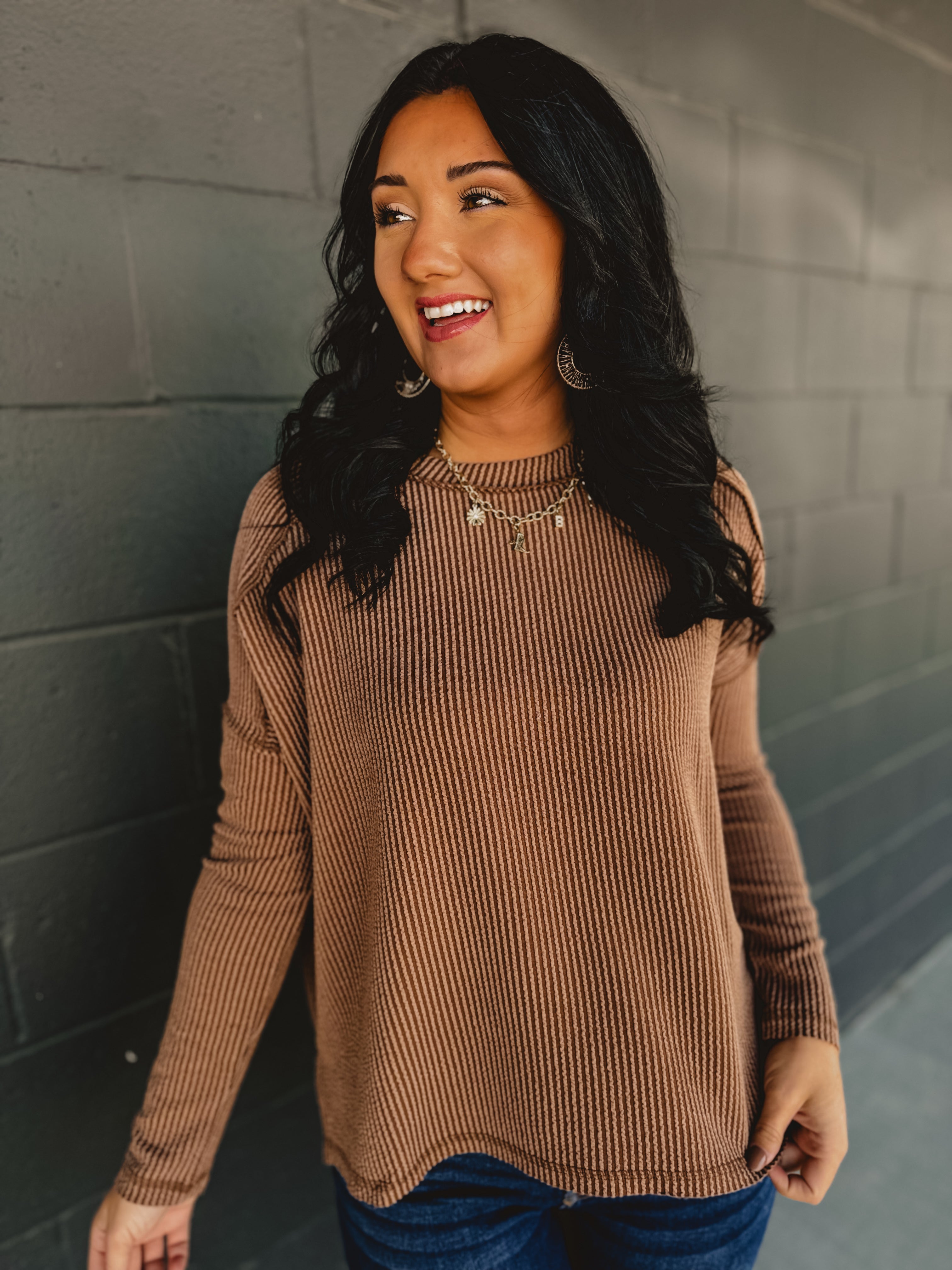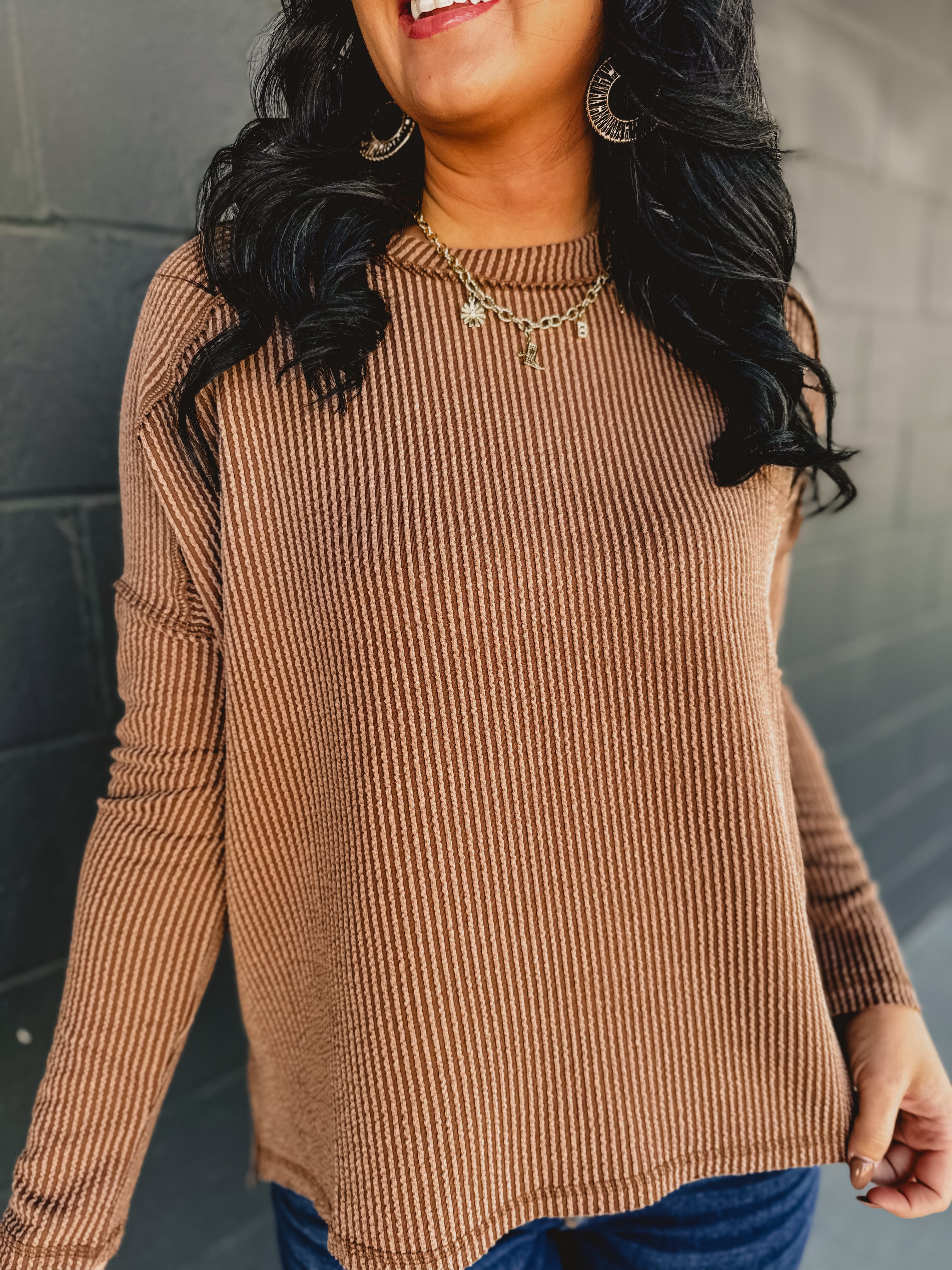 Simple yet stylish, this brown ribbed long sleeve top features raw edge detailing for a casual, lived-in look that’s perfect for everyday wear.