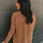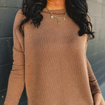 Ribbed Raw Edge Long Sleeve Top - Brown
