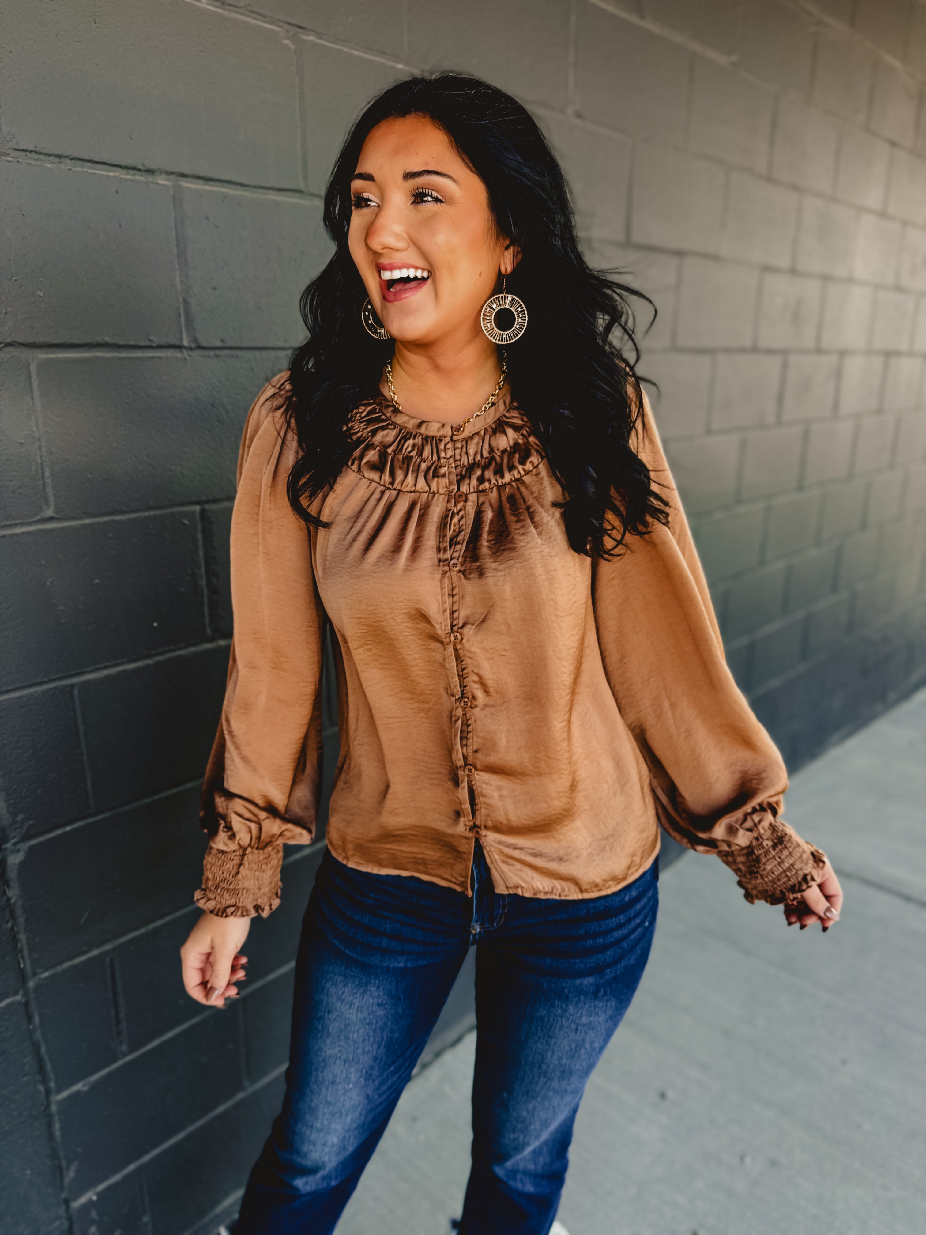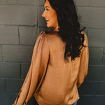Satin Puff Sleeve Button Up Blouse - Mocha Mousse