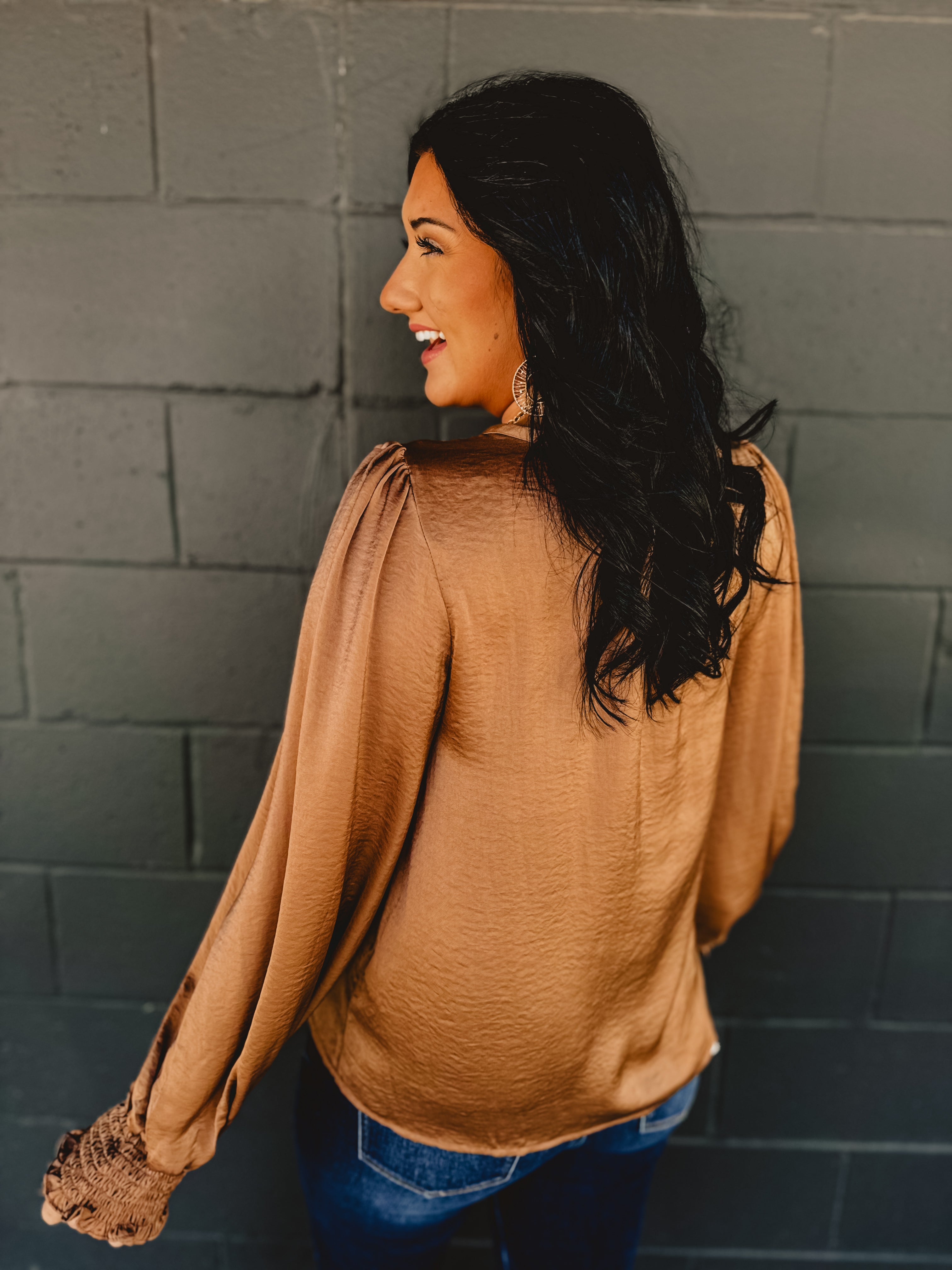 Elegant and polished, this mocha mousse satin blouse features puff sleeves and a button-up design for a chic, sophisticated look that transitions seamlessly from day to night.