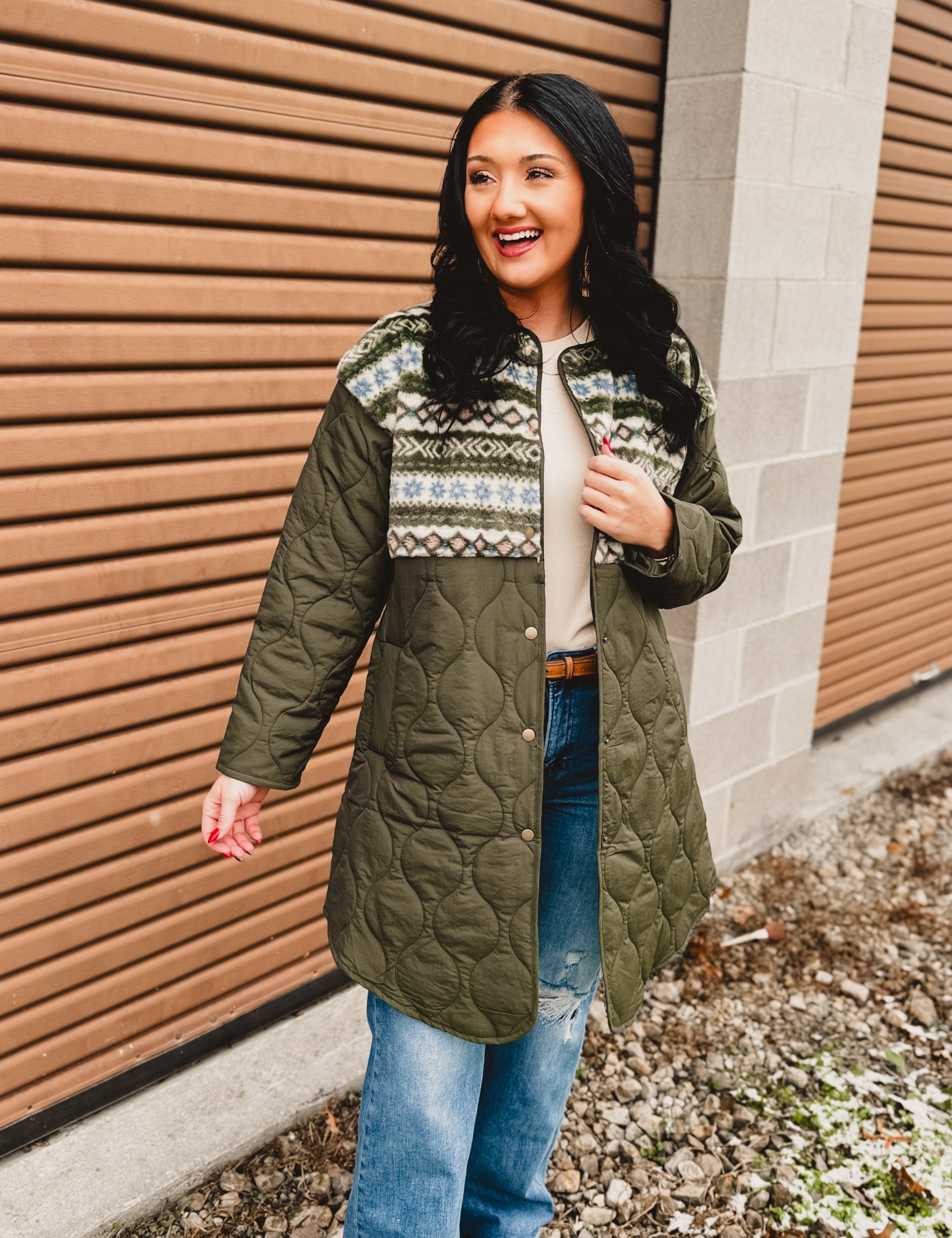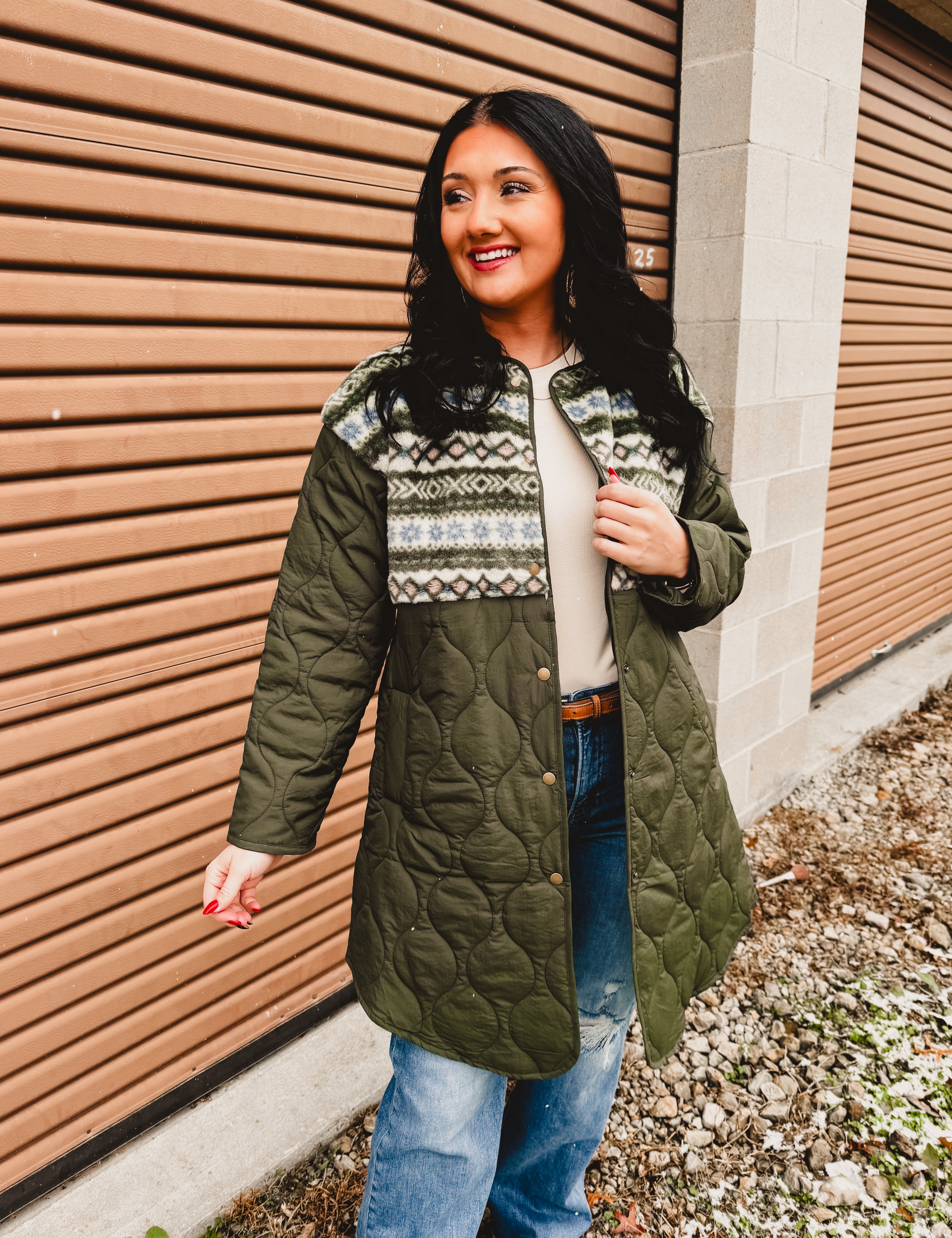 Sherpa Detail Quilted Long Puffer Coat - Olive