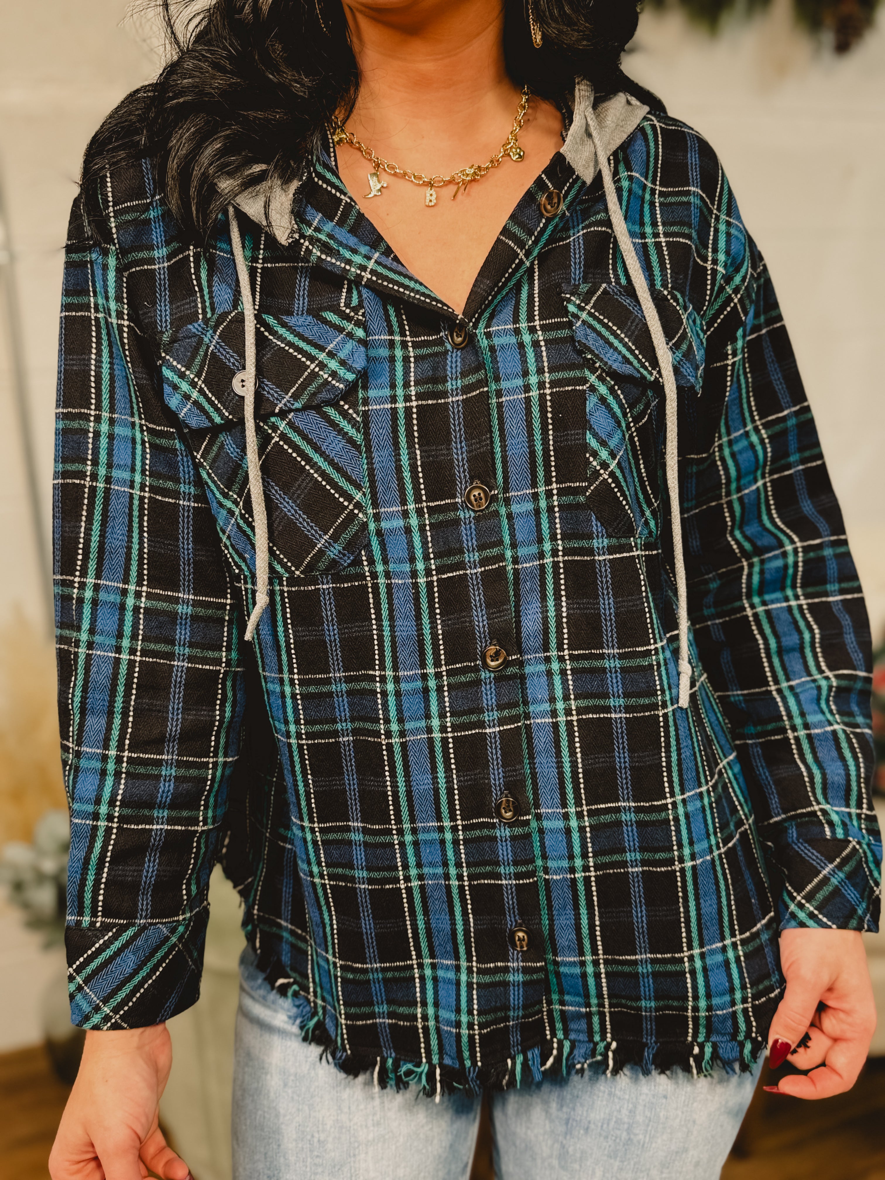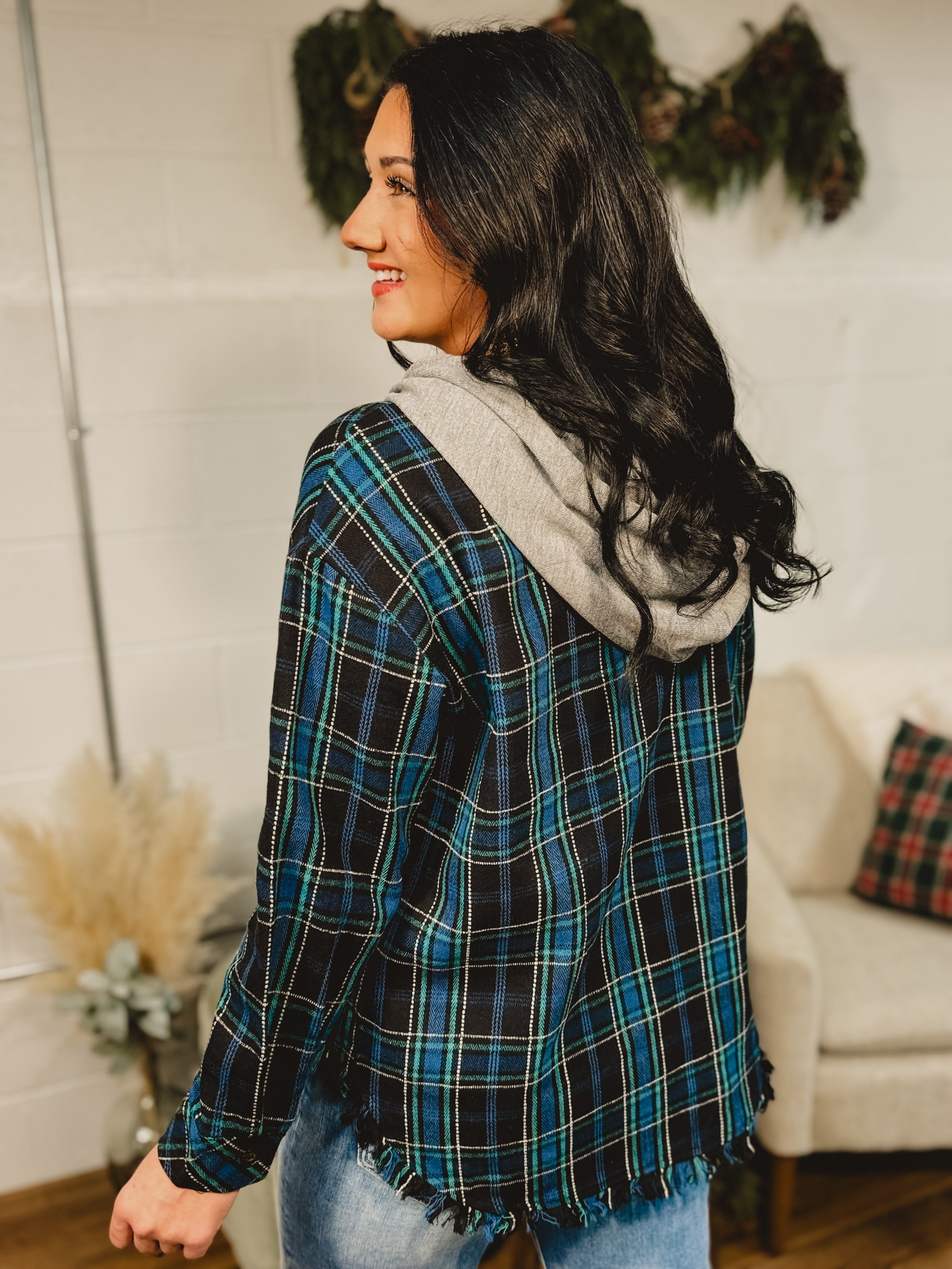 Cozy, casual, and perfectly rugged — this hooded plaid jacket brings easy layering with its soft fabric, frayed detailing, and relaxed fit. Designed for everyday wear, it blends the comfort of a hoodie with the structure of a button-up for the ultimate cool-weather staple.
