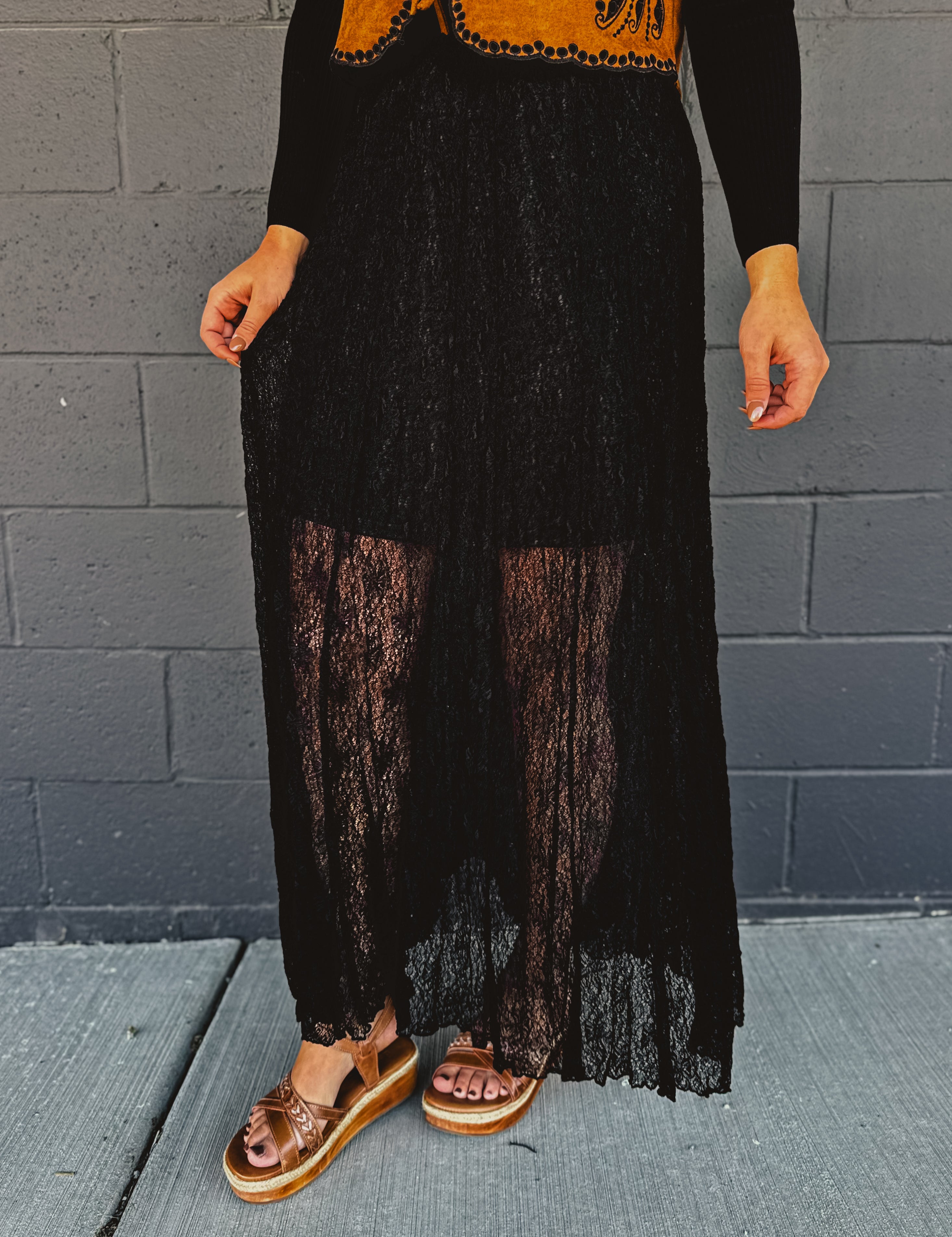 Knitted Lace Godet Maxi Skirt - Black
