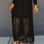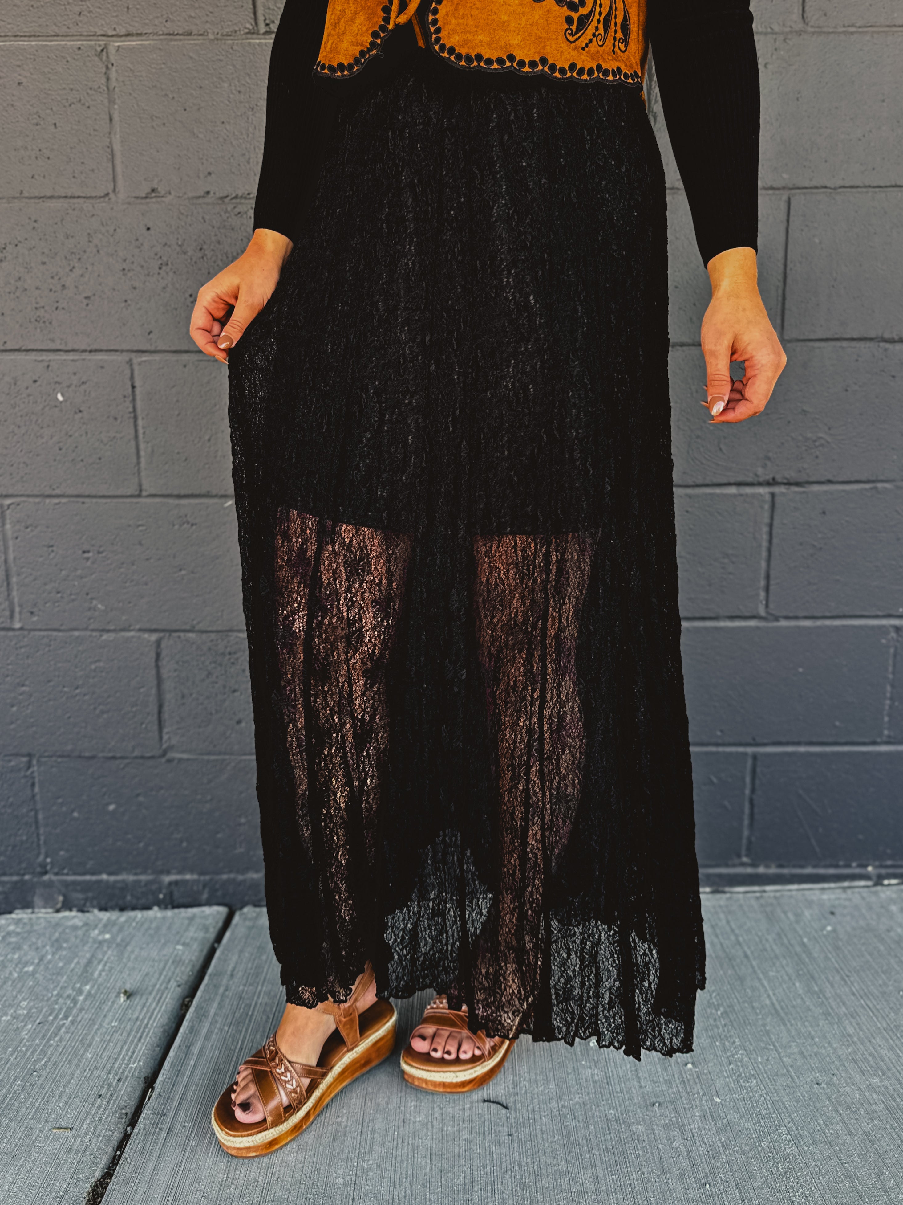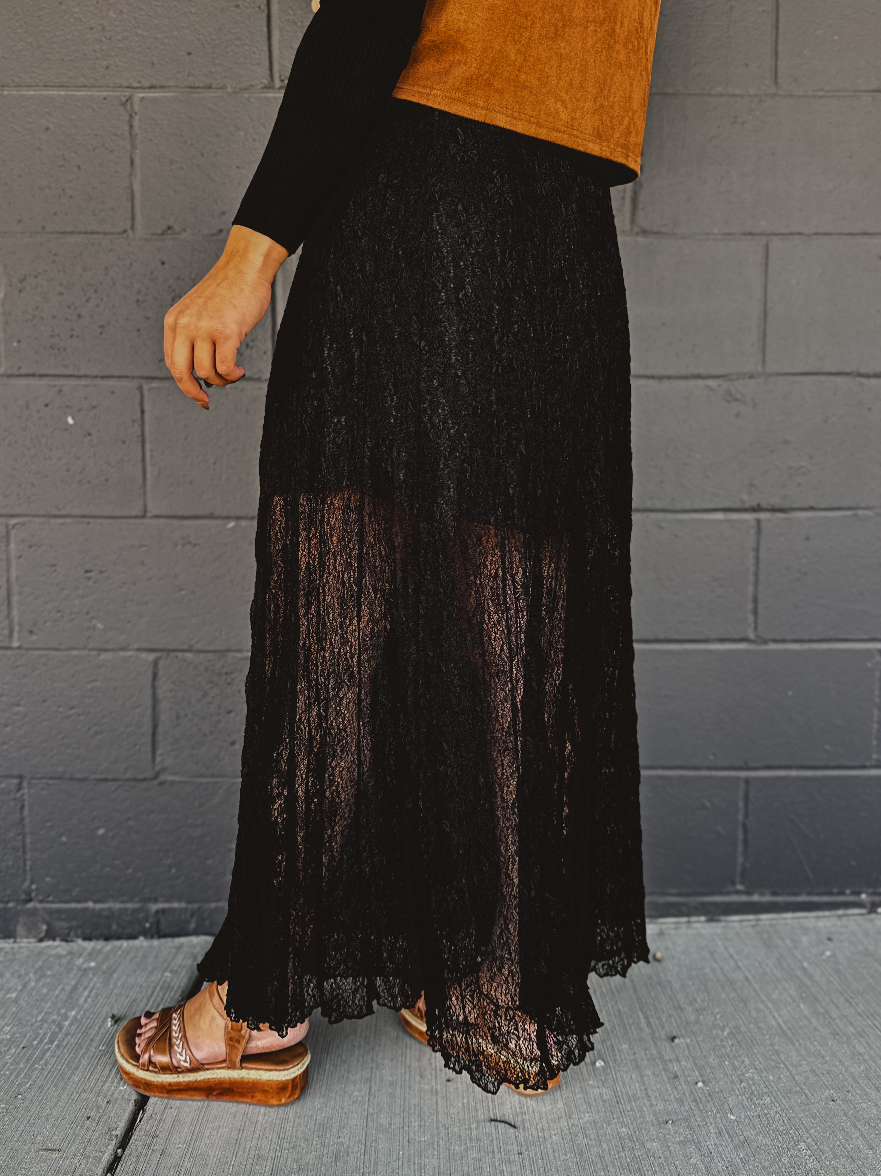 Elegant and romantic, this black knitted lace maxi skirt features delicate godet panels that create beautiful movement and flow with every step!