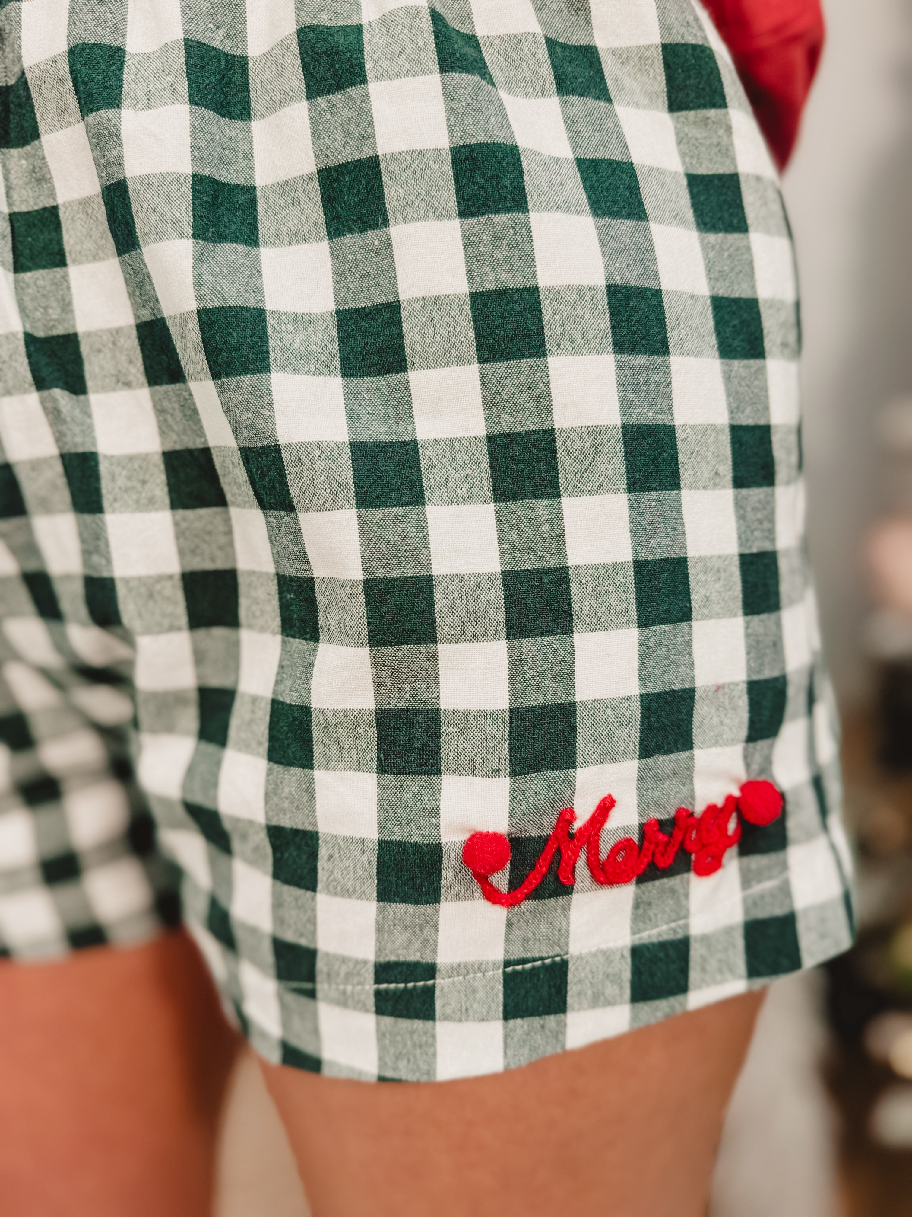 Festive and fun, these hunter green gingham boxer shorts feature playful pom pom detail and pair perfectly with your favorite holiday graphic tee for a cozy seasonal look!