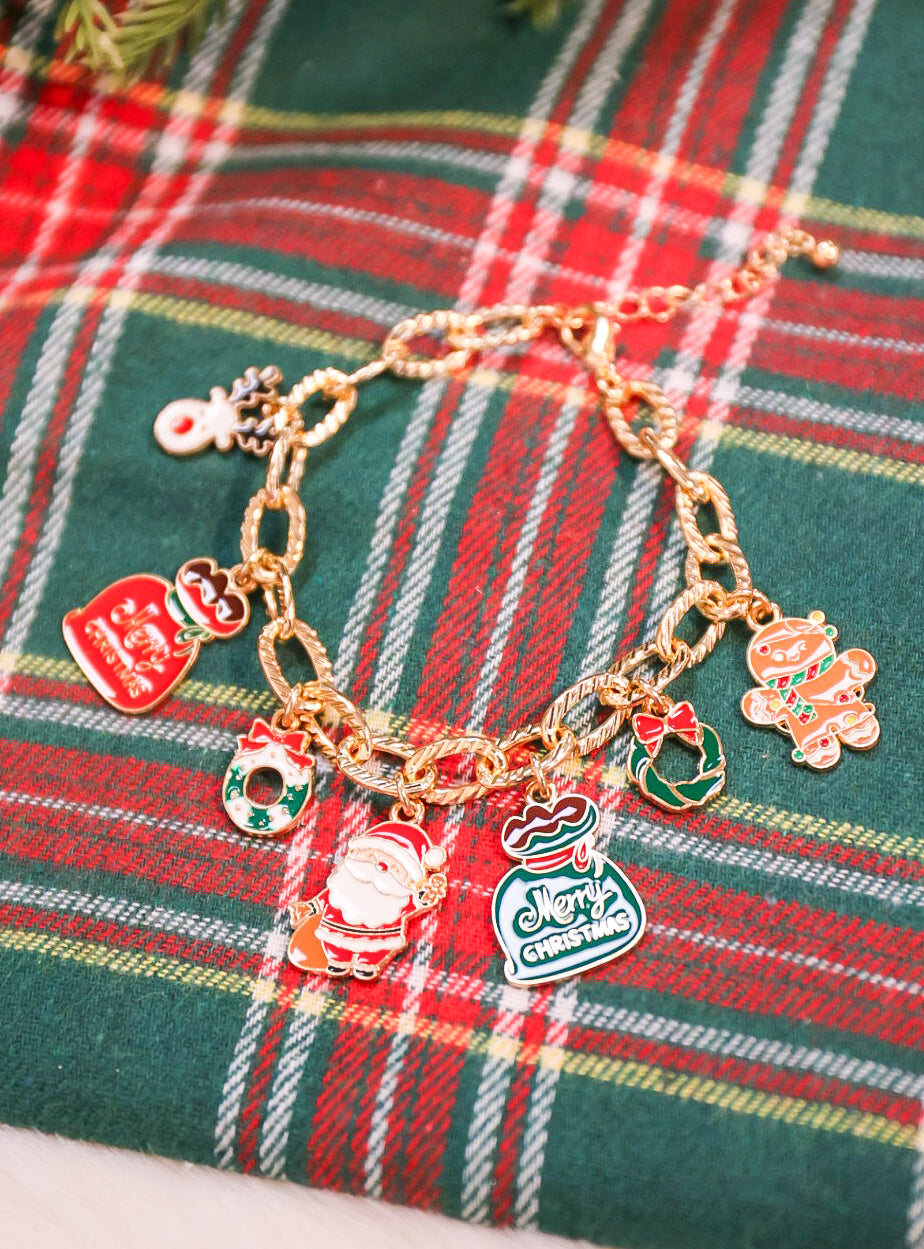 Deck your wrist with festive cheer with this textured chain link bracelet, adorned with playful Christmas charms for a merry and sparkling seasonal touch!