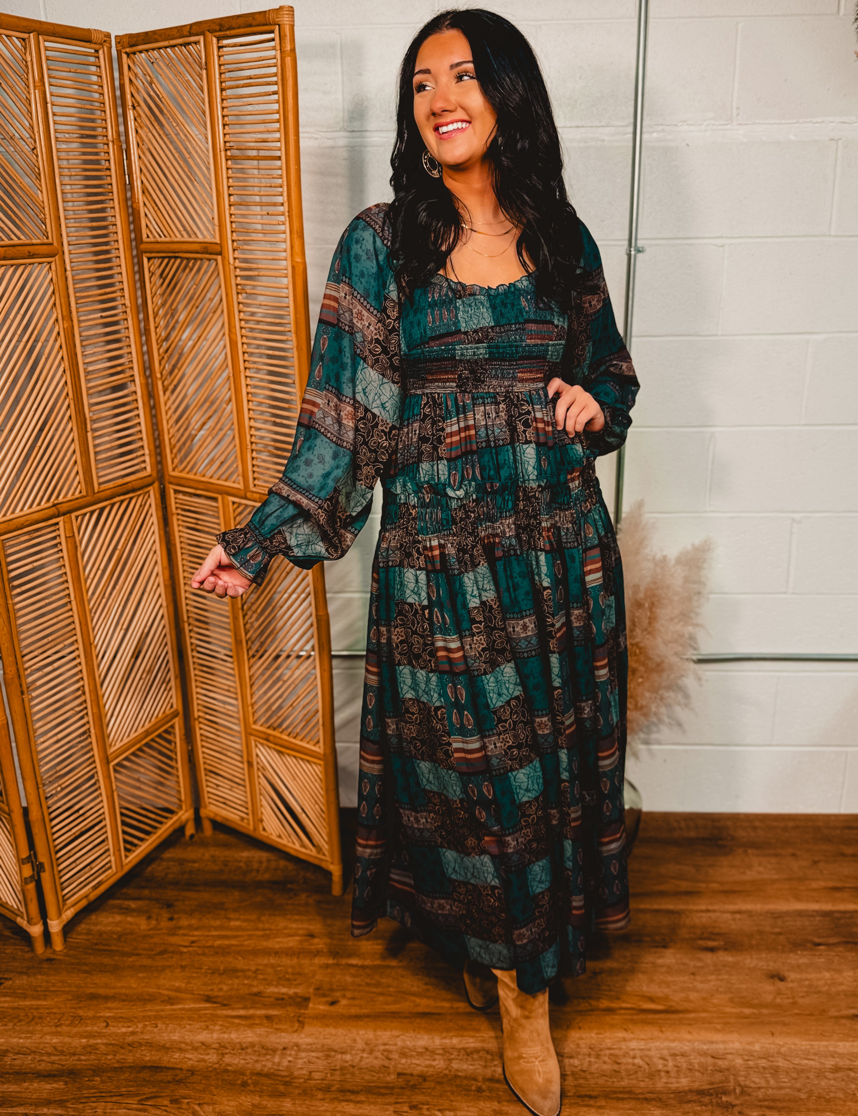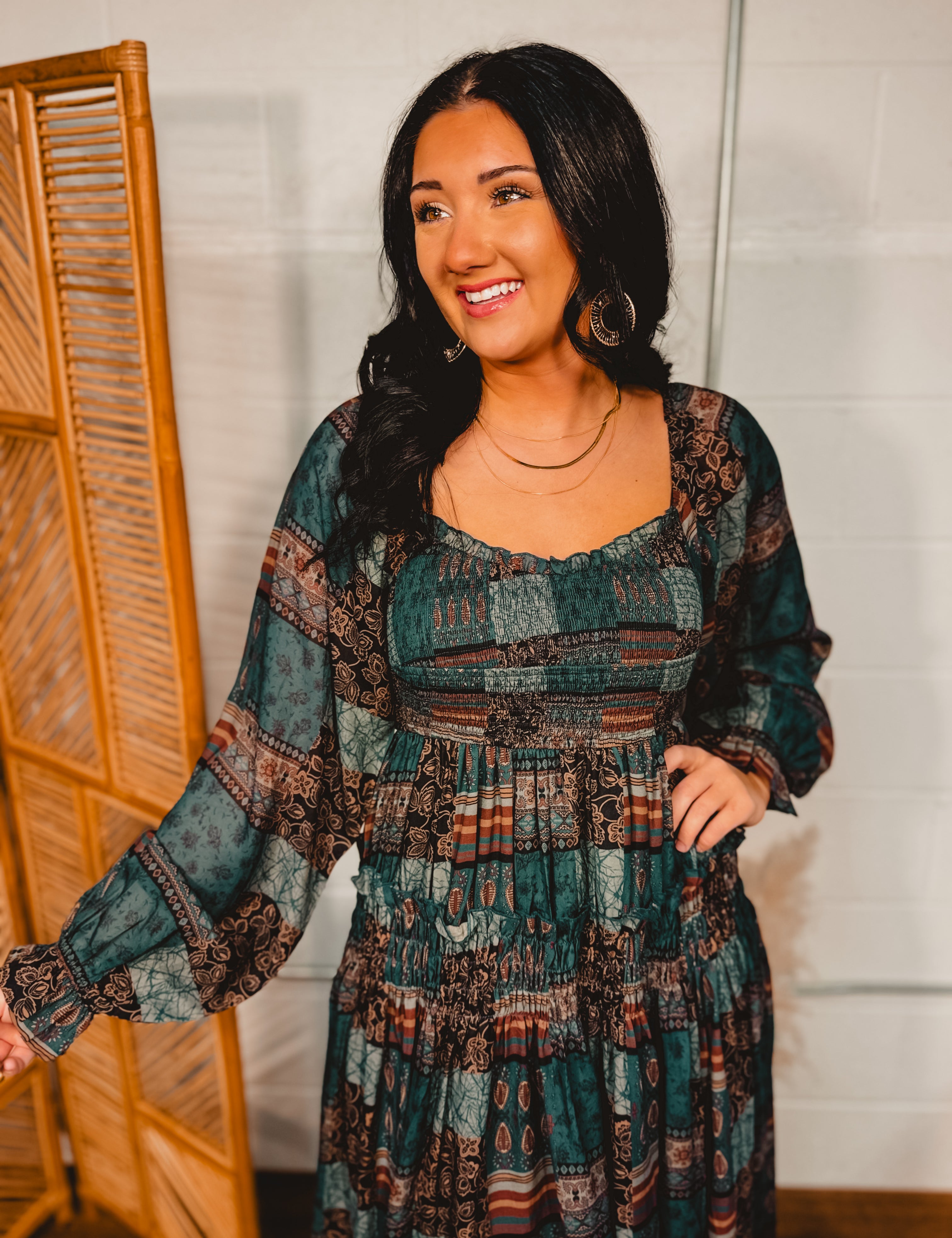 Smocked Long Sleeve Floral Maxi Dress - Forest Green