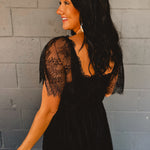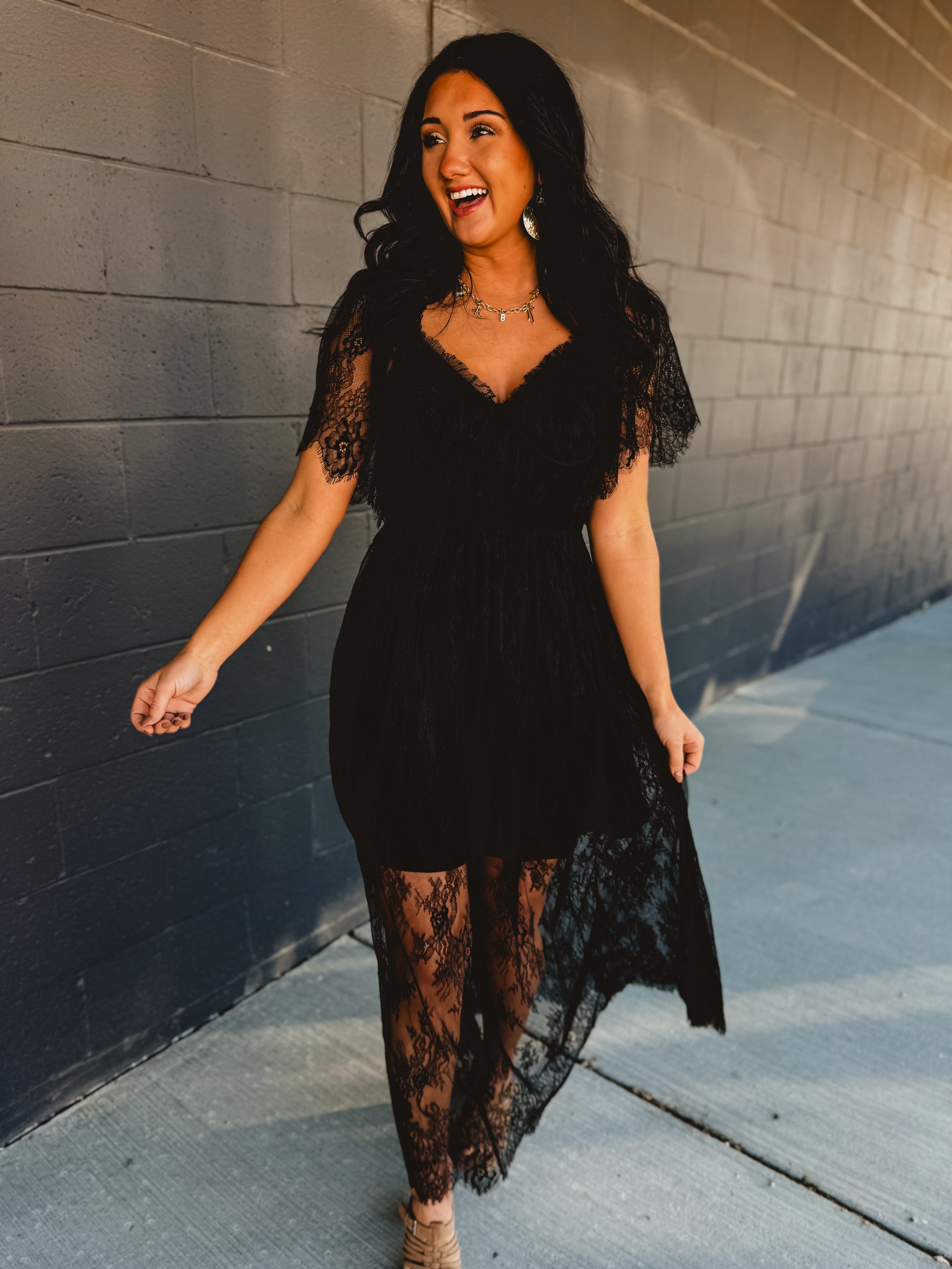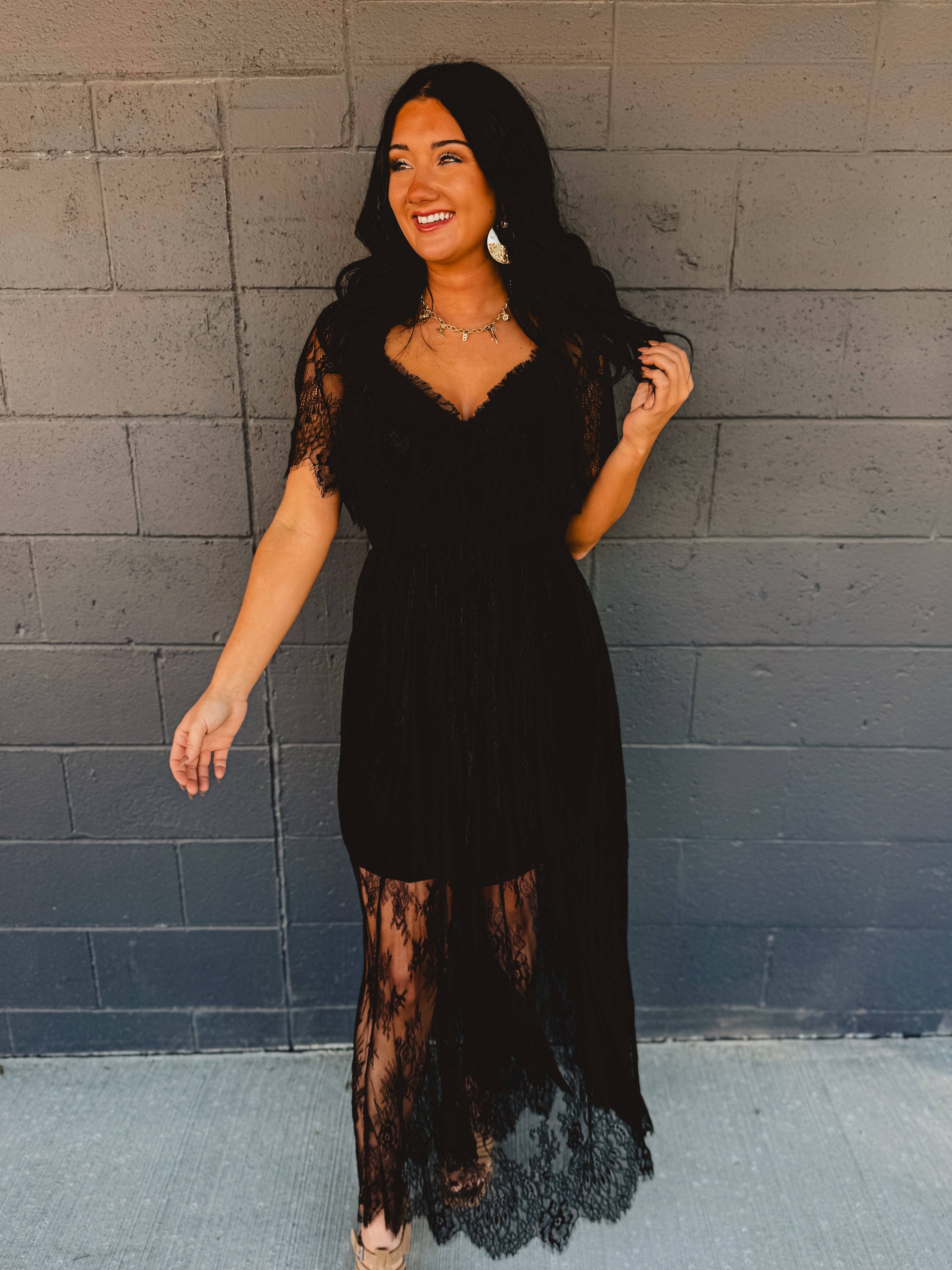 Timeless and romantic, this black maxi dress features an intricate floral lace overlay that adds elegant texture and sophistication to any special occasion.