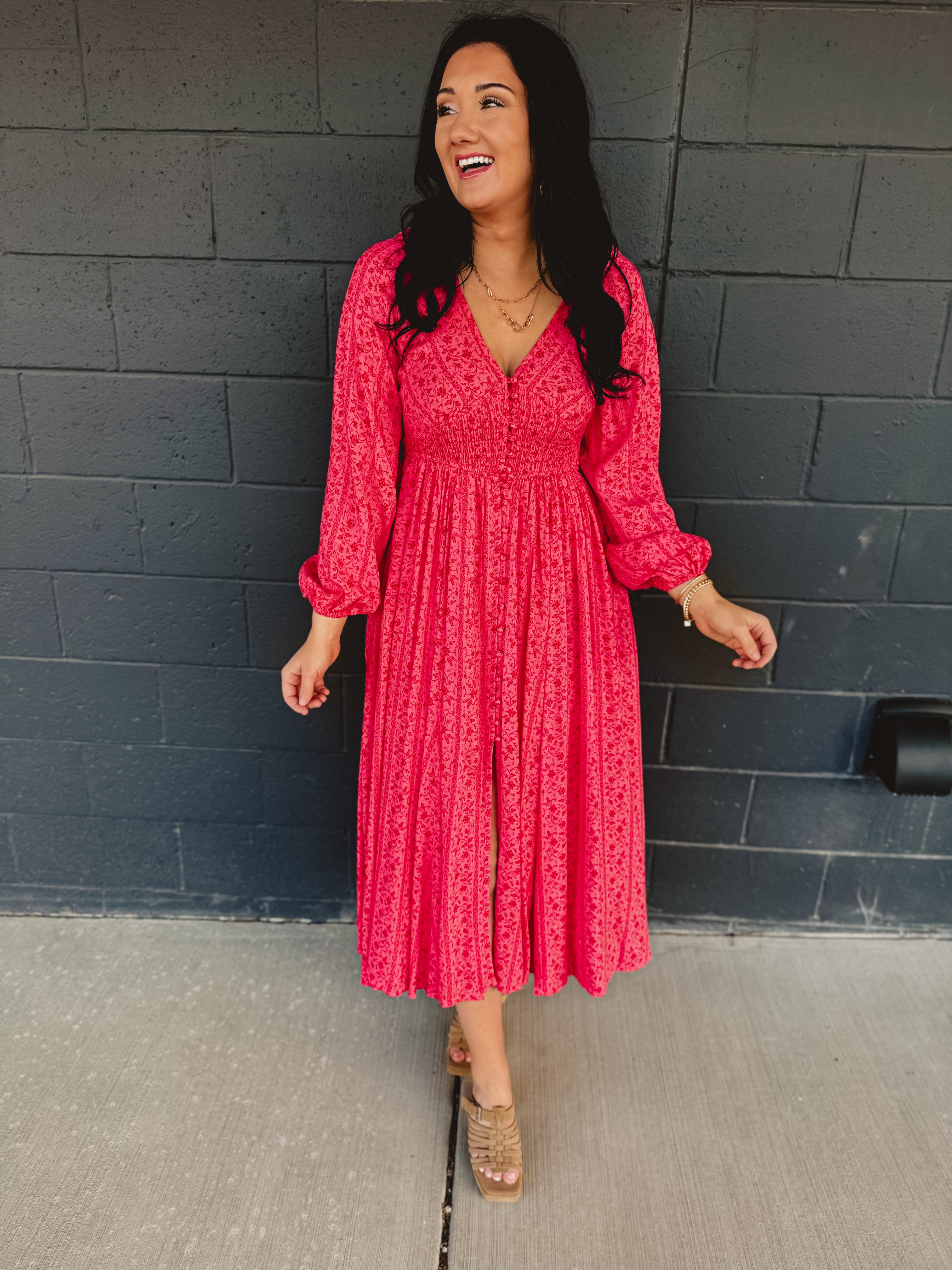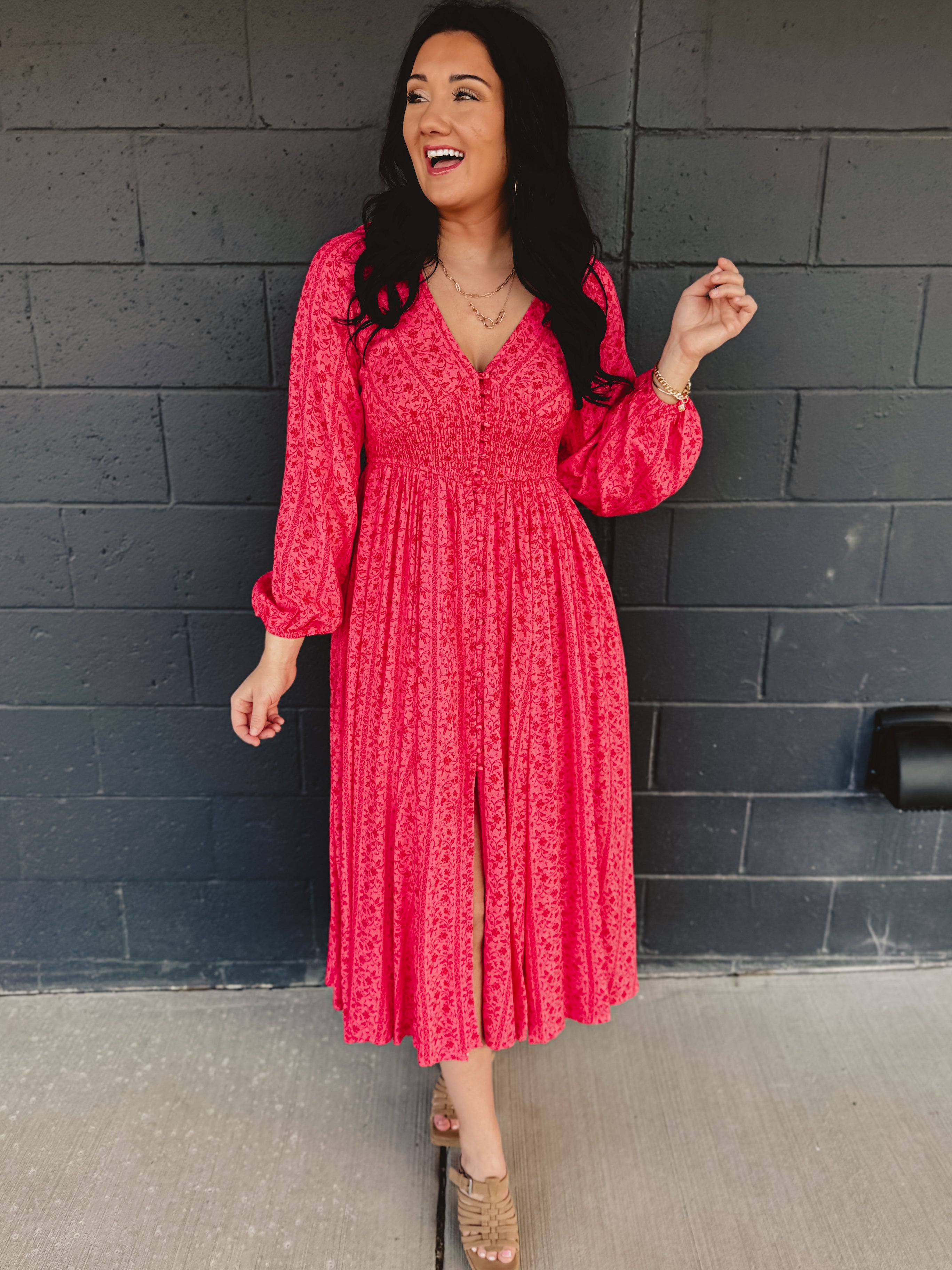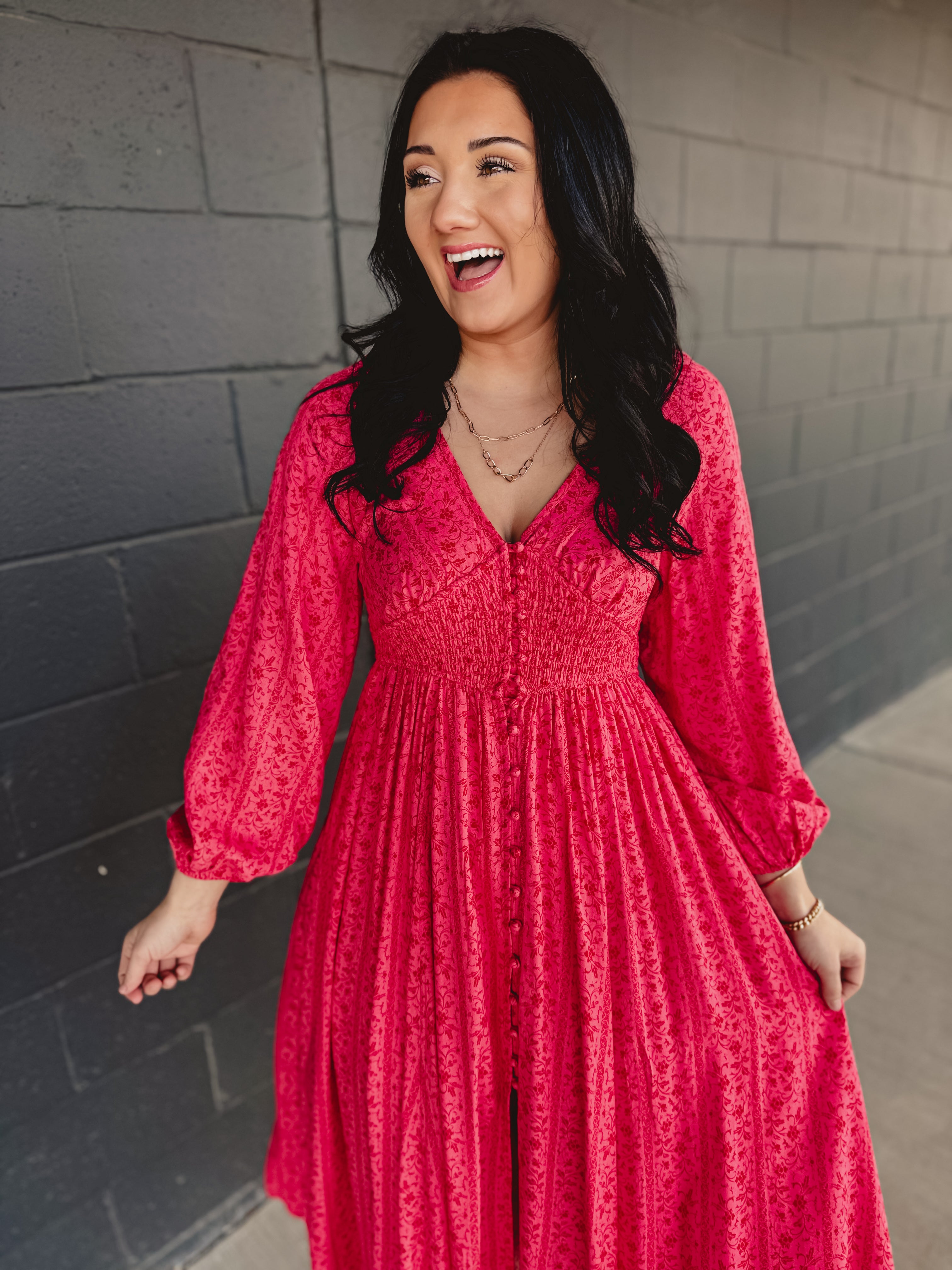 Smocked Button Down Long Sleeve Maxi Dress - Cherry Tomato