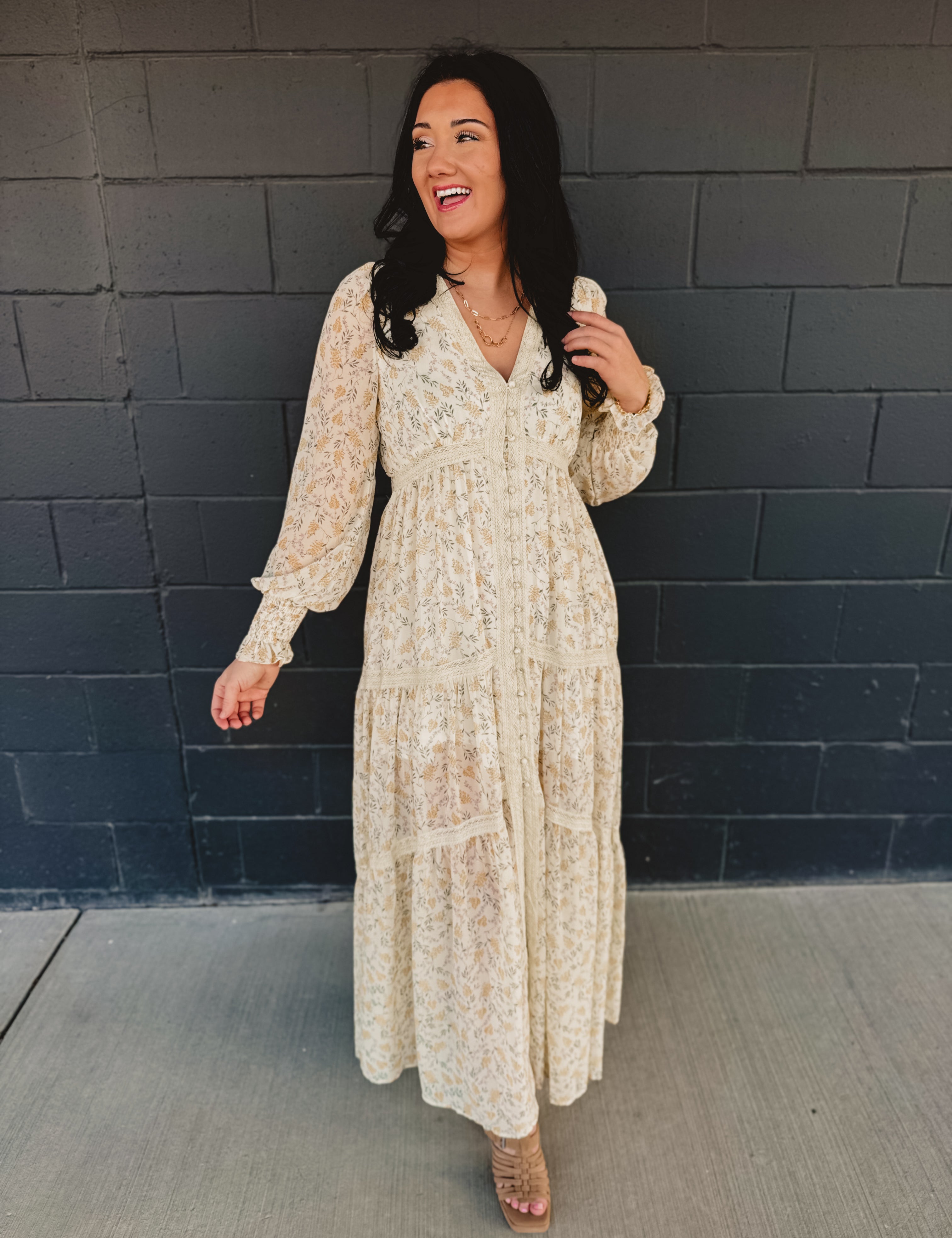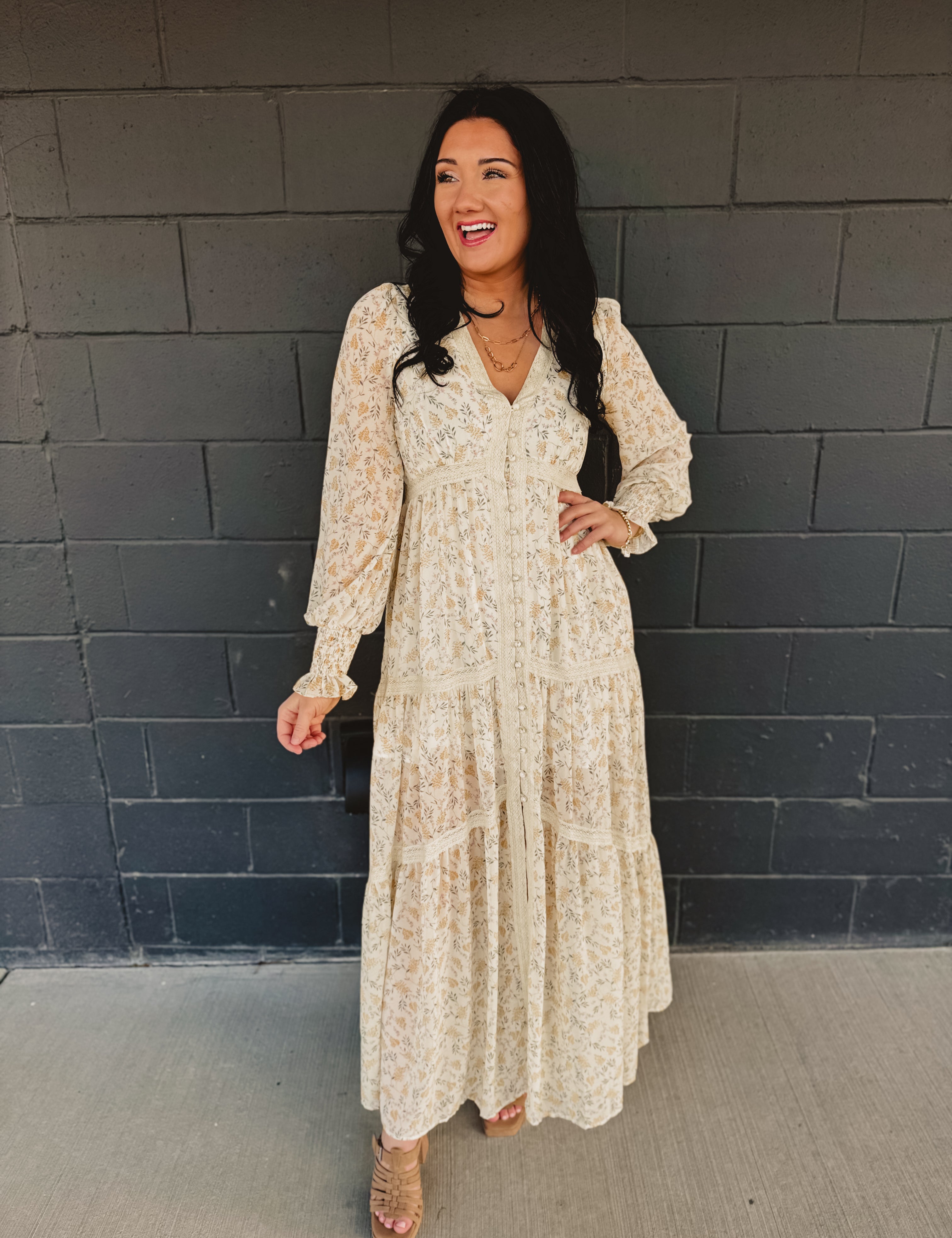 Lace Trim Button Down Long Sleeve Maxi Dress - Daffodil