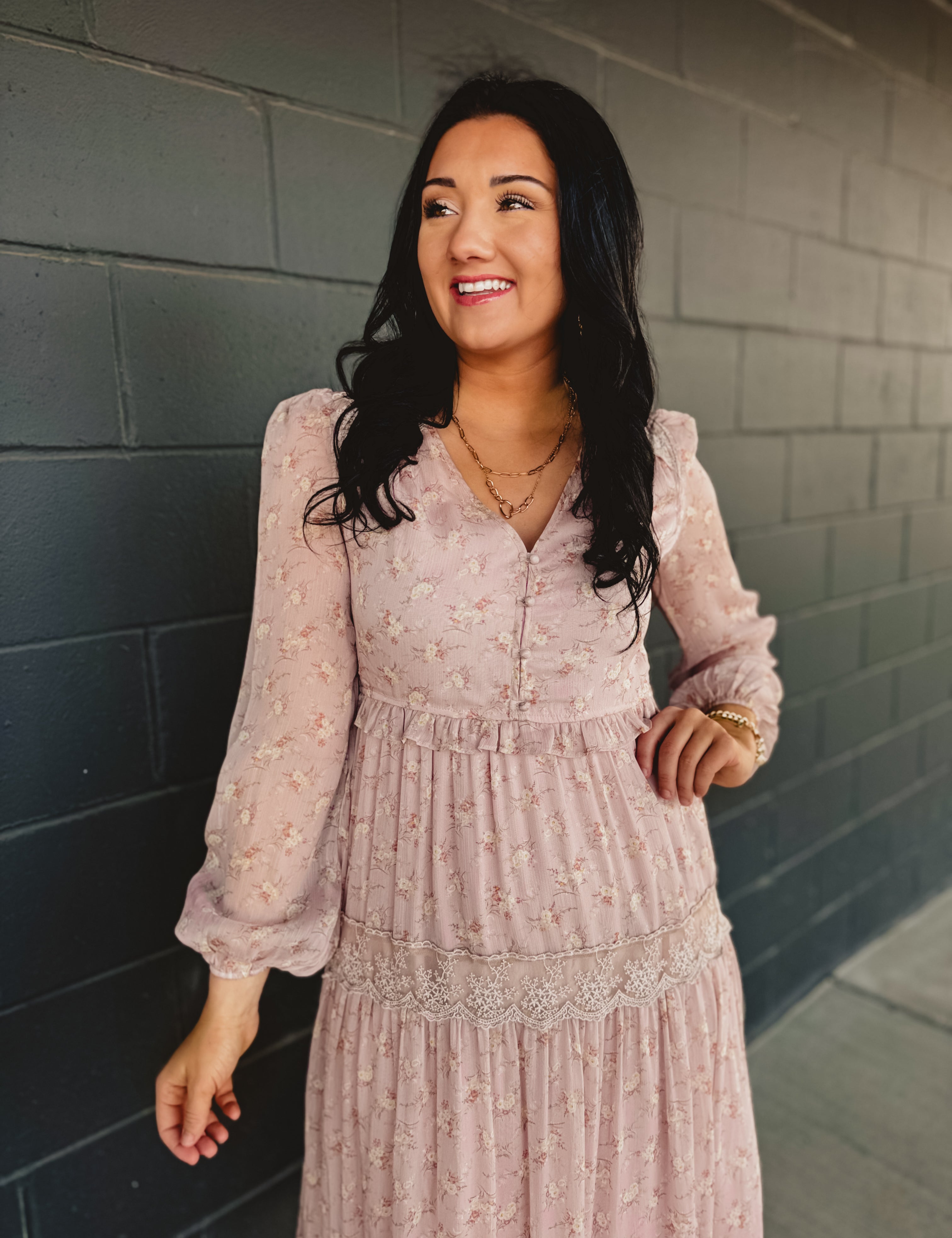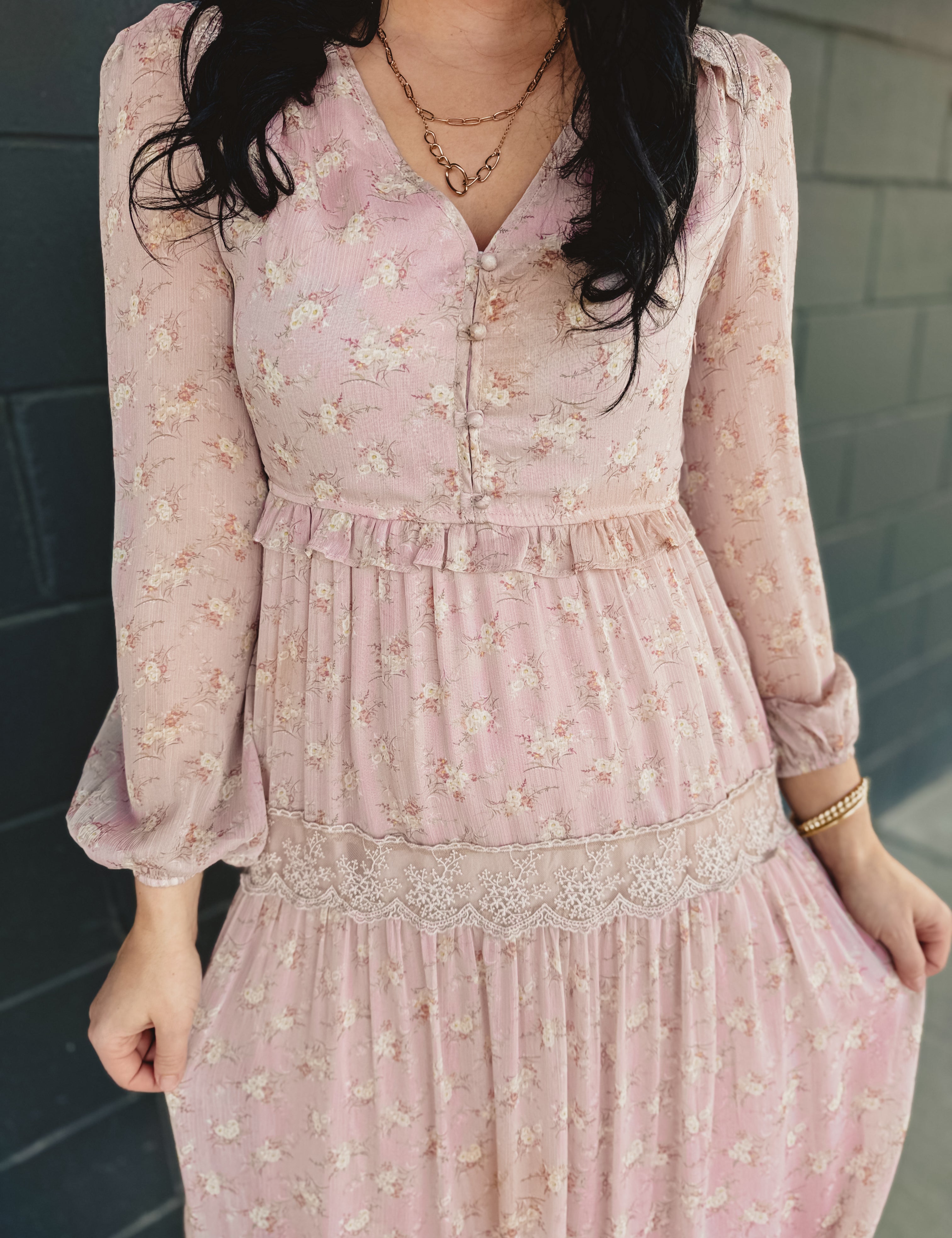 Floral Lace Tiered Long Sleeve Maxi Dress - Pastel Pink